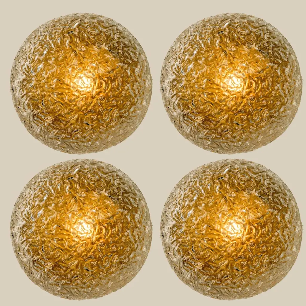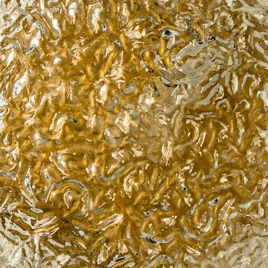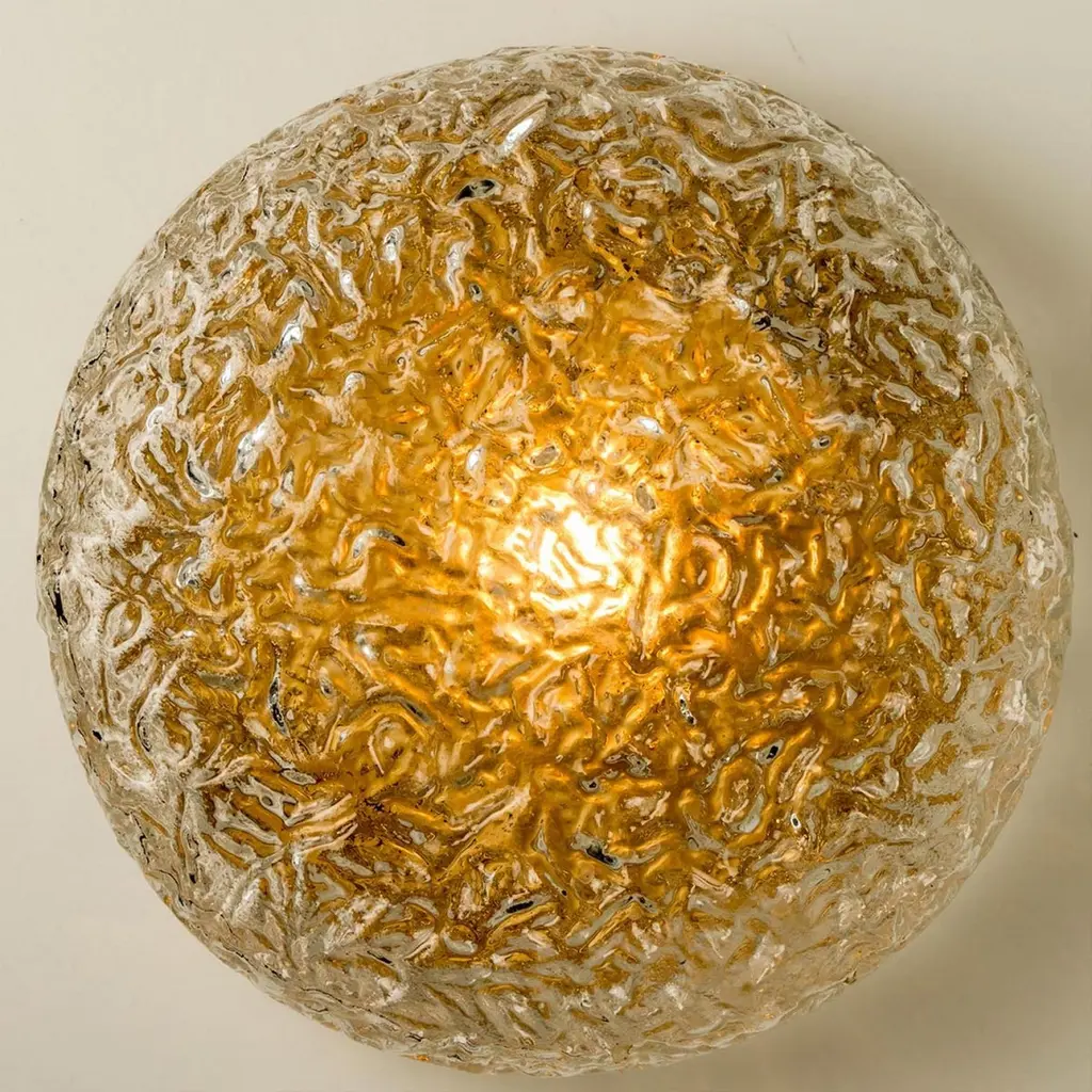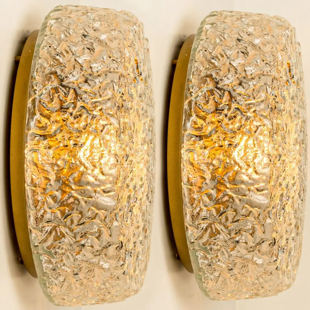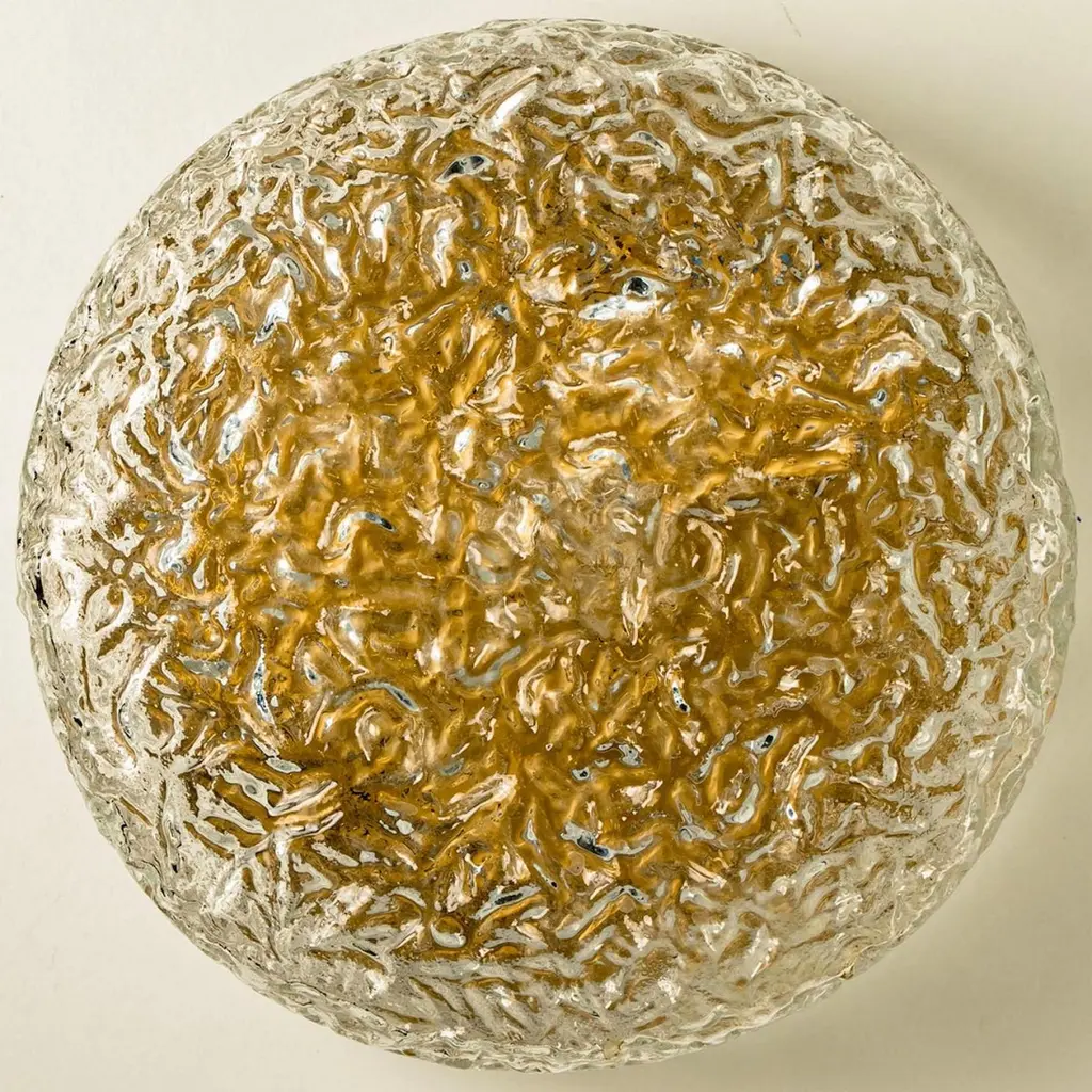 Clear colored textured glass wall light designed in the style of Glashütte Limburg around 1960-1970 in Europe, Germany. The rich textured glass gives a wonderful glow. There are multiple similarly designed lights available, please check the website for more information.Can be used as wall lights or flush mounts. The glass is mounted on a brass colored back plate.Please notice the price is for 1 piece, large quantity available.Cleaned and well-wired, in full working order and ready to use. The fixture requires 1 E27 standard bulb. Also LED compatible.