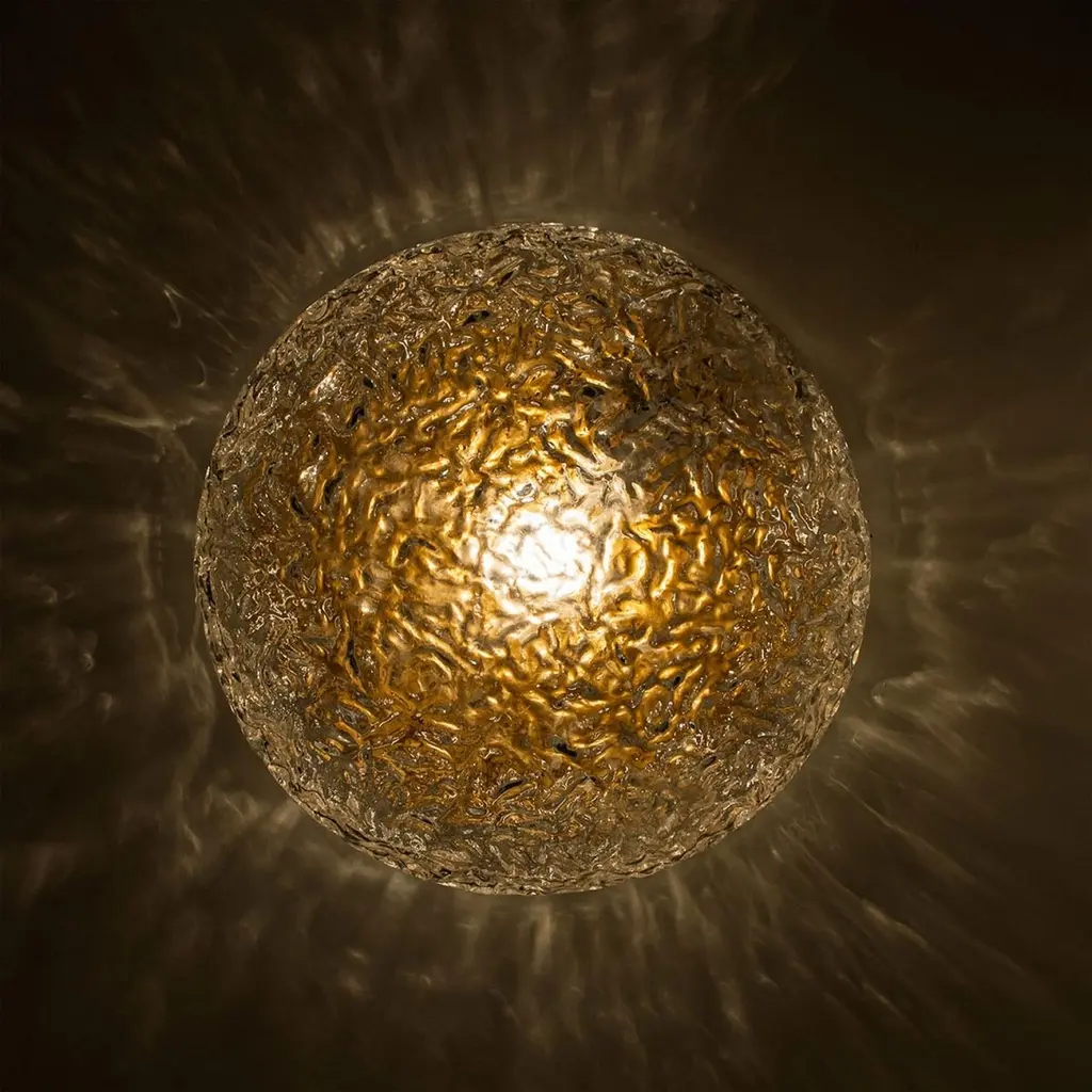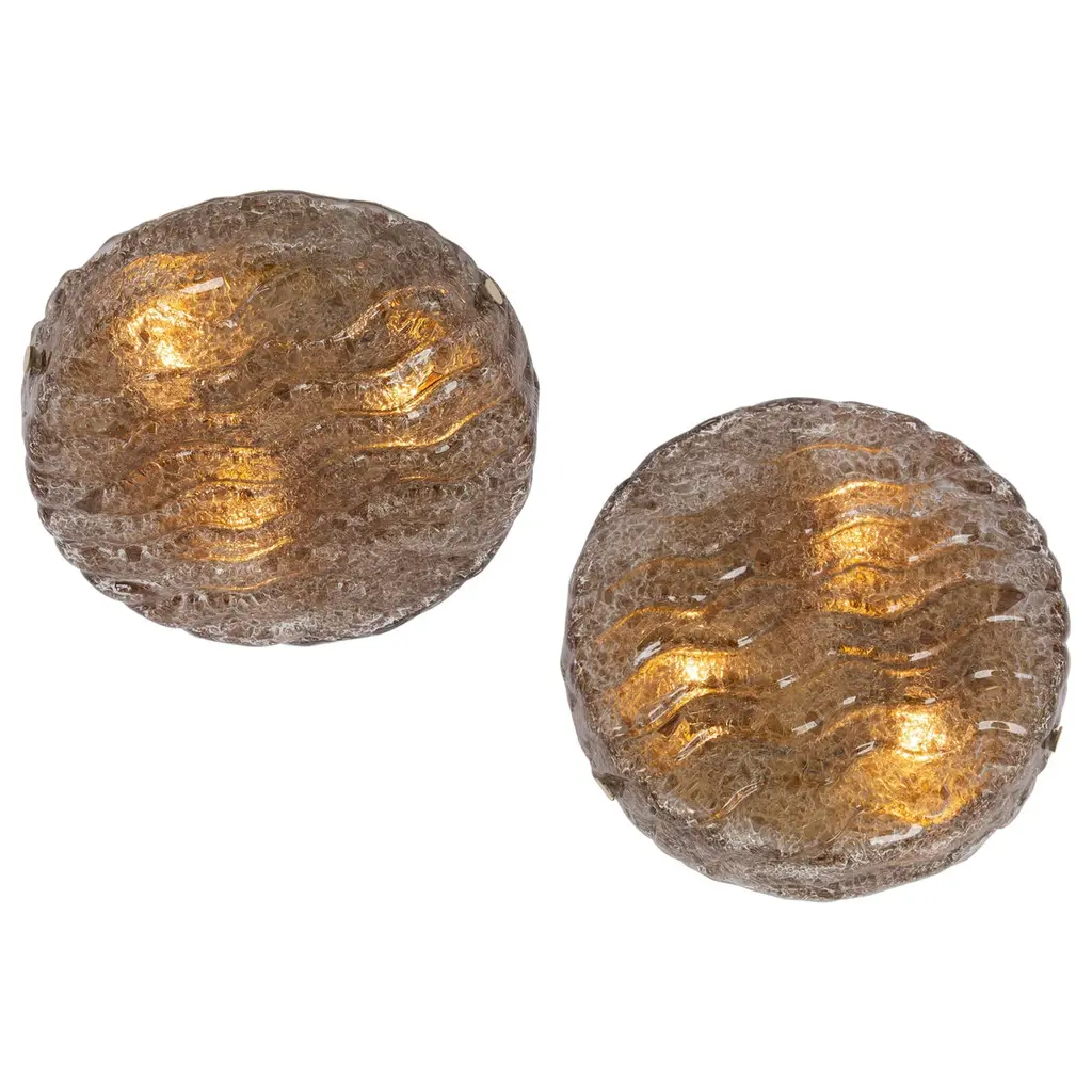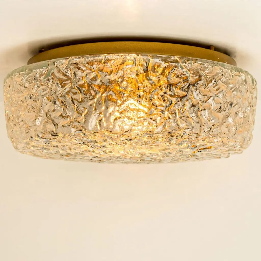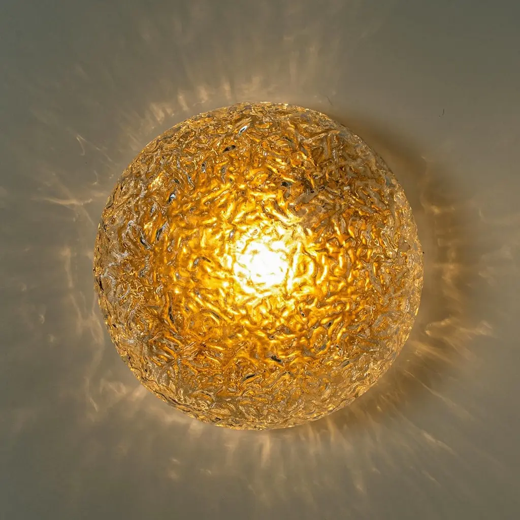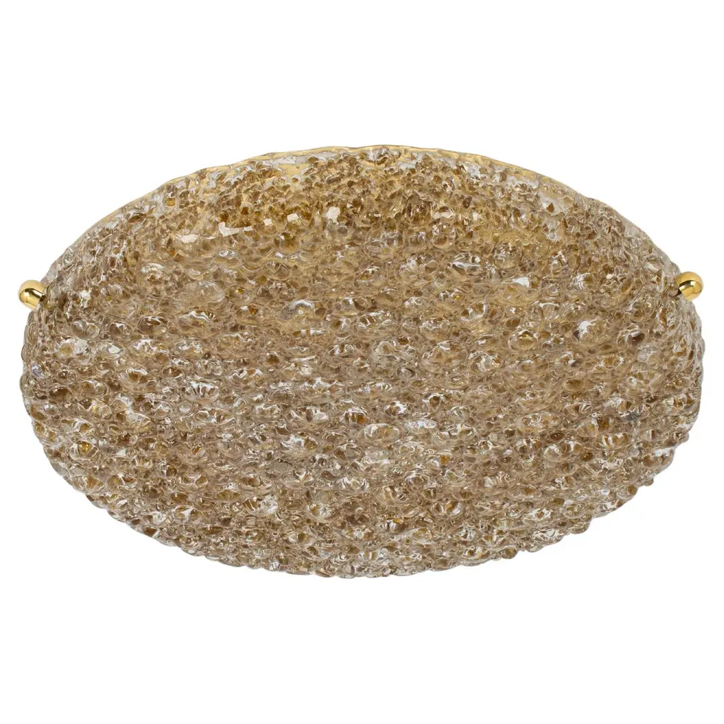 Clear colored textured glass wall light designed in the style of Glashütte Limburg around 1960-1970 in Europe, Germany. The rich textured glass gives a wonderful glow. There are multiple similarly designed lights available, please check the website for more information.Can be used as wall lights or flush mounts. The glass is mounted on a brass colored back plate.Please notice the price is for 1 piece, large quantity available.Cleaned and well-wired, in full working order and ready to use. The fixture requires 1 E27 standard bulb. Also LED compatible.