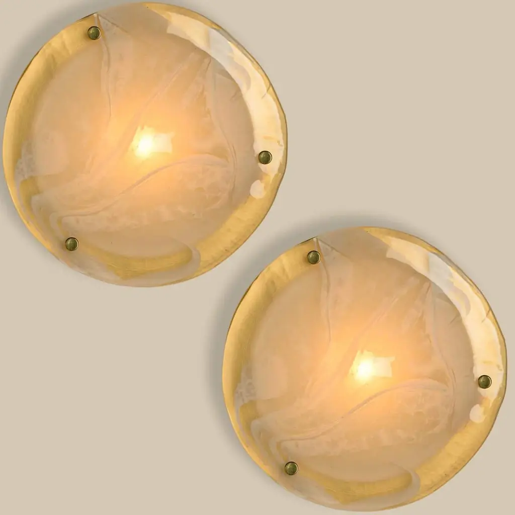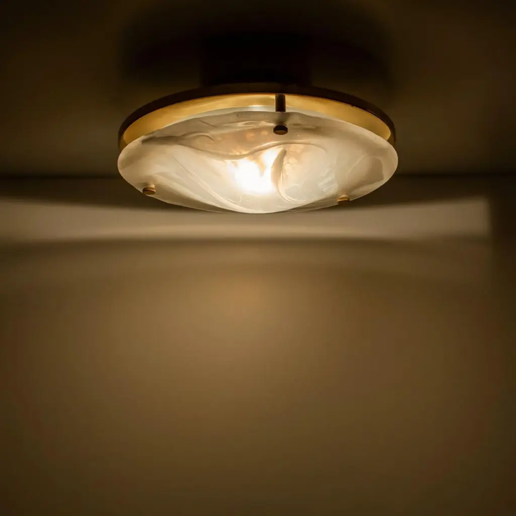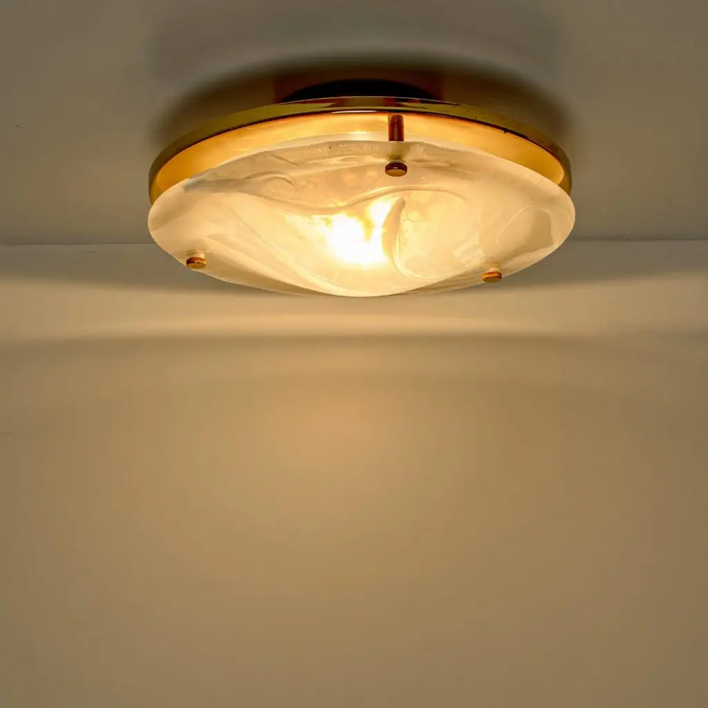 A stunning high-end brass and Murano glass flushmount manufactured in the late 1960s-early 1970s. The brass ring holds a large heavy blown glass with three brass screws. The white glass has a beautiful textured structure. Beautiful craftsmanship of the 20th century.The timeless elegance of this flush mount is sure to lend a special atmosphere in every home.Can also work as impressive wall lights.Please notice the price is for 1 piece. We have 2 pieces available. Feel free to contact us for availability.In excellent condition. Cleaned respecting the beautiful patina, well wired, in full working order and ready to use.