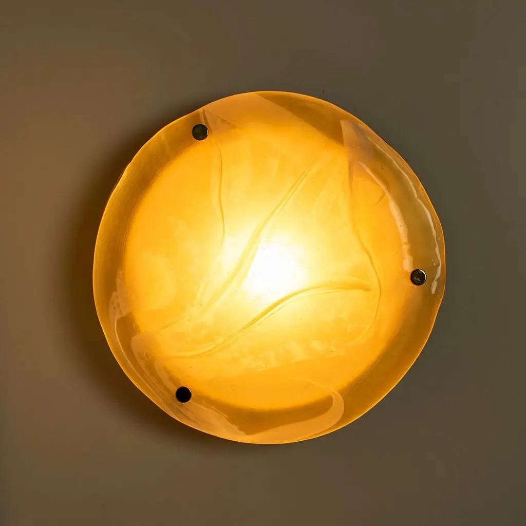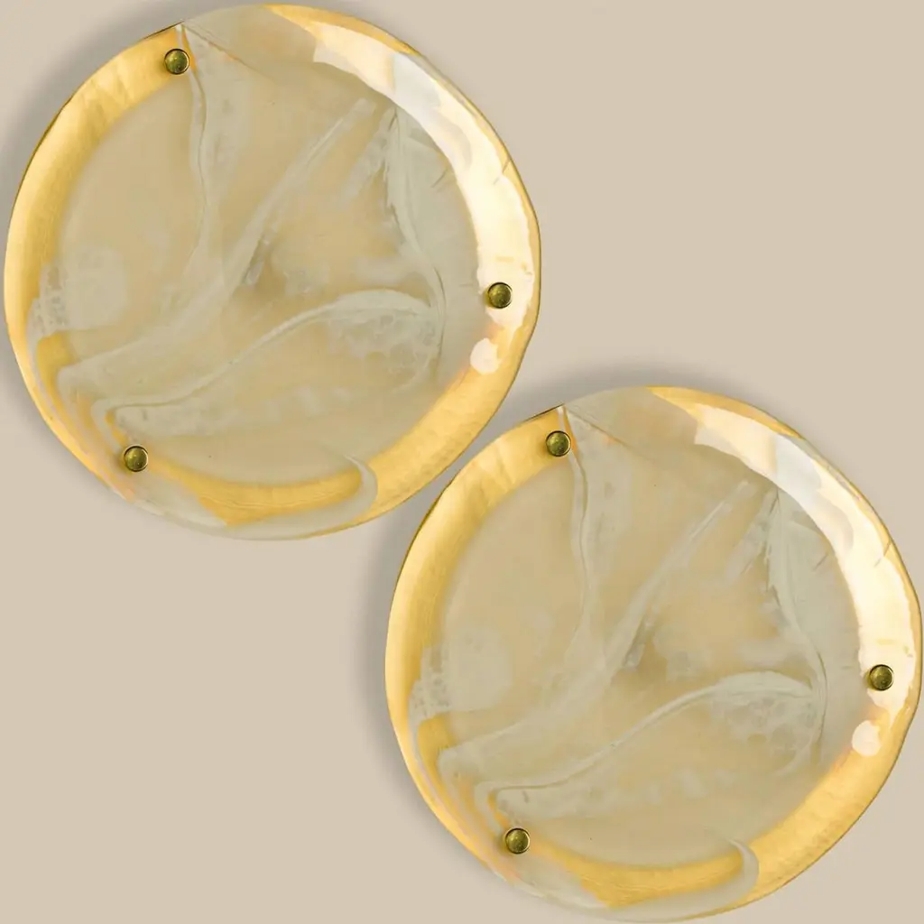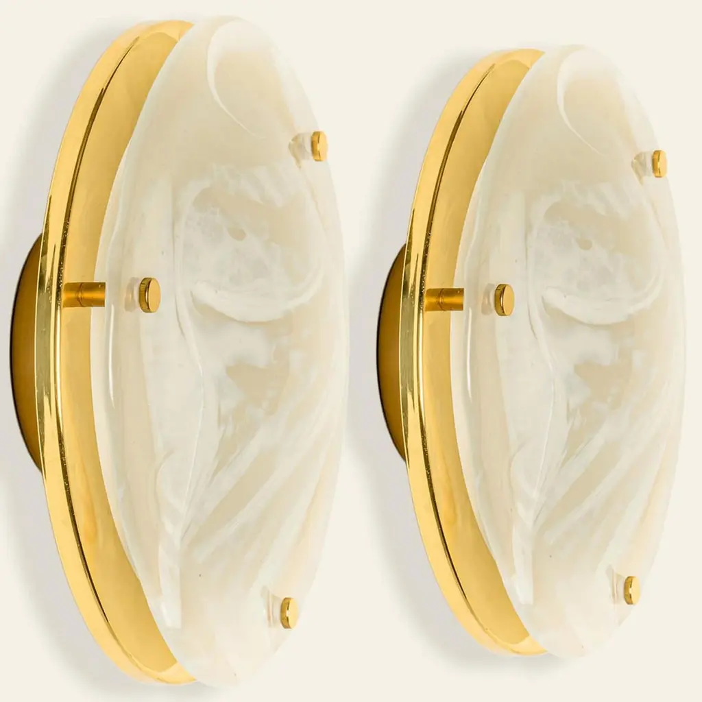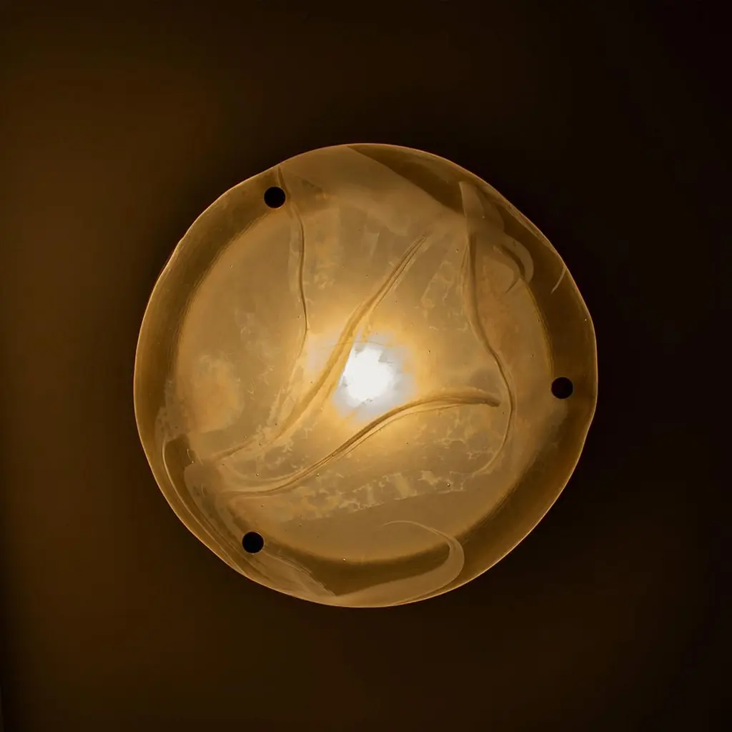 A stunning high-end brass and Murano glass flushmount manufactured in the late 1960s-early 1970s. The brass ring holds a large heavy blown glass with three brass screws. The white glass has a beautiful textured structure. Beautiful craftsmanship of the 20th century.The timeless elegance of this flush mount is sure to lend a special atmosphere in every home.Can also work as impressive wall lights.Please notice the price is for 1 piece. We have 2 pieces available. Feel free to contact us for availability.In excellent condition. Cleaned respecting the beautiful patina, well wired, in full working order and ready to use.