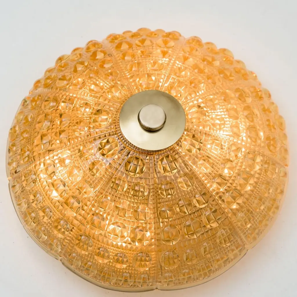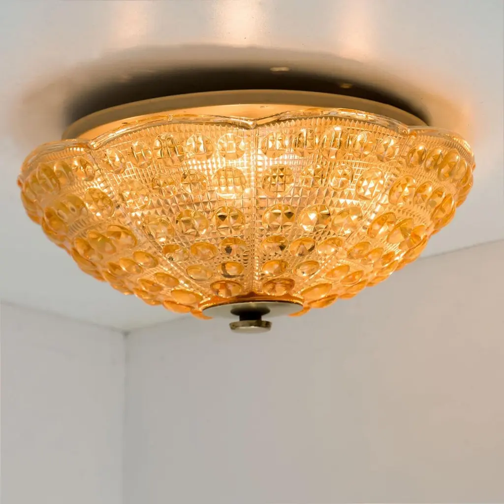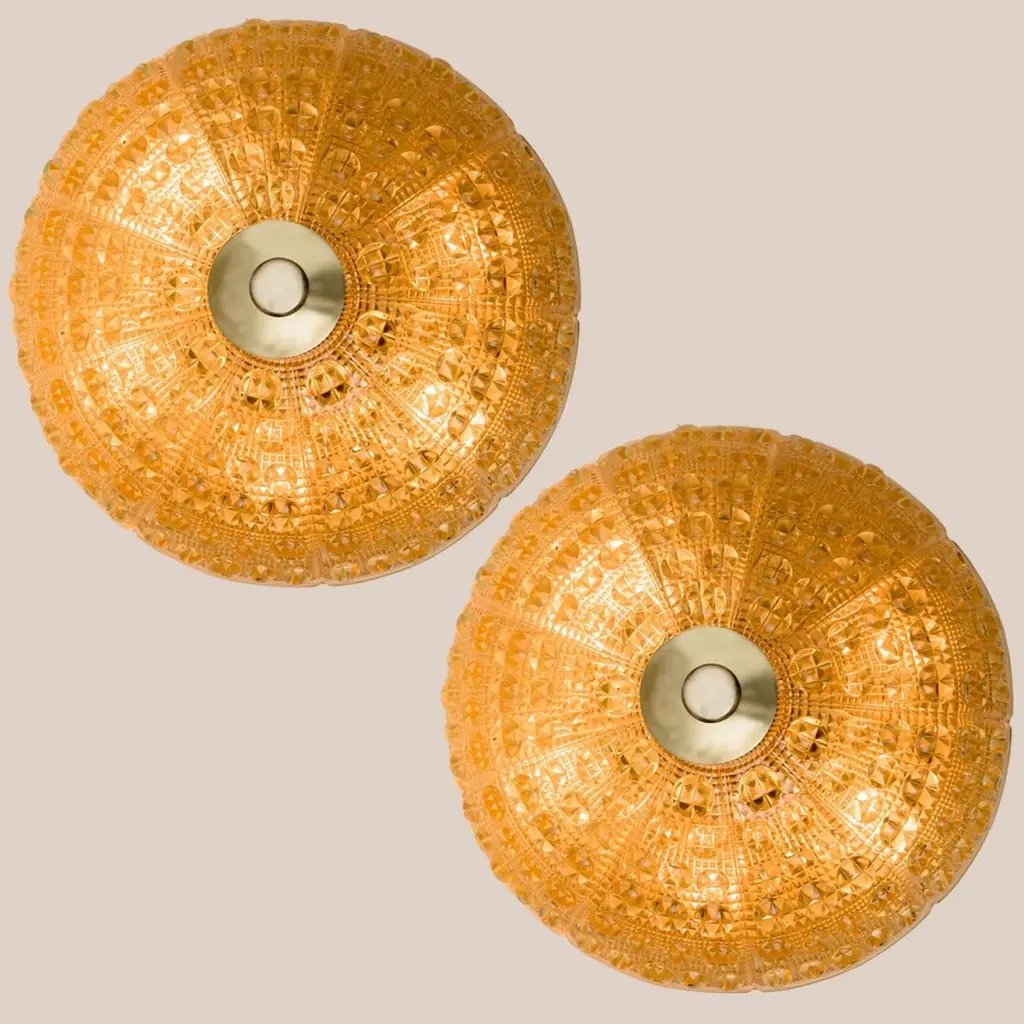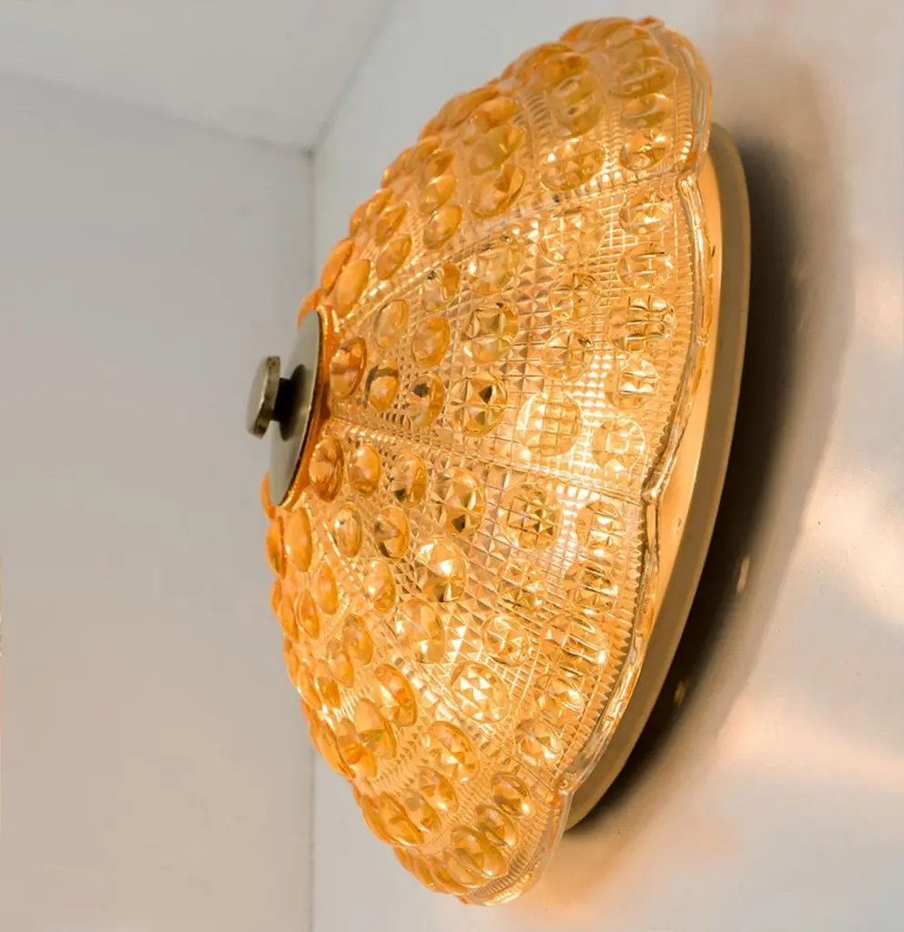Wonderful Flush Mount made by Fagerlund, Sweden. From around 1960. Consists of a beautiful crystal handmade glass plate on a polished brass plate.The texture of the glass gives the illusion of ice crystals which creates a beautiful ambiance. Manufactured in the 1960s. A handmade and high quality piece.Can also be used as wall lights.Illuminates beautifully.Dimensions:Depth: 3.5" ( 9 cm)Diameter: 13.77" (35 cm)Cleaned and well-wired, in full working order and ready to use. This vintage item has no defects it may show slight traces of patina in line of age.The light requires 6 E14 light bulbs and is LED compatible.