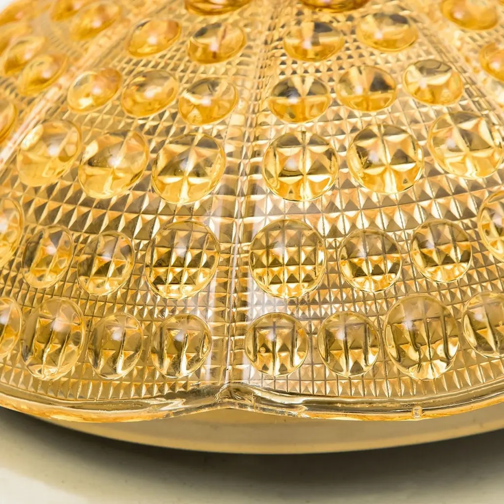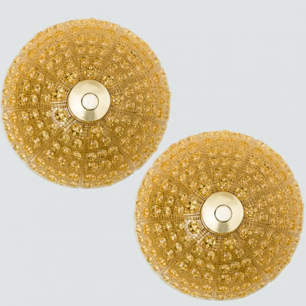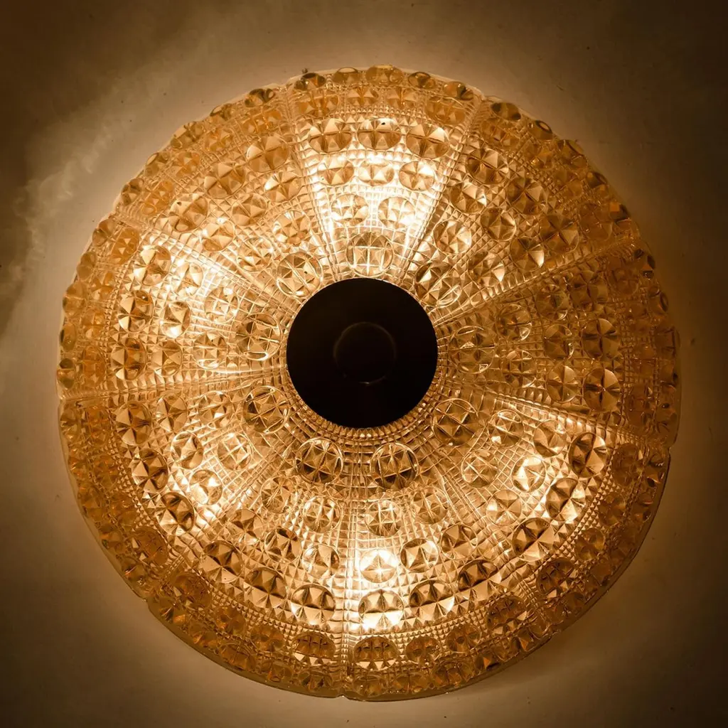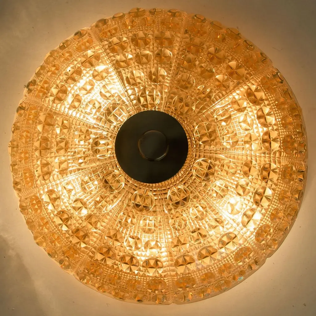Wonderful Flush Mount made by Fagerlund, Sweden. From around 1960. Consists of a beautiful crystal handmade glass plate on a polished brass plate.The texture of the glass gives the illusion of ice crystals which creates a beautiful ambiance. Manufactured in the 1960s. A handmade and high quality piece.Can also be used as wall lights.Illuminates beautifully.Dimensions:Depth: 3.5" ( 9 cm)Diameter: 13.77" (35 cm)Cleaned and well-wired, in full working order and ready to use. This vintage item has no defects it may show slight traces of patina in line of age.The light requires 6 E14 light bulbs and is LED compatible.