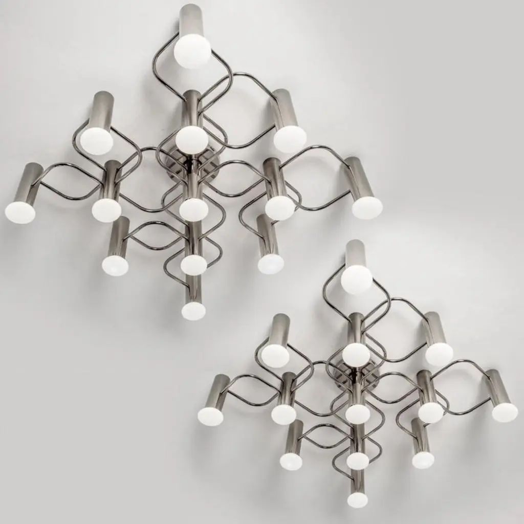 Gorgeous Sciolari style ceiling or wall flush mount by Leola. Made with solid chrome, Germany, 1970s.Can be used as ceiling flush mount or as an extra ordinary wall light. 2 pieces available.The light fixture requires 9 E14 candelabra bulbs, each up to 40 watts. Different effects can be achieved by fitting different light bulbs, clear light bulbs for a classic look, or gold tone bulbs for a glamorous look.Dimensions:26.8 in (68 cm) length x 26.8 in (68 cm) width x 9.8 in (25 cm) height.