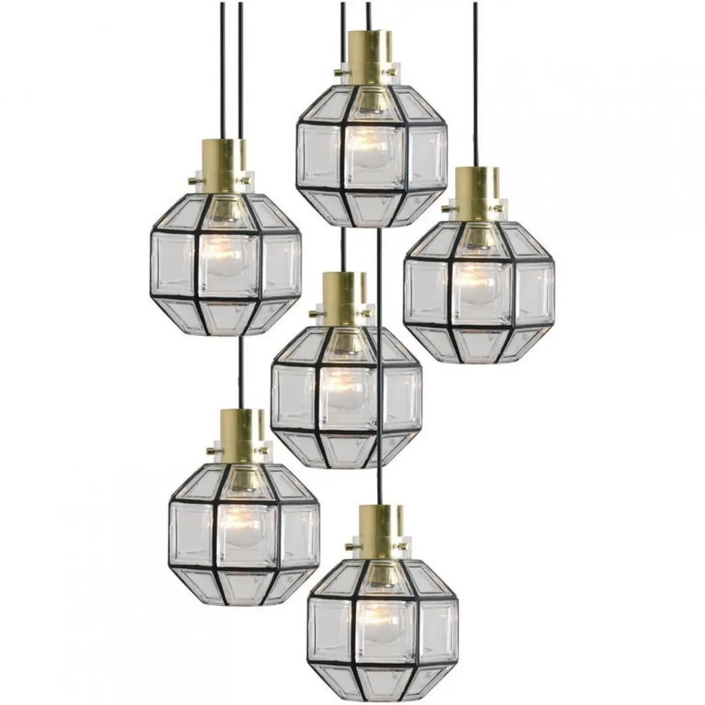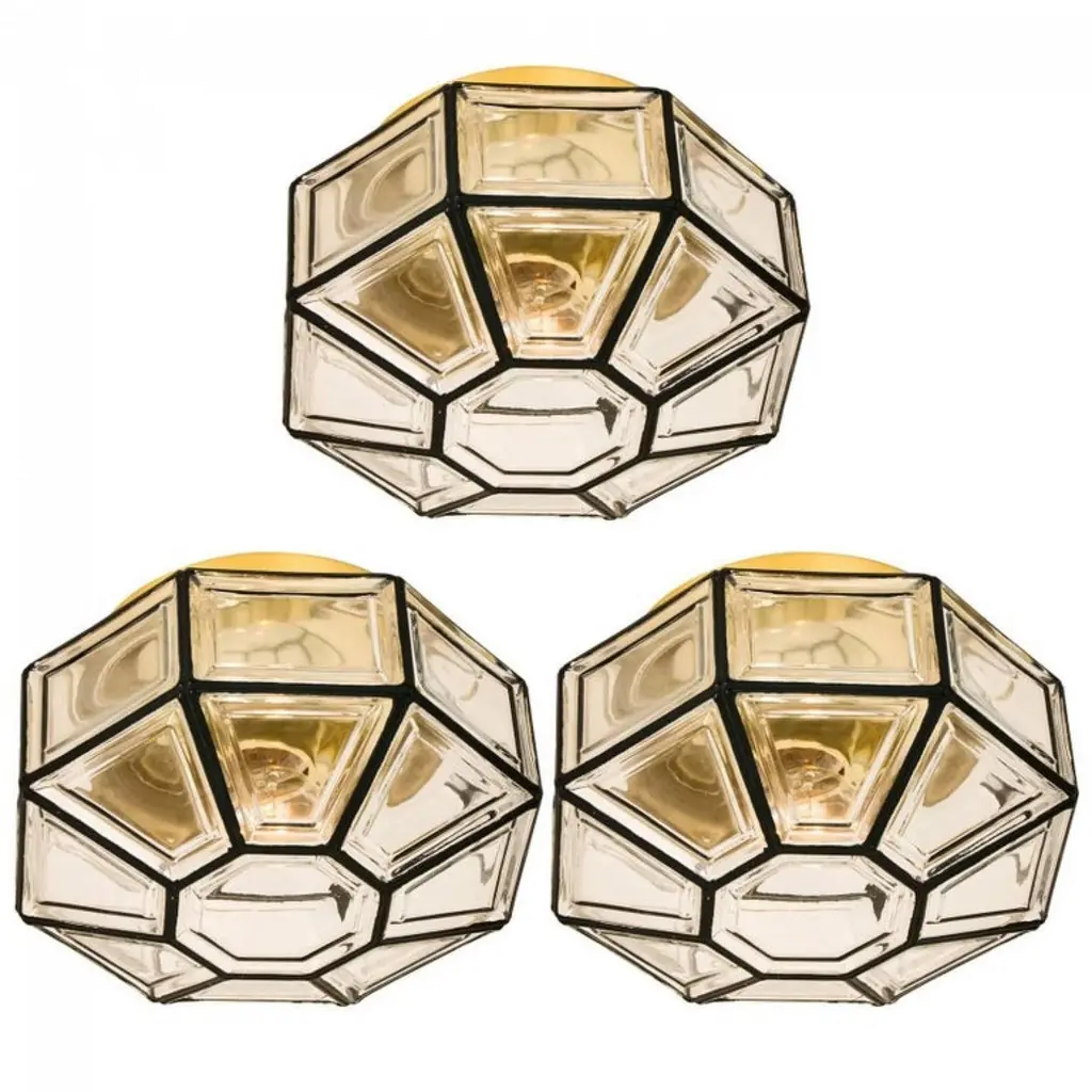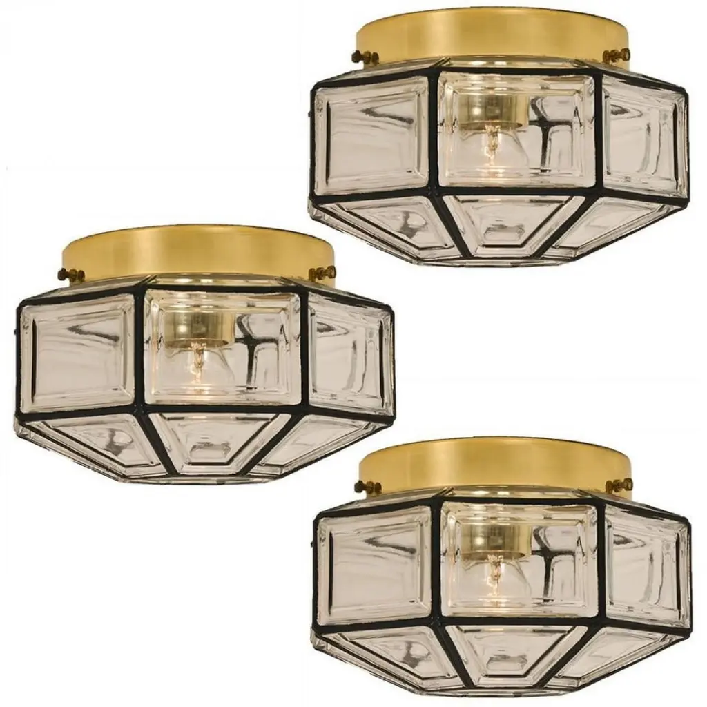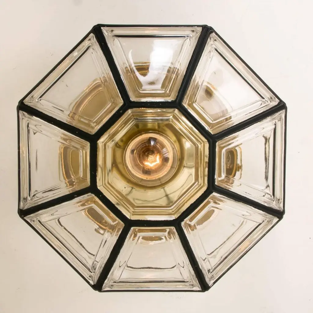 This octagonal glass light flush mounts or wall light is manufactured by Glashütte Limburg in Germany during the 1960s. Beautiful craftsmanship. The lamp, made from elaborate clear glass, features one E27 socket and brass suspension.Very good condition! Cleaned well wired and ready to use. we offer more from the same model series (see last images).