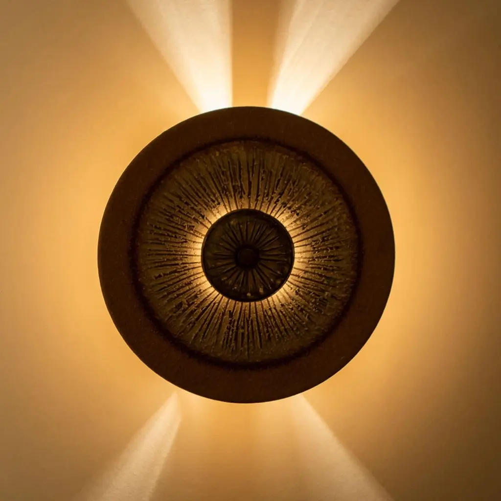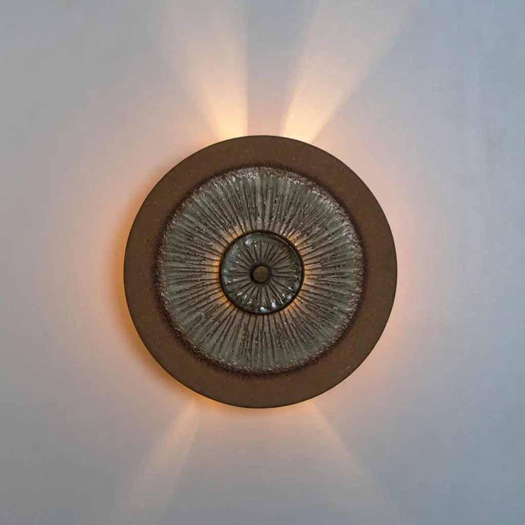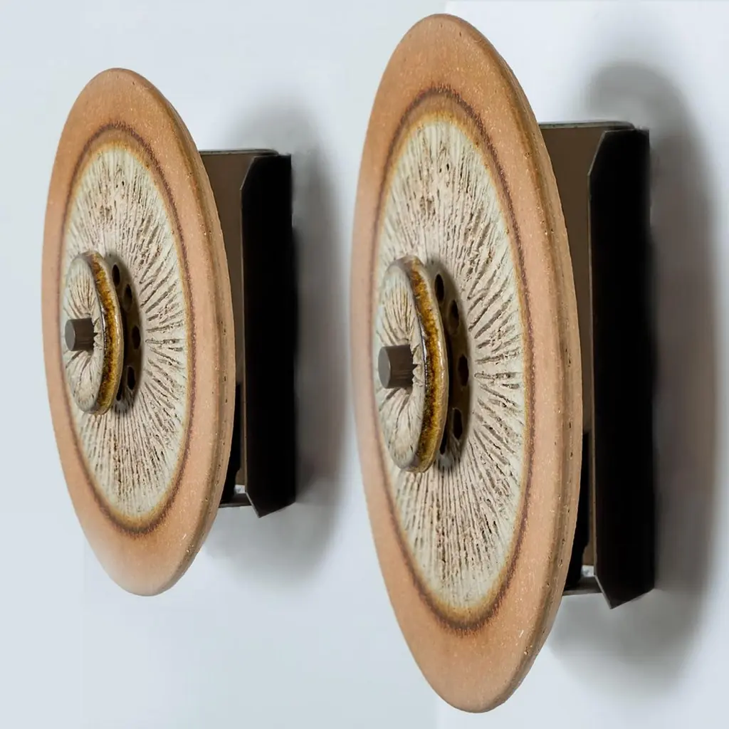 Stunning round wall lamp with an unusual shape, made with rich colored brown and grey ceramics, manufactured in the 1970s in Denmark.Dimensions:Diameter: 9.84" (25 cm).Depth: 3.54" (9 cm)Feel free to ask for additional information. See also foto's.Please note the price is for one piece, there are four available.Cleaned and well-wired, in full working order and ready to use. The brass frame is in very good condition. The wall lights can be disassembled and the glass individually wrapped for easy transport. The fixture requires 1 E14 standard bulb. Also LED compatible.