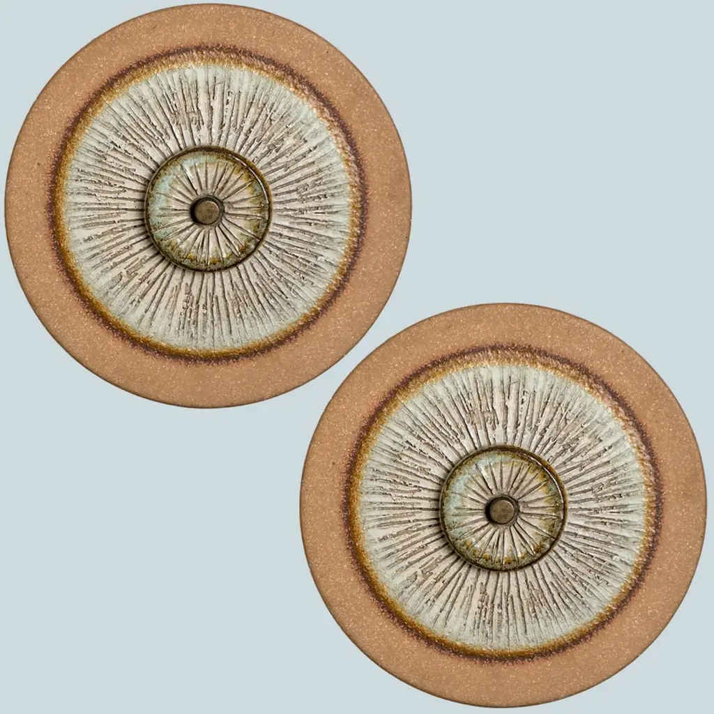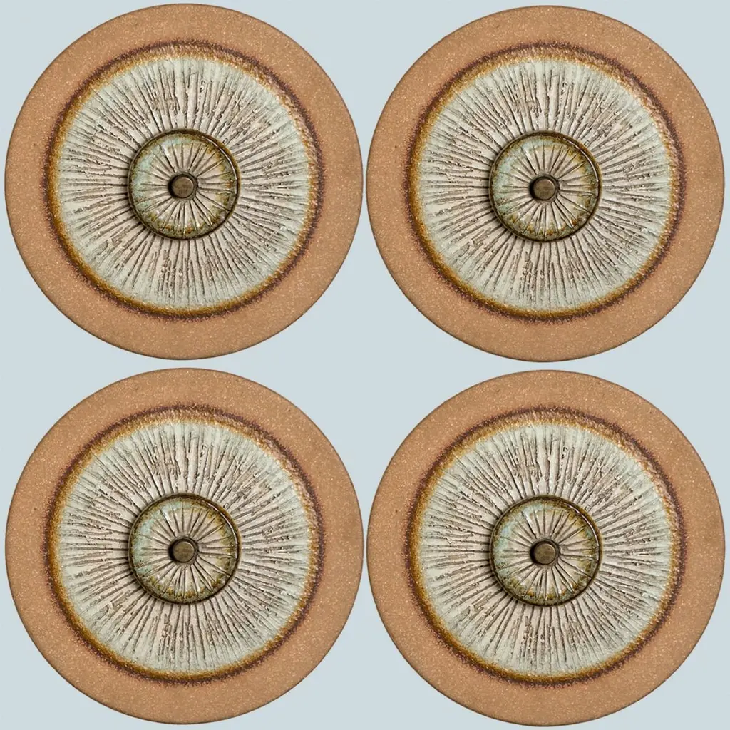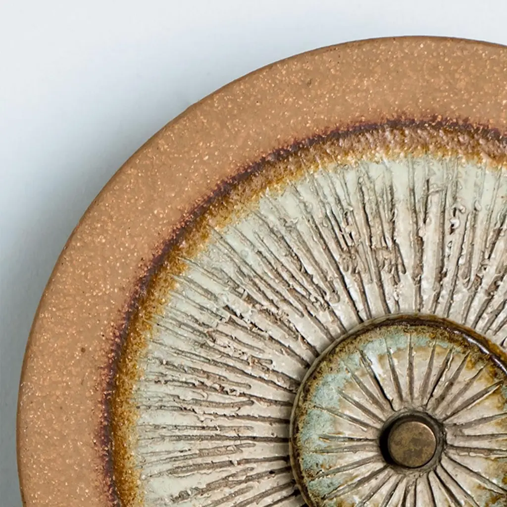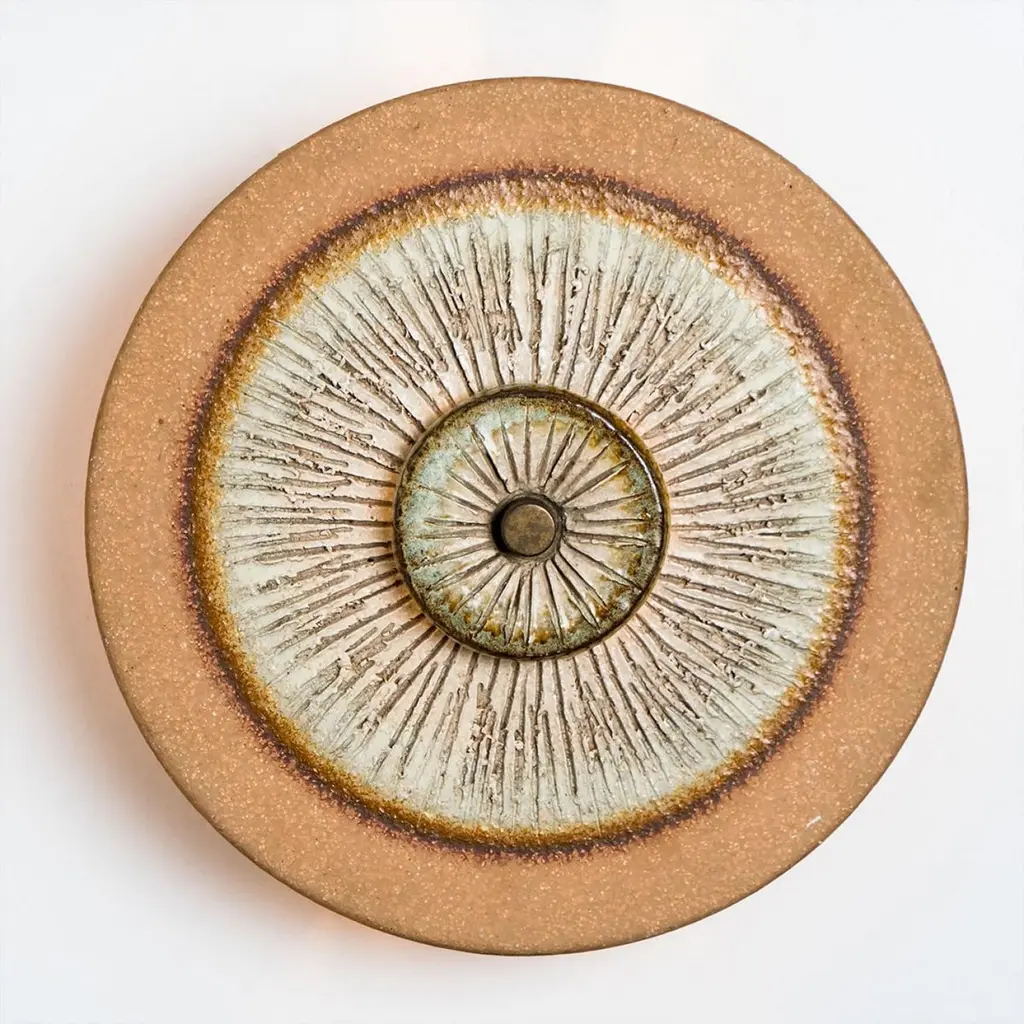 Stunning round wall lamp with an unusual shape, made with rich colored brown and grey ceramics, manufactured in the 1970s in Denmark.Dimensions:Diameter: 9.84" (25 cm).Depth: 3.54" (9 cm)Feel free to ask for additional information. See also foto's.Please note the price is for one piece, there are four available.Cleaned and well-wired, in full working order and ready to use. The brass frame is in very good condition. The wall lights can be disassembled and the glass individually wrapped for easy transport. The fixture requires 1 E14 standard bulb. Also LED compatible.