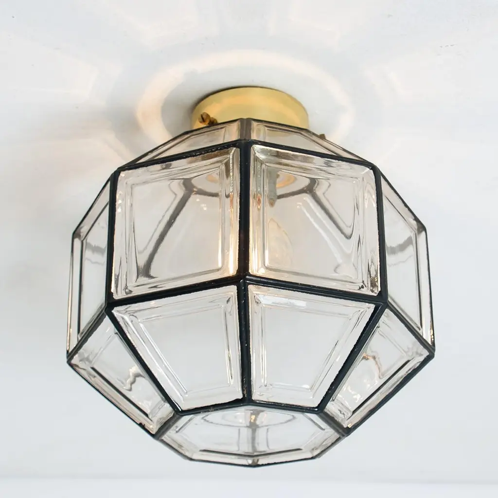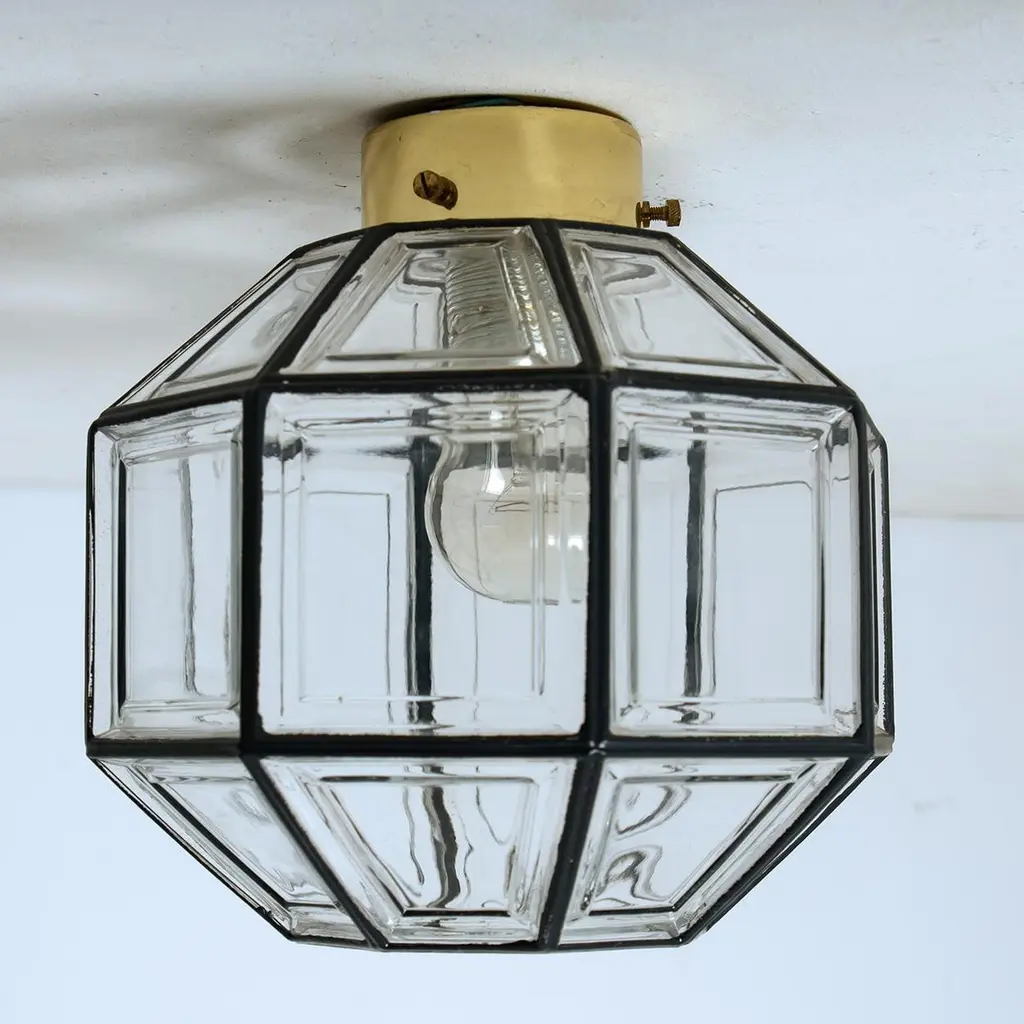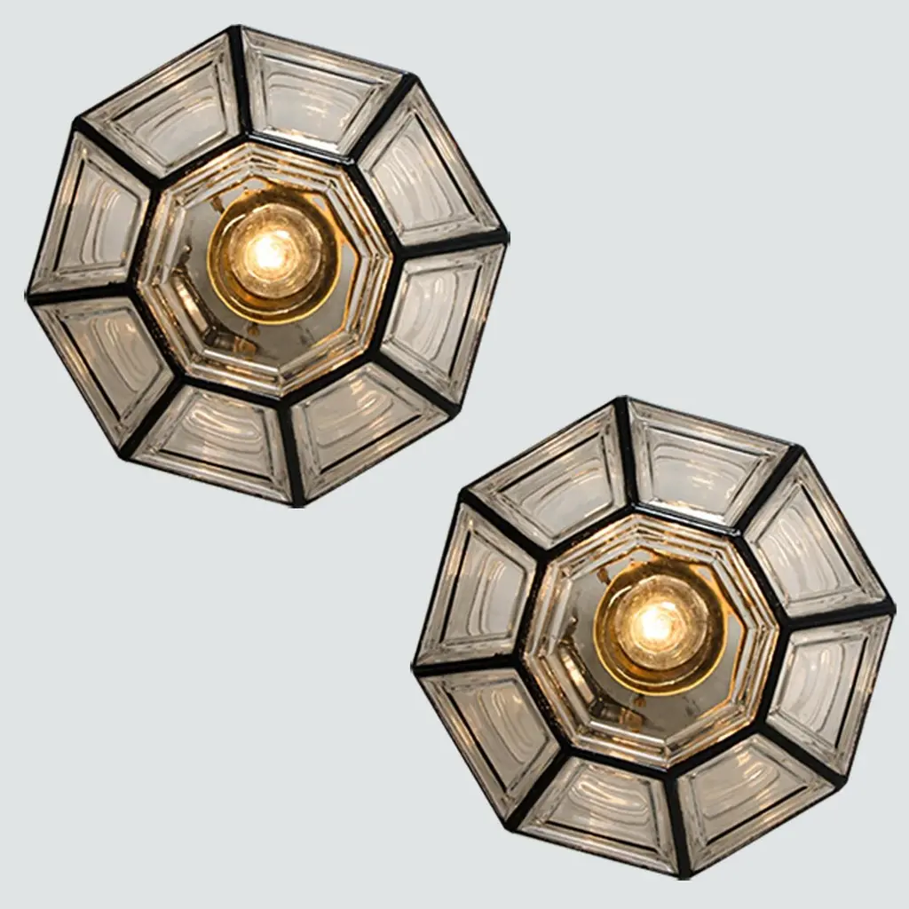 A beautiful set of octagonal glass light flush mounts or wall lights, manufactured by Glasshütte Limburg in Germany during the 1970s. Beautiful craftsmanship. Illuminates beautifully. They come from an old grand hotel in Germany.Please note the price is for a set. 4 sets available. Measurements: diameter 10.2 "26 cm (8 pieces).In very good condition, cleaned and well wired. Each lamp, features one E27 socket and brass suspension.