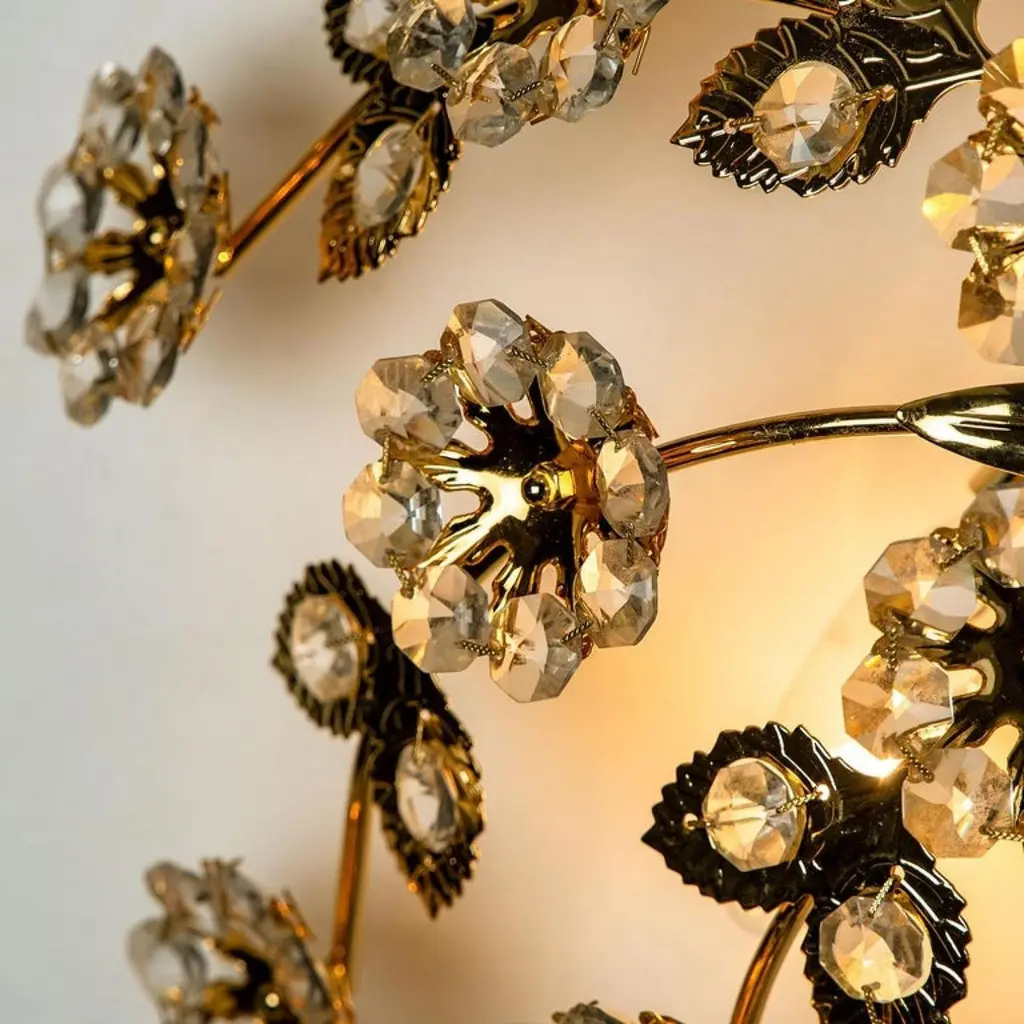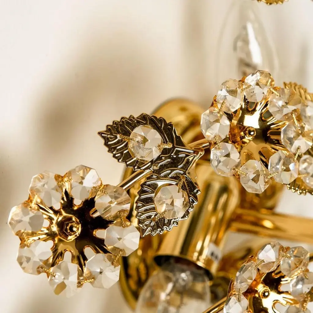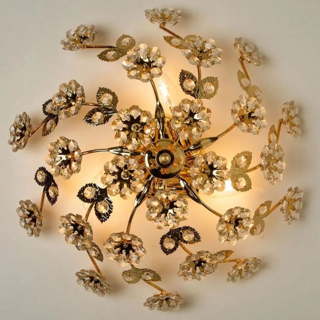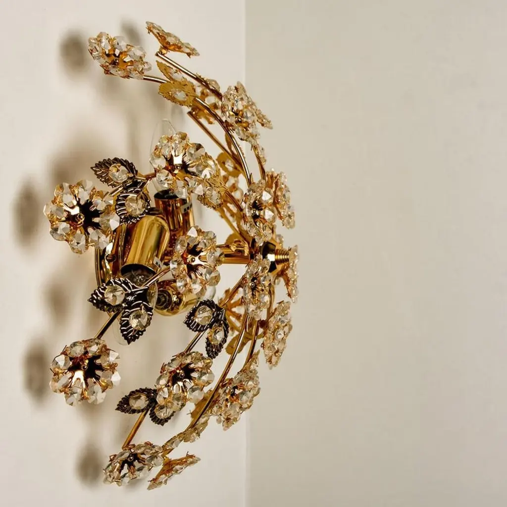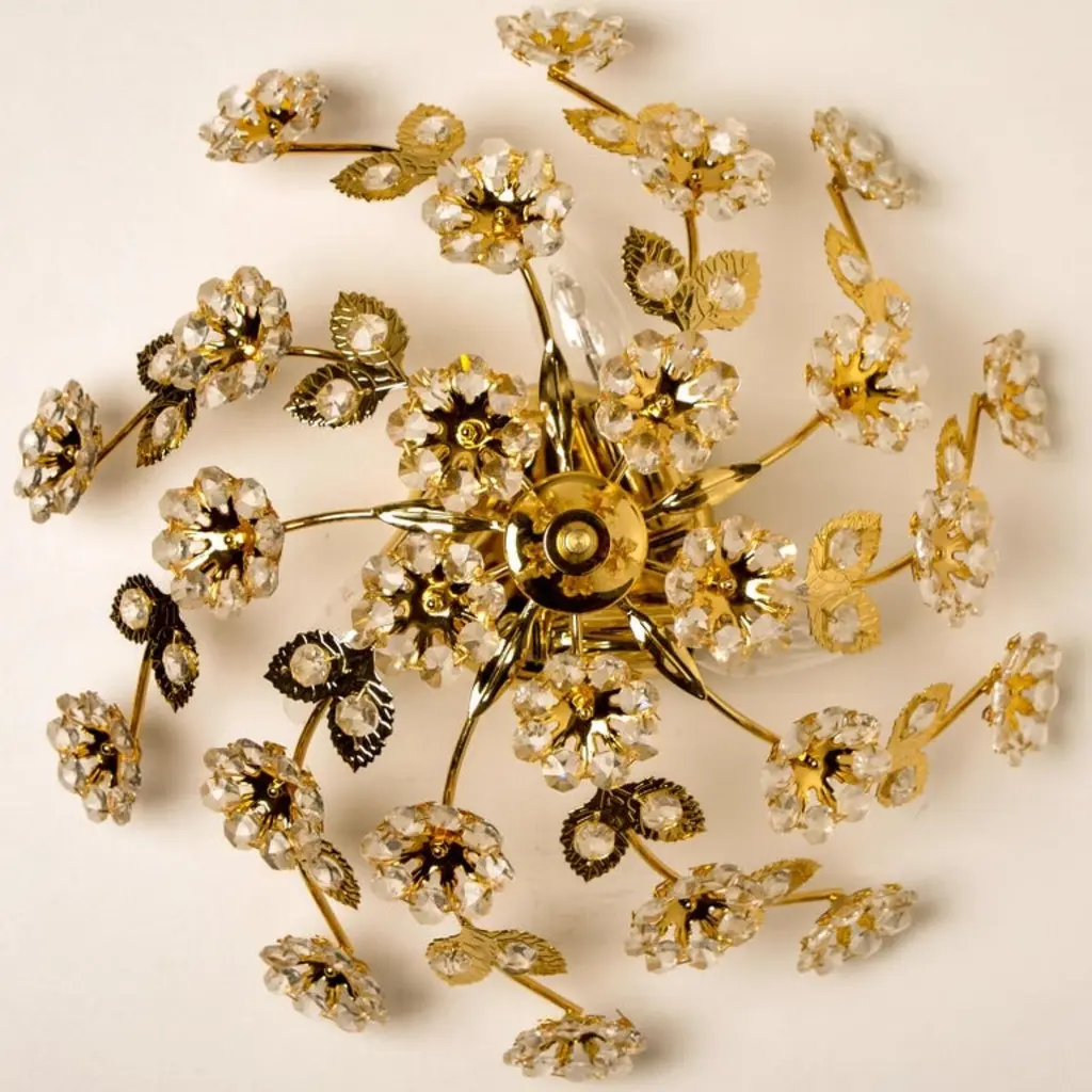 Stunning flower wall light/ flush mount by Palwa, Germany, circa 1965-1975.A luxurious of light fixture with beautifully cut flower crystals on a gold plated brass frame.please notice the price is for one, 3 pieces available.In very good vintage condition. Cleaned, well wired and ready to use. he light requires six E14 light bulbs (25 Watt max).Also smaller and a larger models available from the same model series (see images). Feel free to contact us for information.