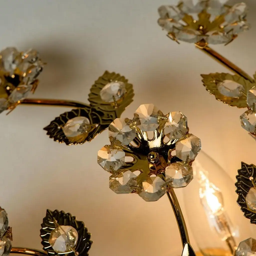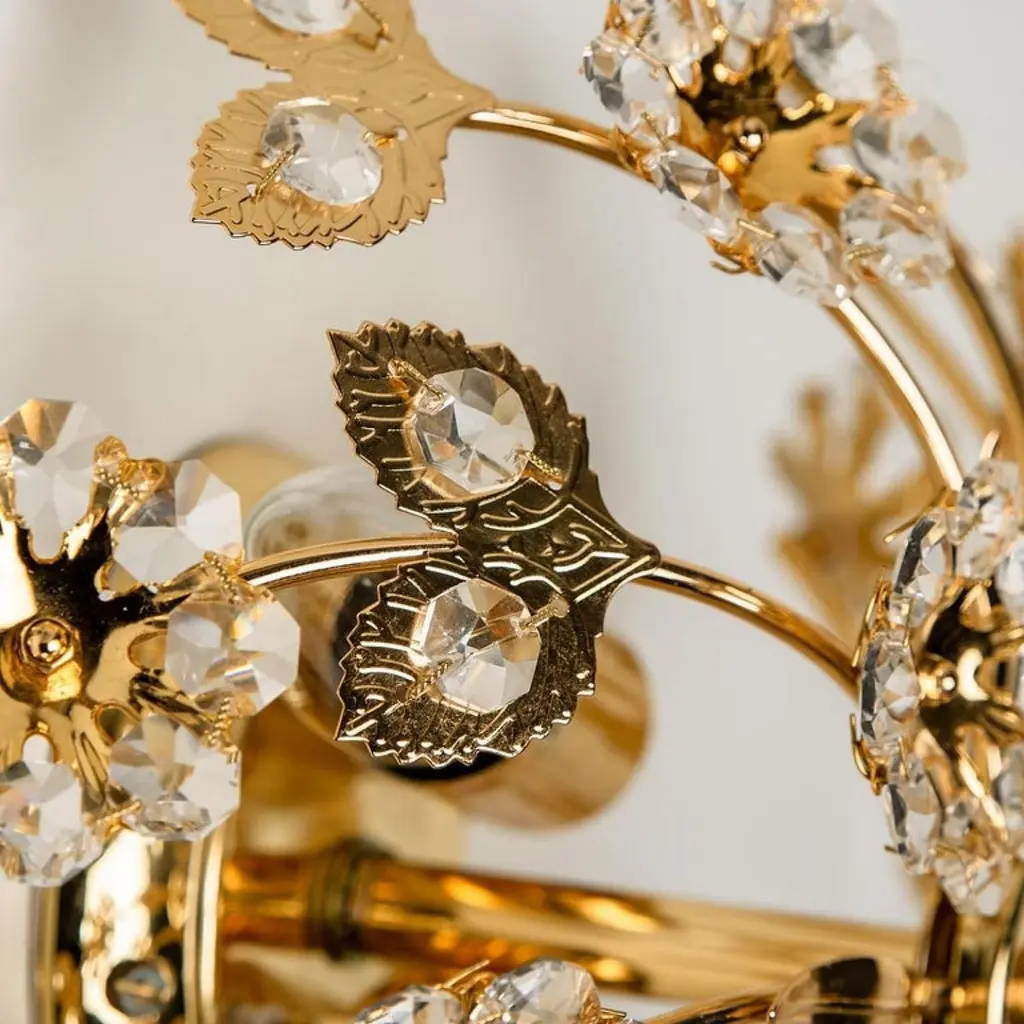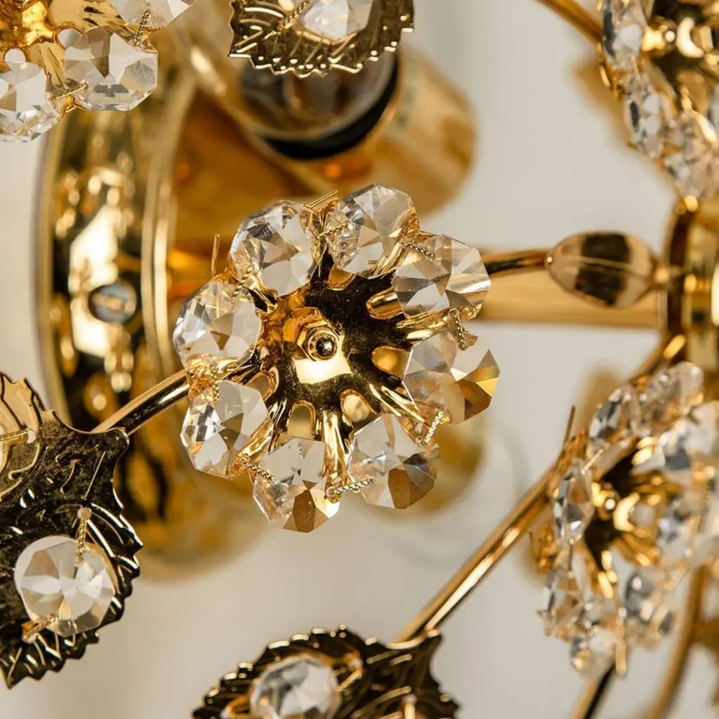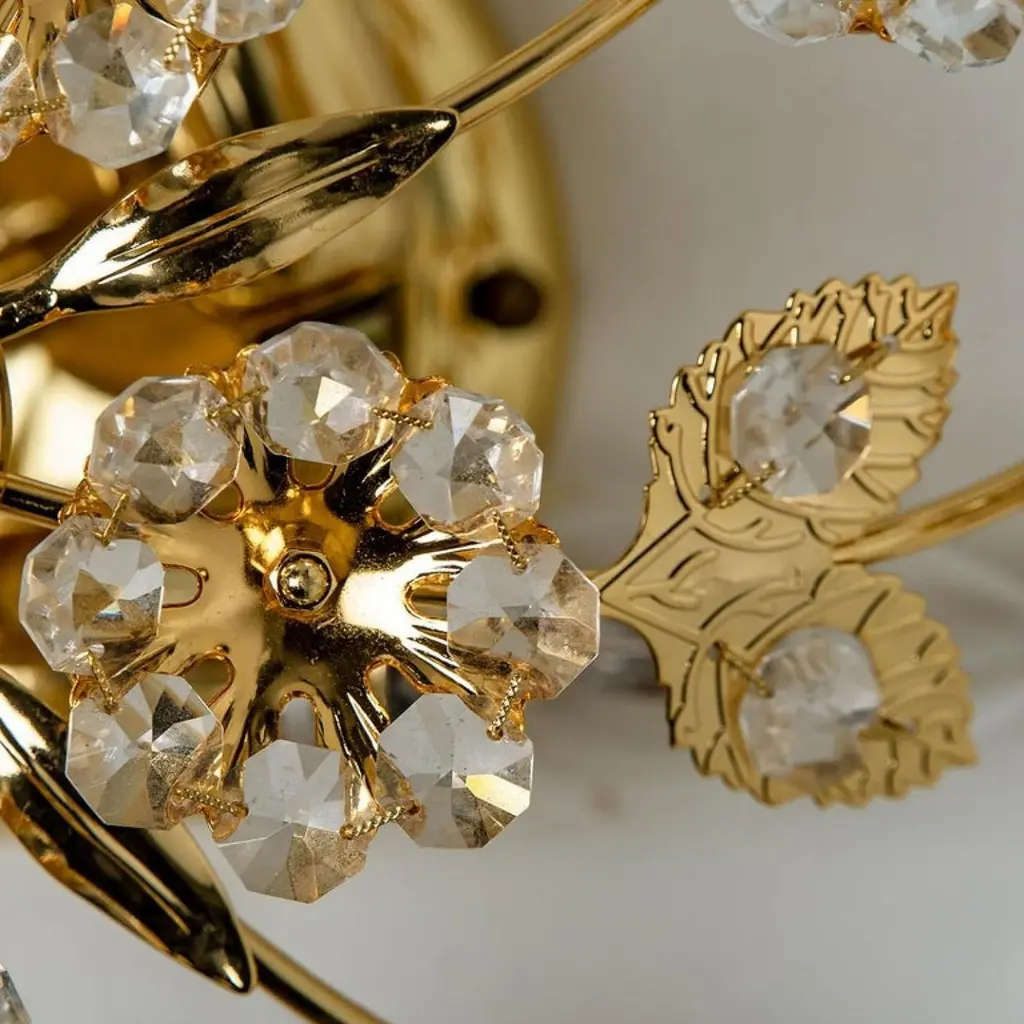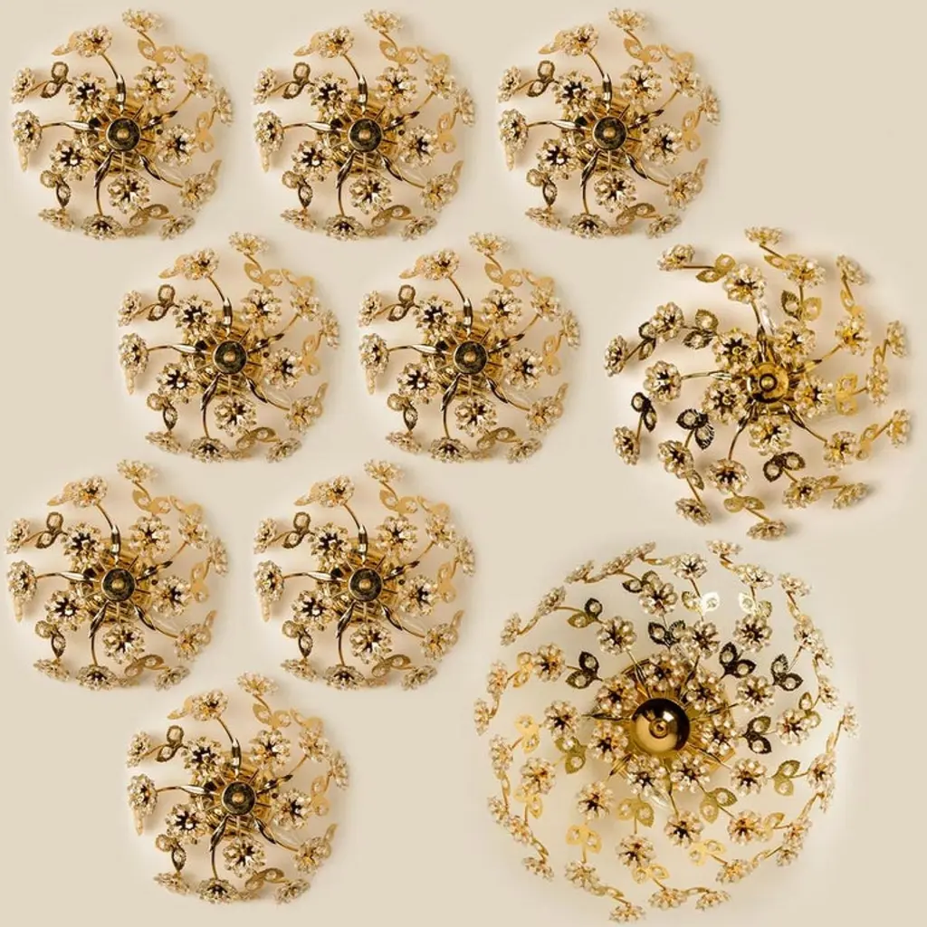 Stunning flower wall light/ flush mount by Palwa, Germany, circa 1965-1975.A luxurious of light fixture with beautifully cut flower crystals on a gold plated brass frame.please notice the price is for one, 3 pieces available.In very good vintage condition. Cleaned, well wired and ready to use. he light requires six E14 light bulbs (25 Watt max).Also smaller and a larger models available from the same model series (see images). Feel free to contact us for information.