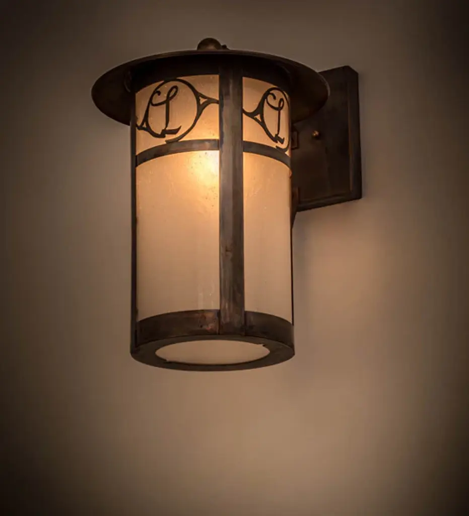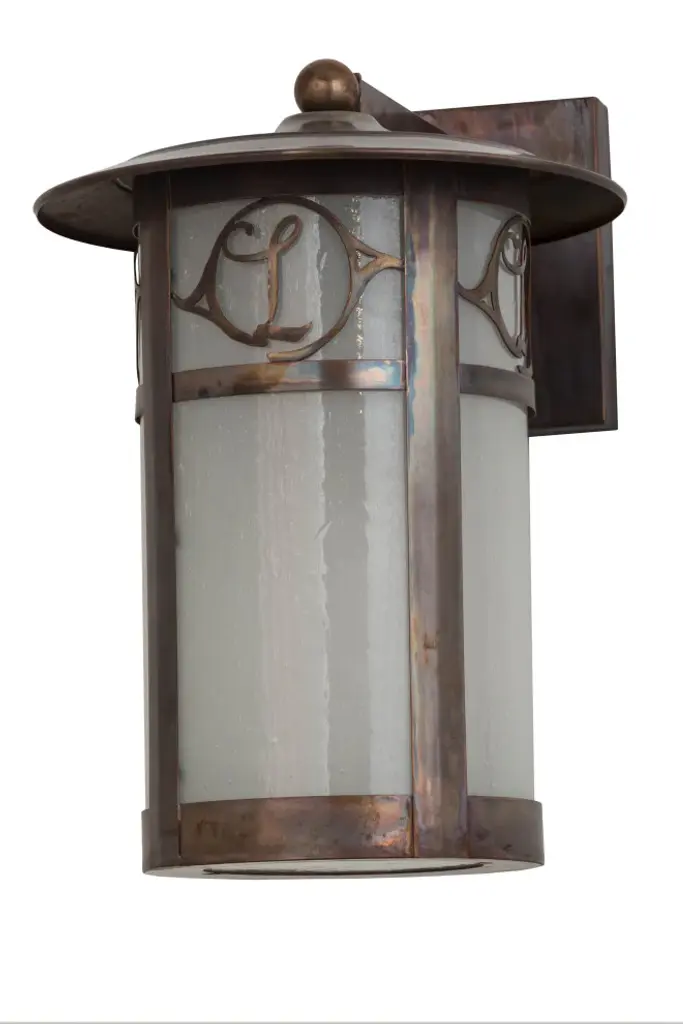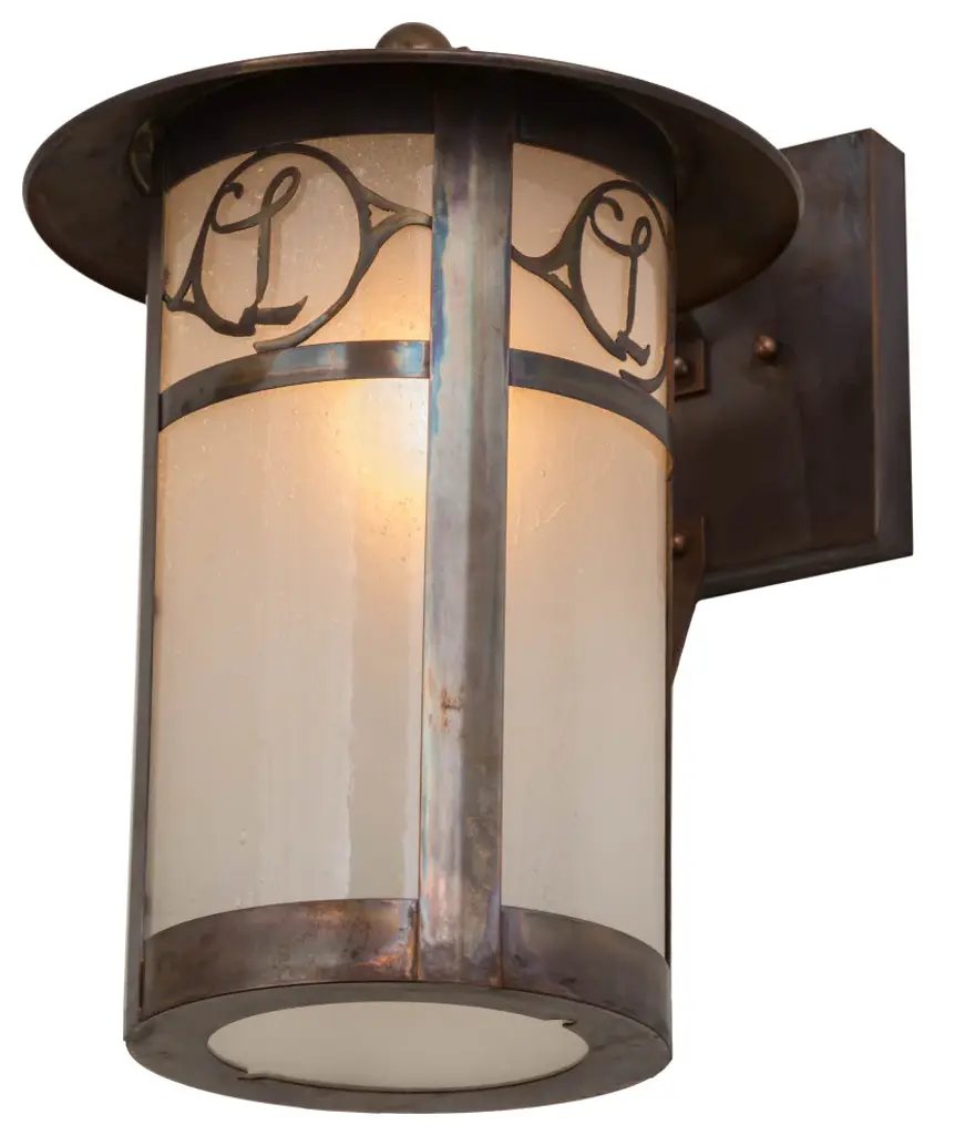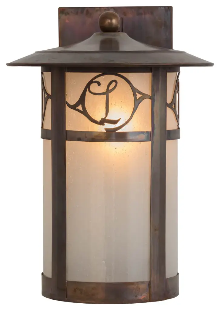 Custom crafted of Solid Copper for interior and exterior lighting applications. This solid mount wall sconce is personalized with the monogram of the client in a Vintage Copper finish that complements the Frosted Seeded Glass shade. The Fulton cylindrical shaped fixture is Domestically Produced in our 180;000 sq ft manufacturing facility in Yorkville; NY. The Build Your Own lighting series offers fully configurable combinations of lantern styles; functions; fixture sizes and metal finishes to meet your lighting needs. UL and cUL listed for dry; damp and wet locations. Personalized items are shown as examples of our craftsmanship. They are not for sale as is but can be customized to fit your personal needs.