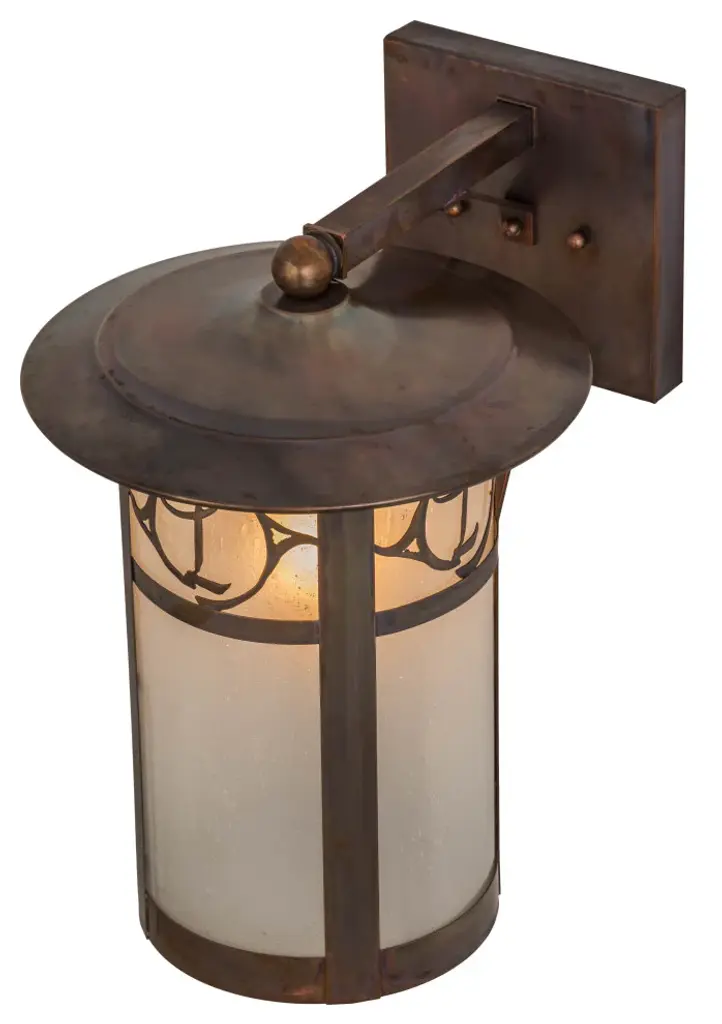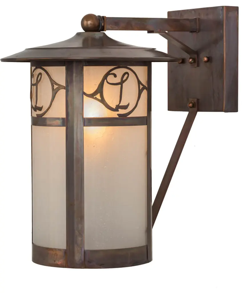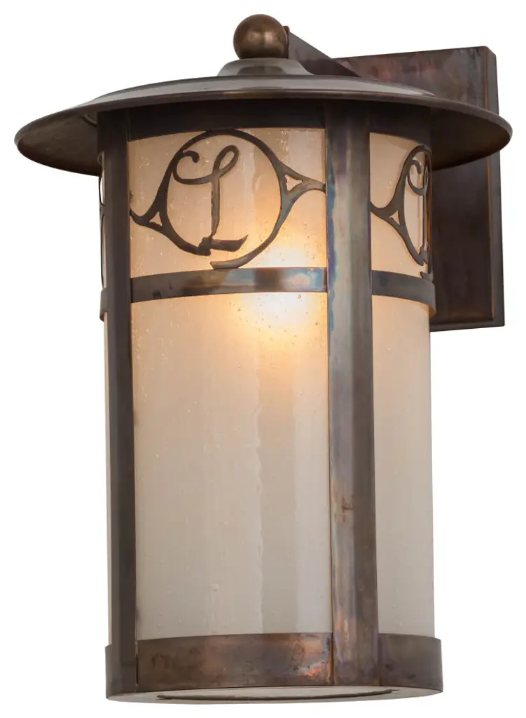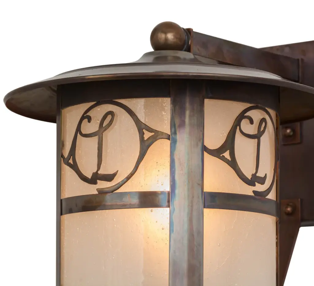 Custom crafted of Solid Copper for interior and exterior lighting applications. This solid mount wall sconce is personalized with the monogram of the client in a Vintage Copper finish that complements the Frosted Seeded Glass shade. The Fulton cylindrical shaped fixture is Domestically Produced in our 180;000 sq ft manufacturing facility in Yorkville; NY. The Build Your Own lighting series offers fully configurable combinations of lantern styles; functions; fixture sizes and metal finishes to meet your lighting needs. UL and cUL listed for dry; damp and wet locations. Personalized items are shown as examples of our craftsmanship. They are not for sale as is but can be customized to fit your personal needs.