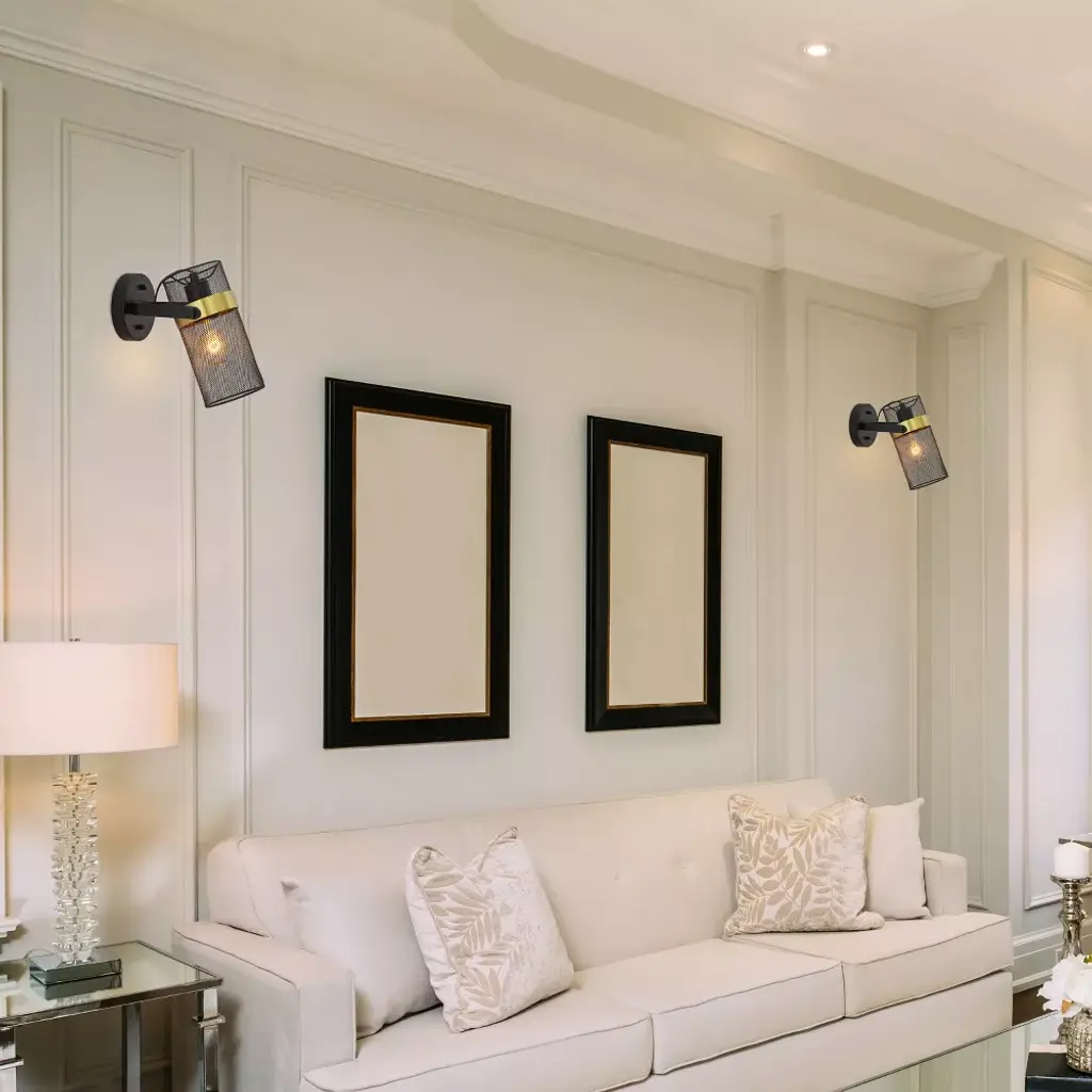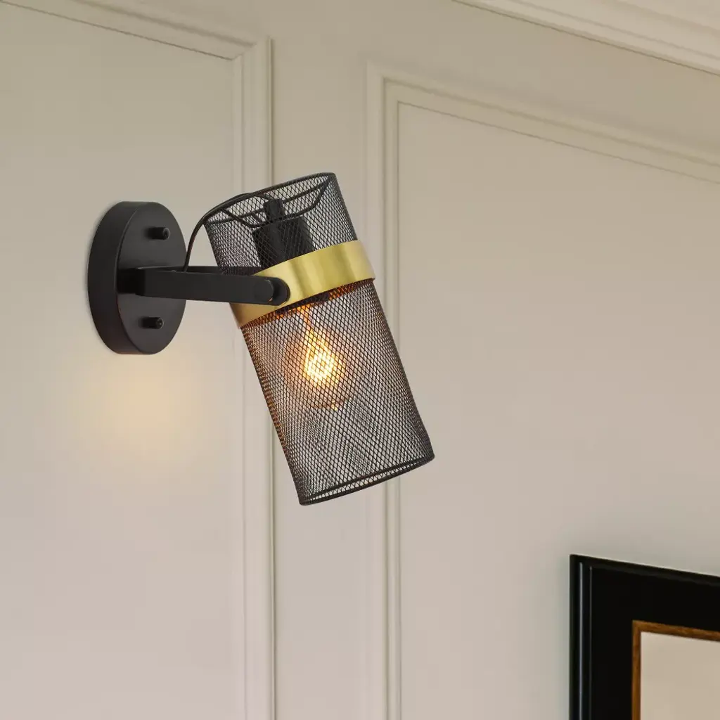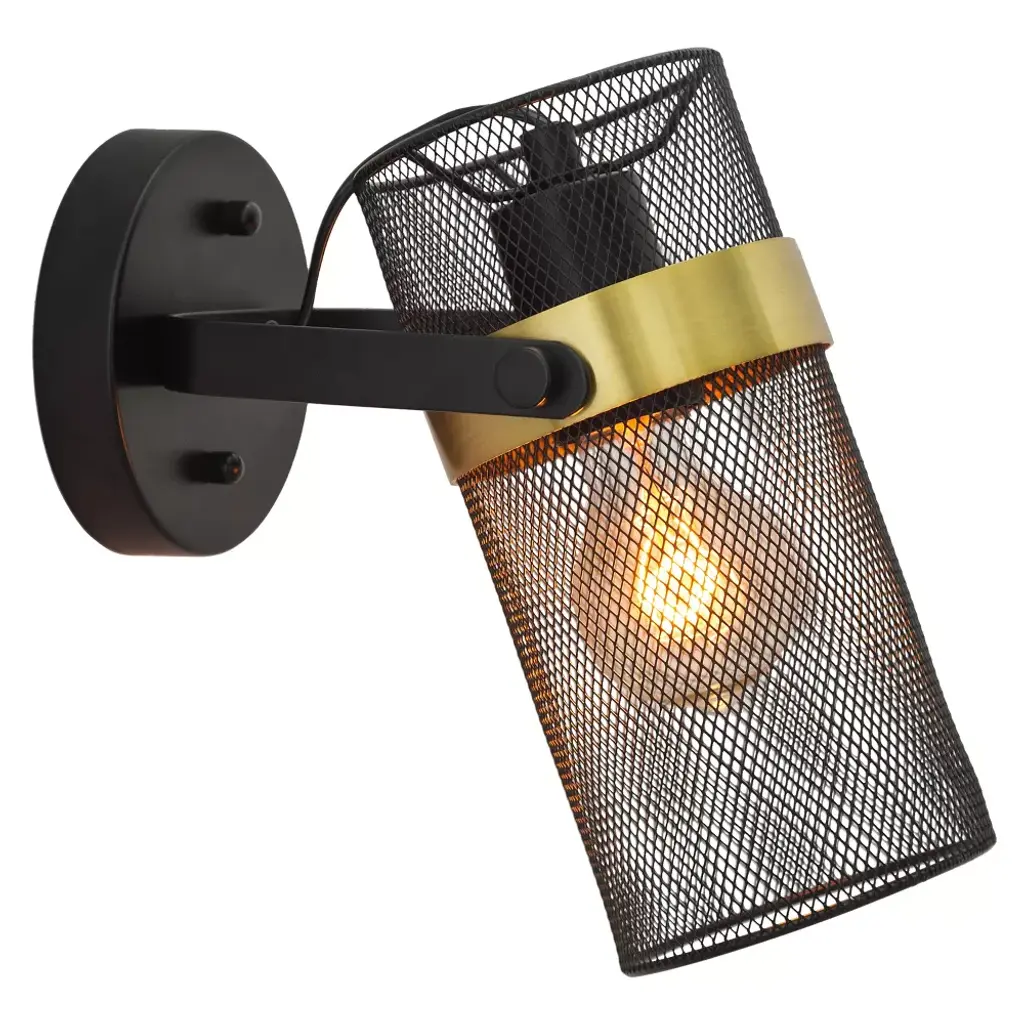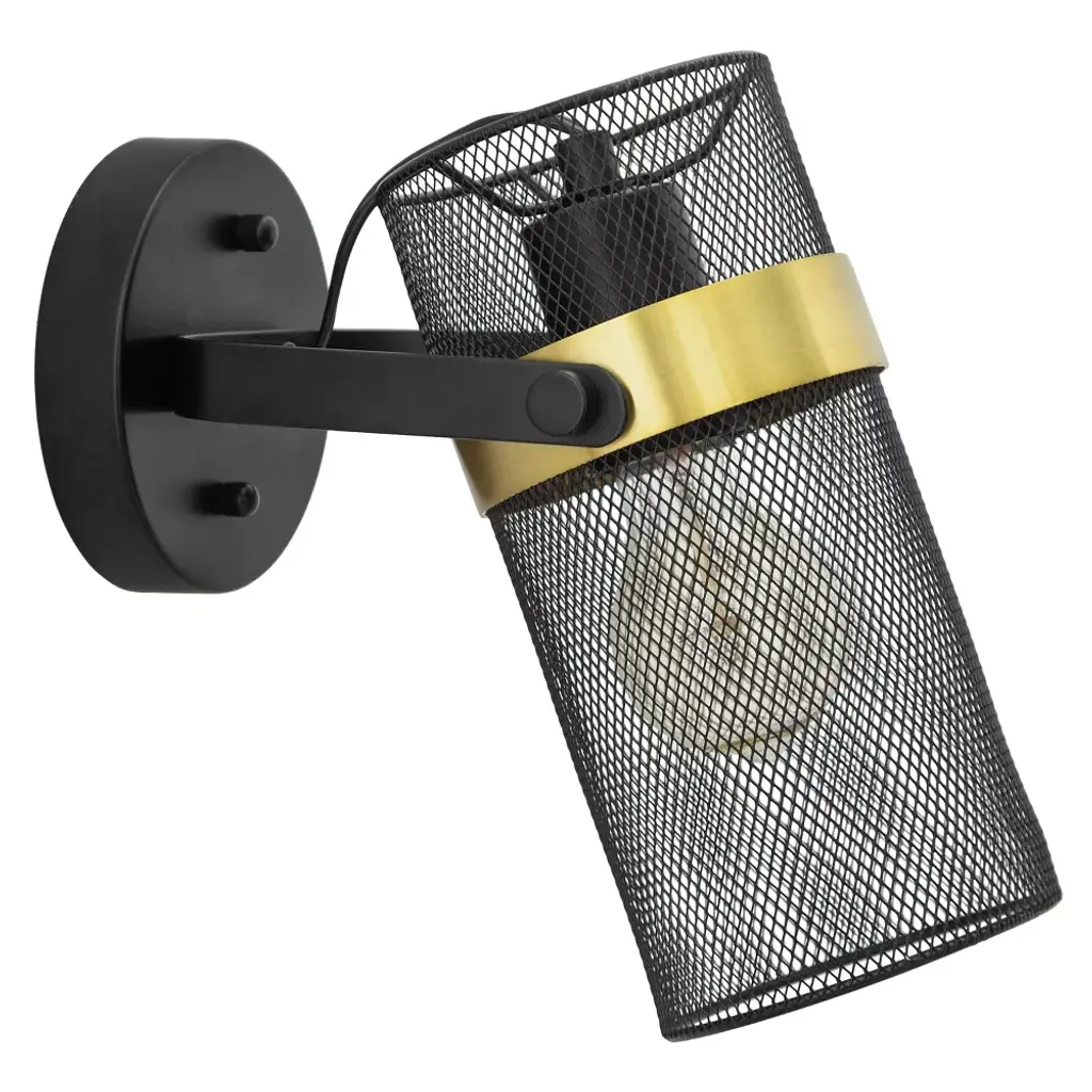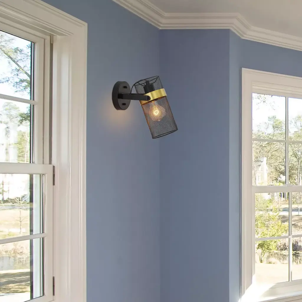 Add convenient lighting while creating a stylish focal point in your home with the 12" H Echo Black Painted Metal Mesh Drum Shade Wall Sconce from River of Goods. Designed with an industrial look and feel with the black-painted metal base connected to the glass-free, drum-shaped black-painted metal mesh adjustable shade with a gold-painted metal band, this impactful wall sconce is a perfect choice for creating a dramatic lighting focal point in your living room, above your bedside table, or in your entryway. Hardwire the wall mount, and the allover mesh design of the drum-shaped metal shade forms a modern pattern while letting the one 60-watt bulb, not included, shine through.
