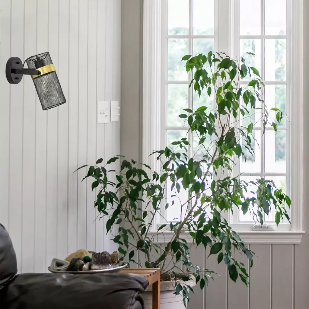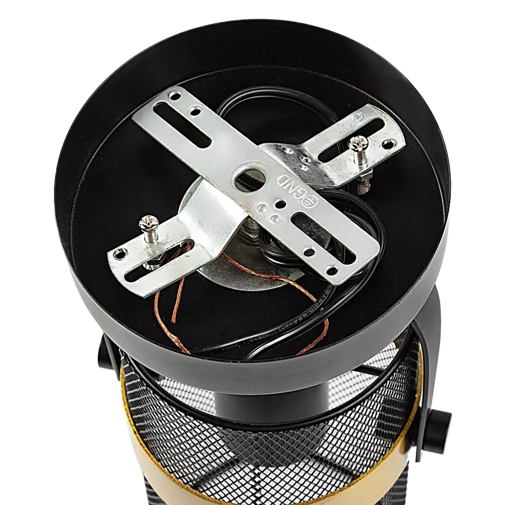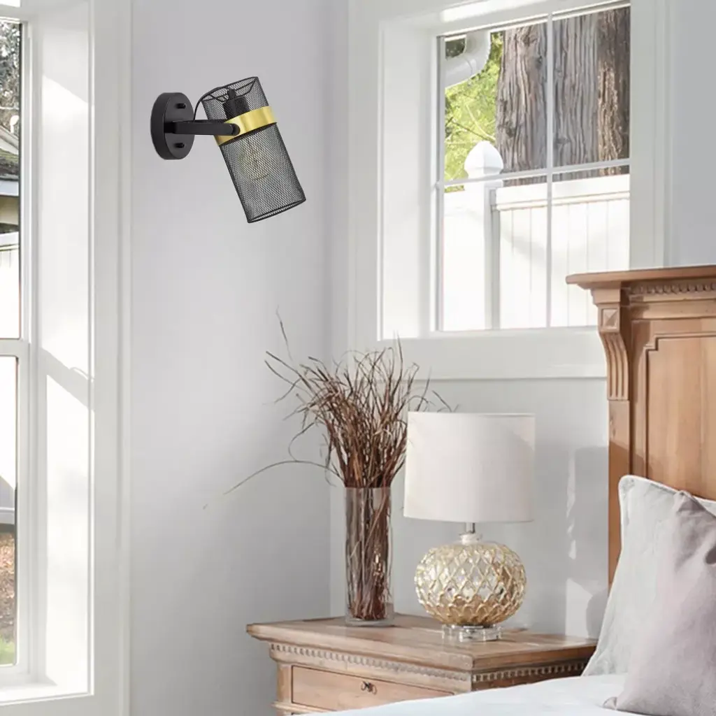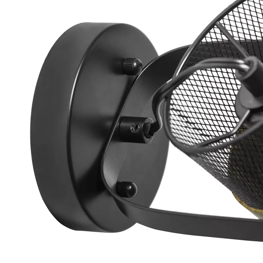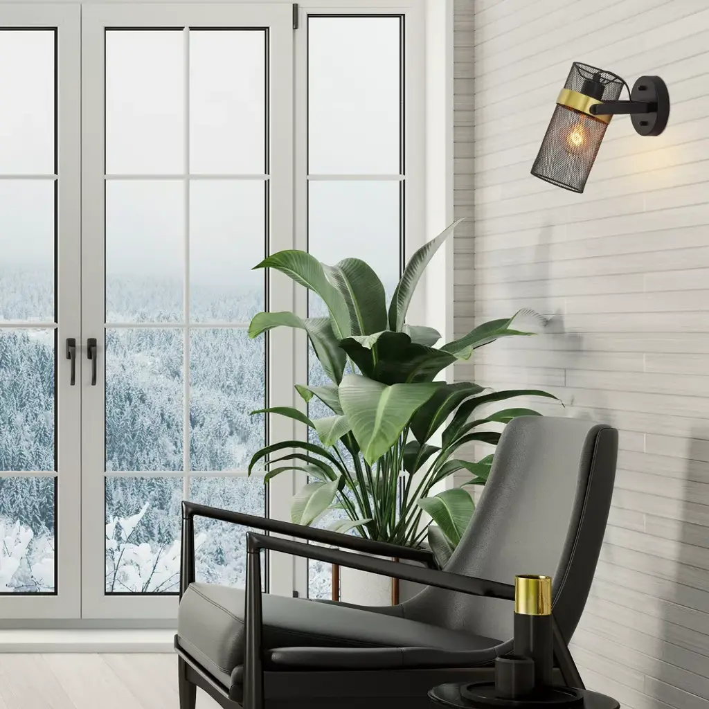 Add convenient lighting while creating a stylish focal point in your home with the 12" H Echo Black Painted Metal Mesh Drum Shade Wall Sconce from River of Goods. Designed with an industrial look and feel with the black-painted metal base connected to the glass-free, drum-shaped black-painted metal mesh adjustable shade with a gold-painted metal band, this impactful wall sconce is a perfect choice for creating a dramatic lighting focal point in your living room, above your bedside table, or in your entryway. Hardwire the wall mount, and the allover mesh design of the drum-shaped metal shade forms a modern pattern while letting the one 60-watt bulb, not included, shine through.