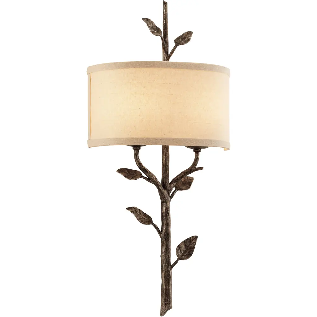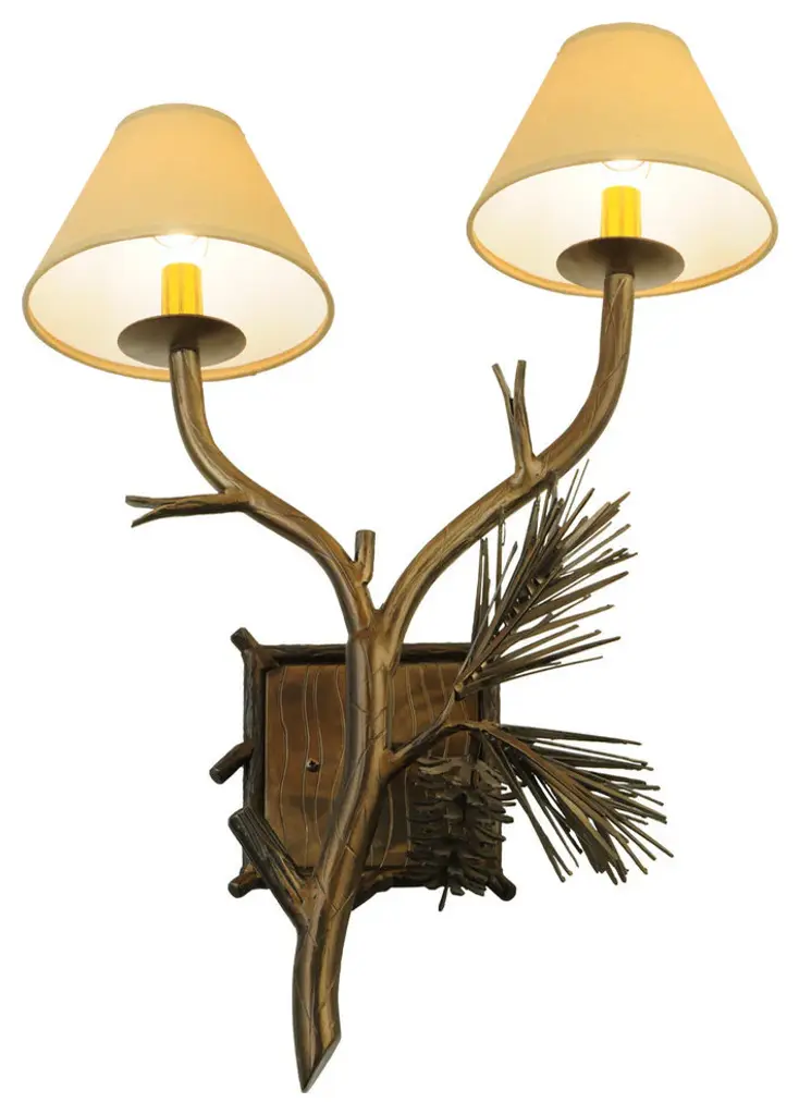 This nature inspired lighting fixture highlights stunning Hand Sculpted Pine Needles and Pinecones, which accent faux candlelight''s topped with Tan shades perched on branch-like solid steel arms. All accents and hardware are featured in an Antique Copper finish. This left-hand fixture is paired with a matching right-hand mate (161370). The wall sconce is handcrafted by Meyda artisans in the USA, at the foothills of the Adirondack Mountains. Custom sizes, styles and colors are available, as well as dimmable energy efficient lamping options. UL Approved: YesBulb Type: CNDLBulb Quantity: 2Bulb Wattage: 60Bulbs Included: No