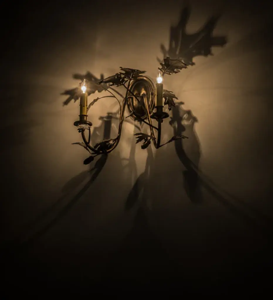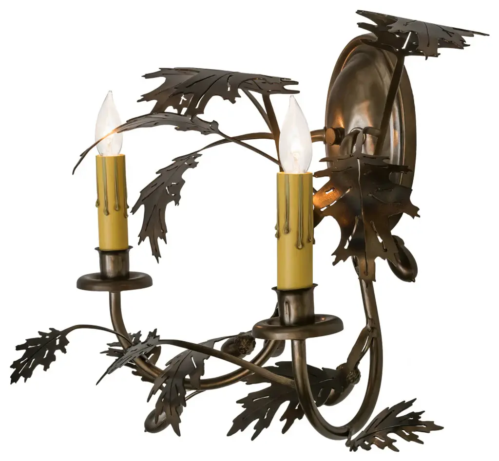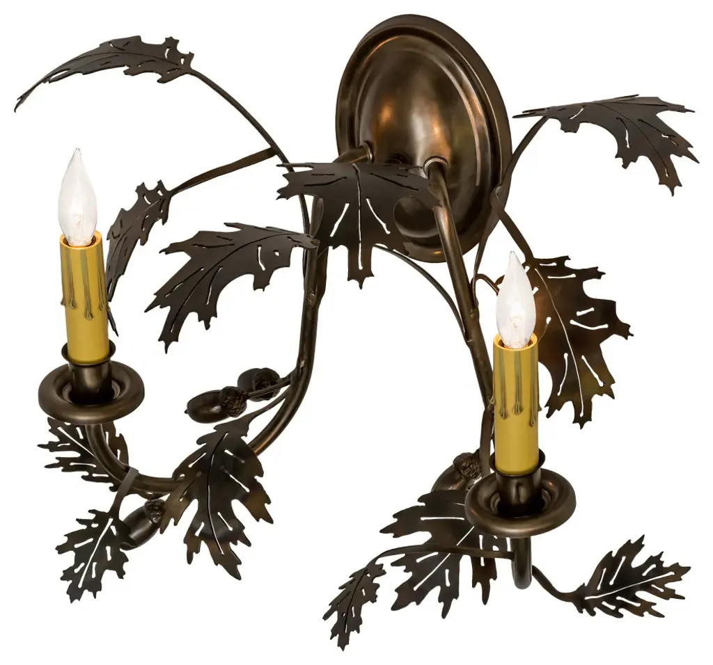 A distinctive charm is revealed with this elegant; nature inspired design as Oak Leaves and Acorns adorn two Amber faux candlelights that deliver beautiful ambient light. A stunning design; the Oak leaves symbolize strength; endurance; eternity; honor; hospitality and virtue. The decorative accents and hardware are featured in an Antique Copper finish. The fixture is handcrafted in Meyda''s manufacturing facility; at the foothills of the majestic Adirondack Mountains in the USA. Custom colors; styles; sizes and dimmable energy efficient lamping options such as LED are available. UL and cUL listed for damp and dry locations.