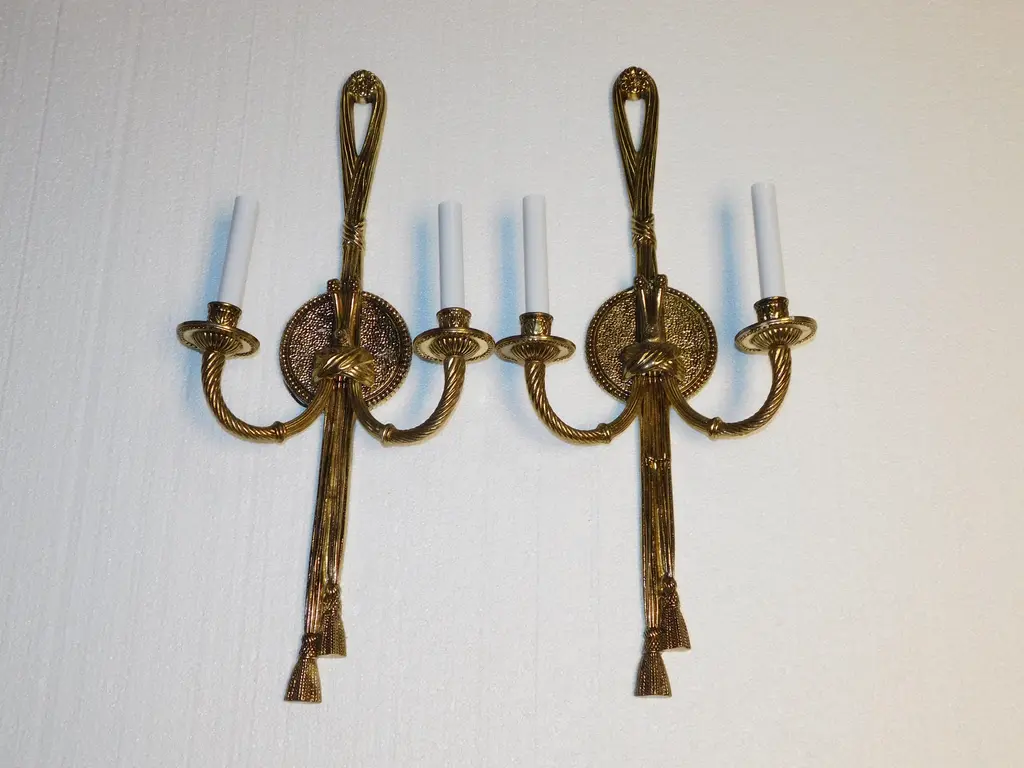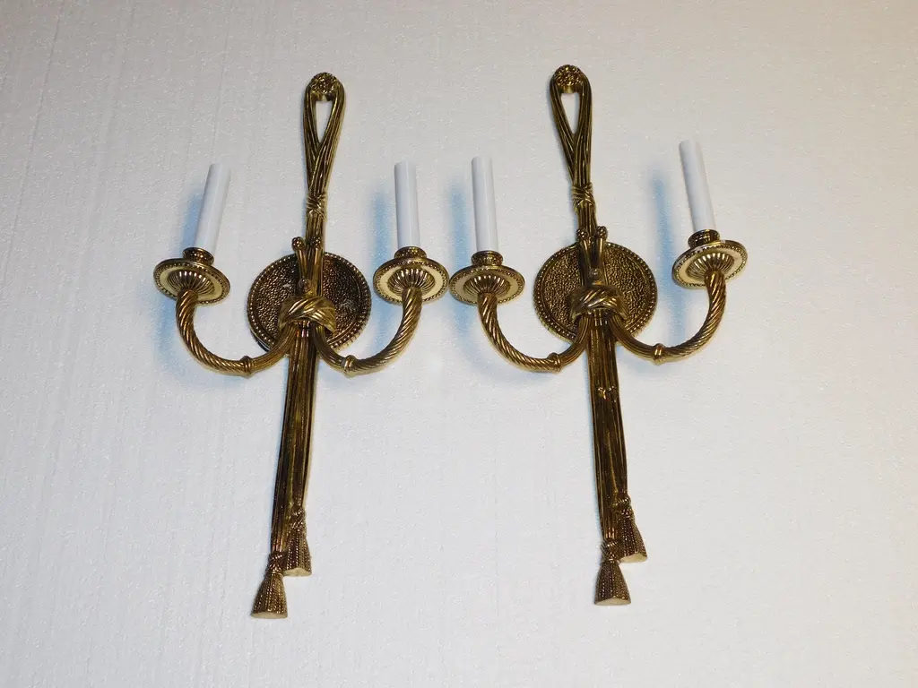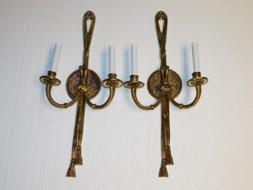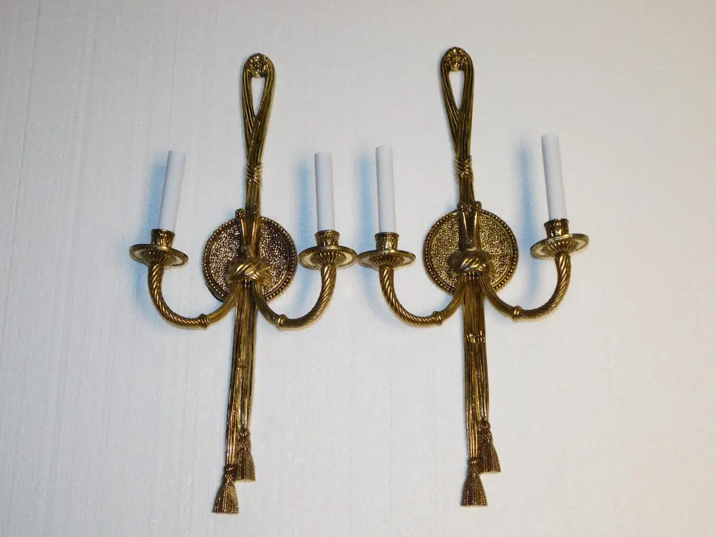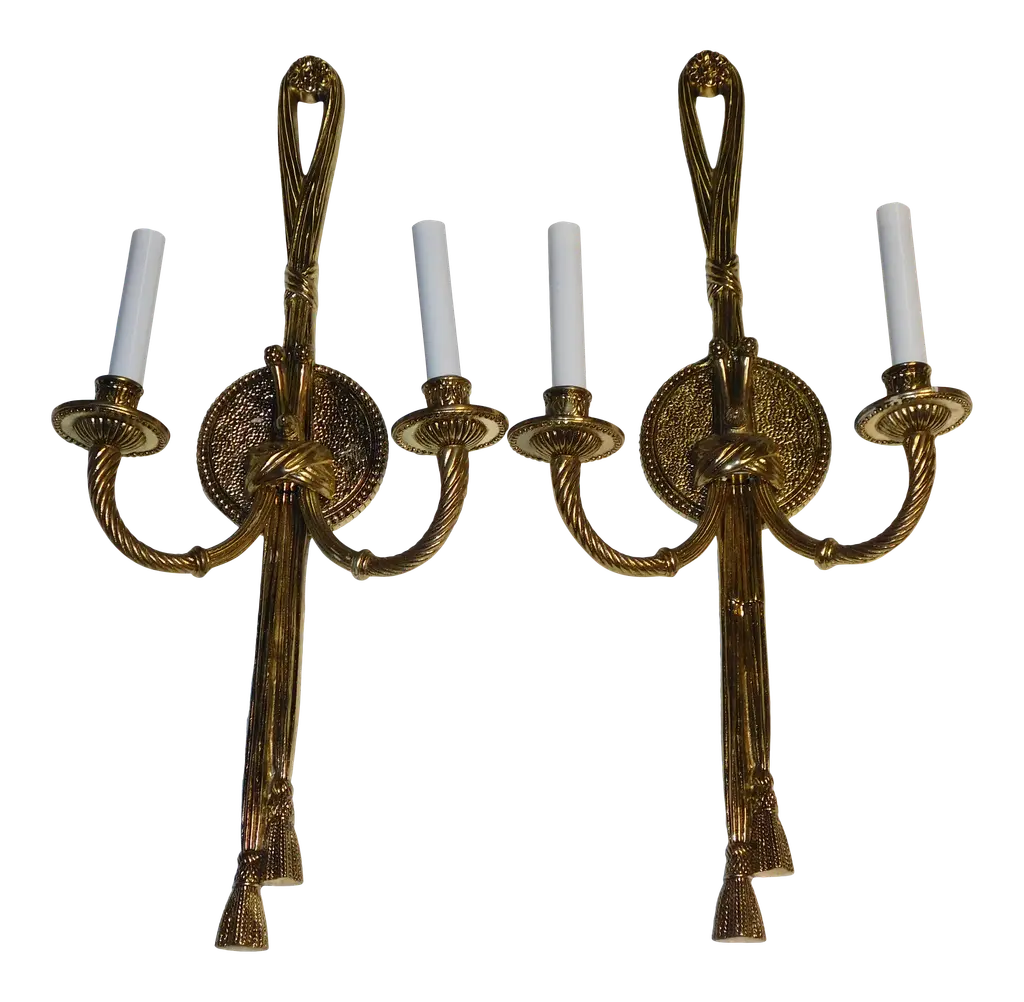 Pair French 2 Arm 2 Lite Brass Neoclassical Wall Sconces We are offering a fabulous pair of Ribbons & Bows Tassel Sconces. The Sconces measure 25" Inches tall by 11 1/2" Inches wide and are 4" Inches deep from the wall. We are fortunate to have three pairs of these available should you have a need. The Sconces lite / work perfectly. You won't be disappointed.