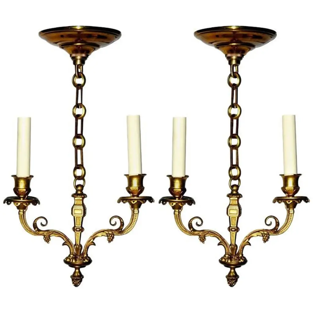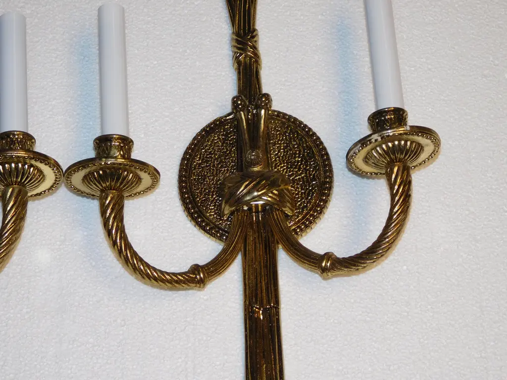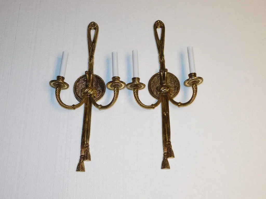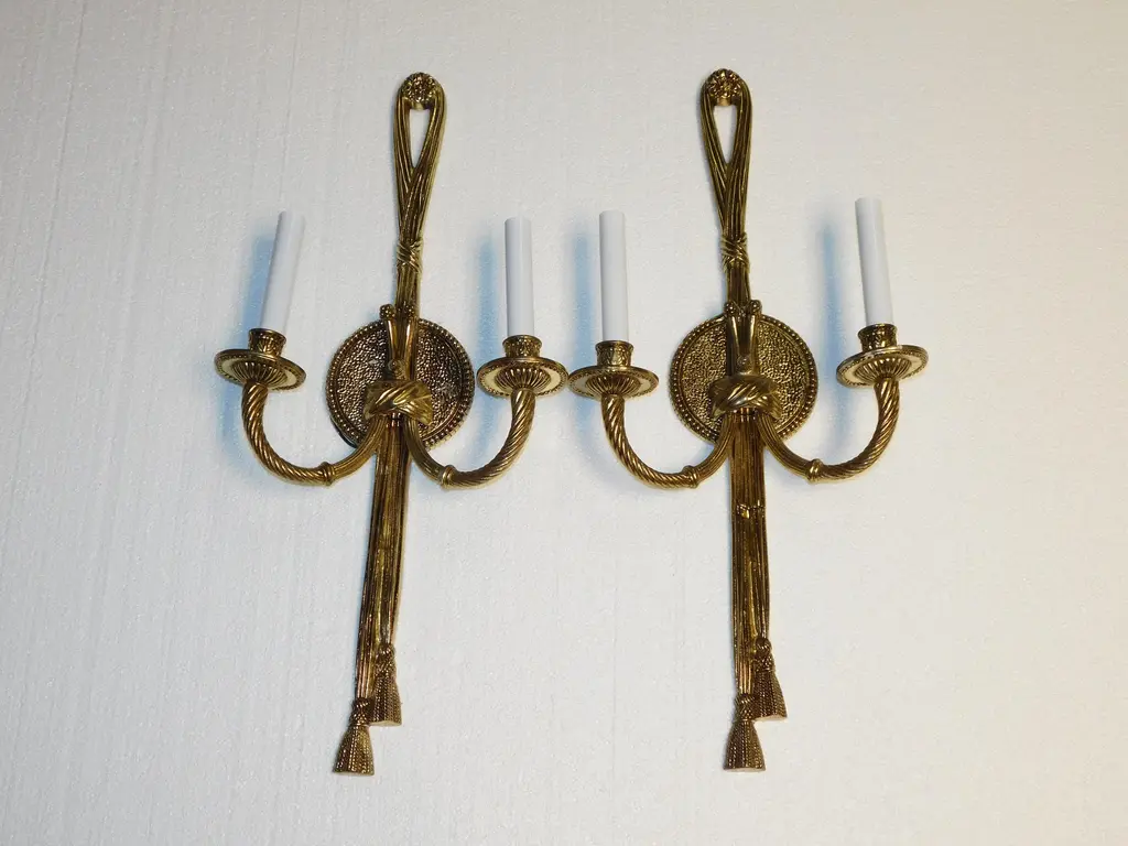 Pair French 2 Arm 2 Lite Brass Neoclassical Wall Sconces We are offering a fabulous pair of Ribbons & Bows Tassel Sconces. The Sconces measure 25" Inches tall by 11 1/2" Inches wide and are 4" Inches deep from the wall. We are fortunate to have three pairs of these available should you have a need. The Sconces lite / work perfectly. You won't be disappointed.
