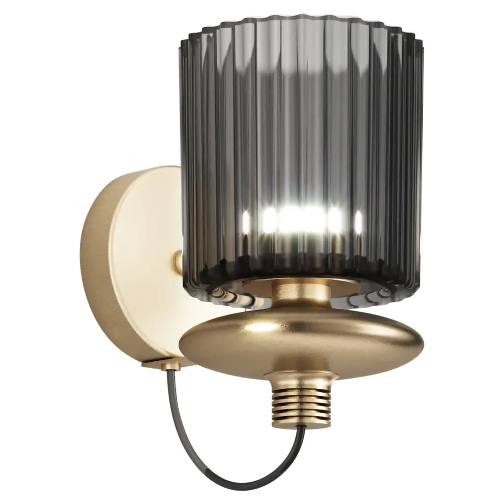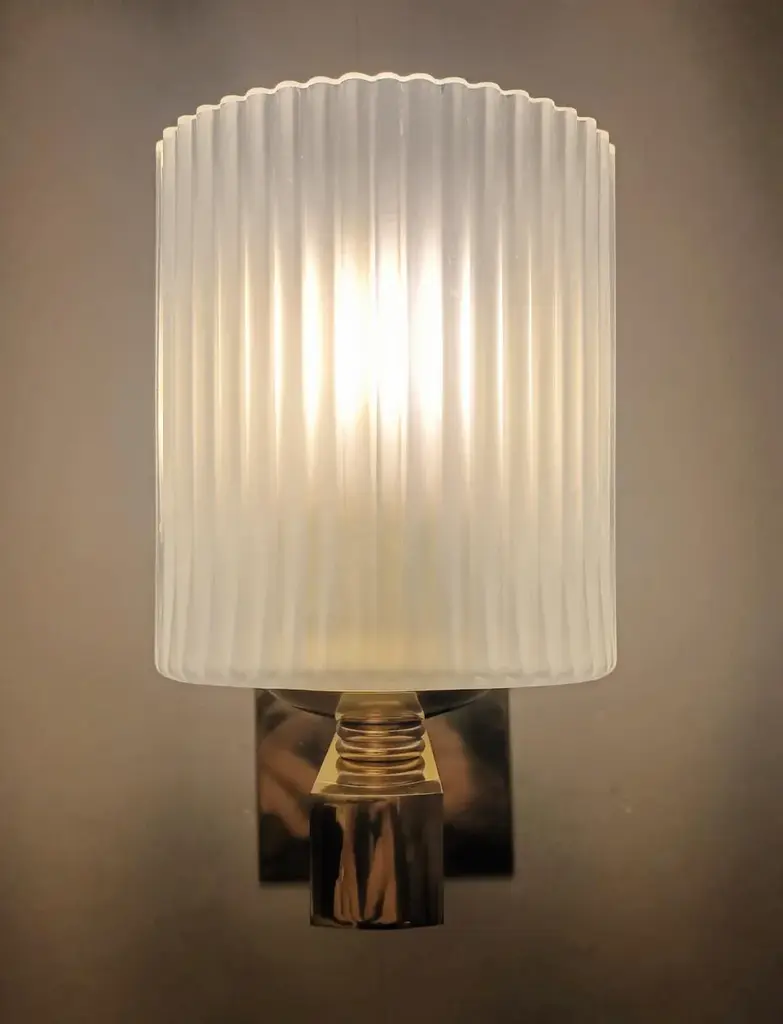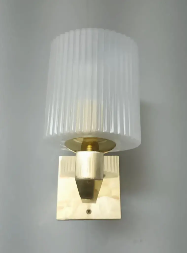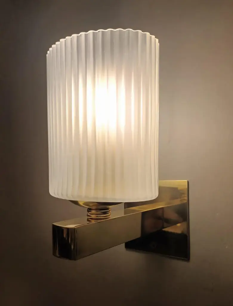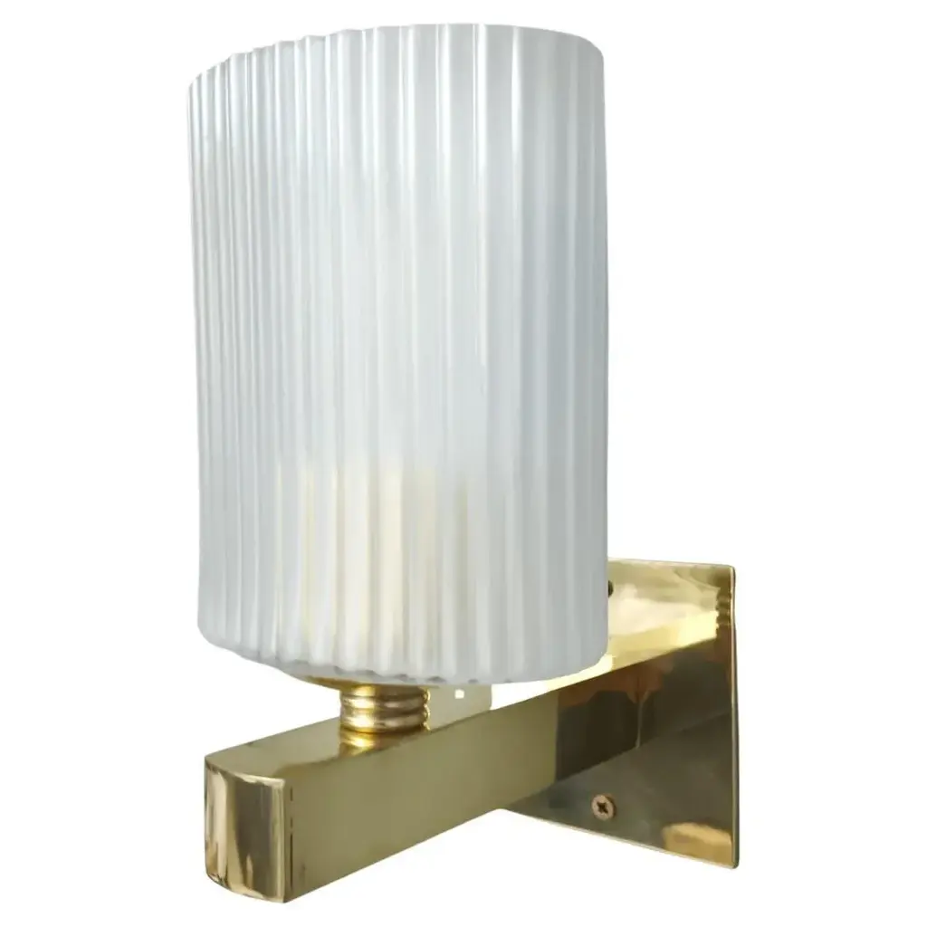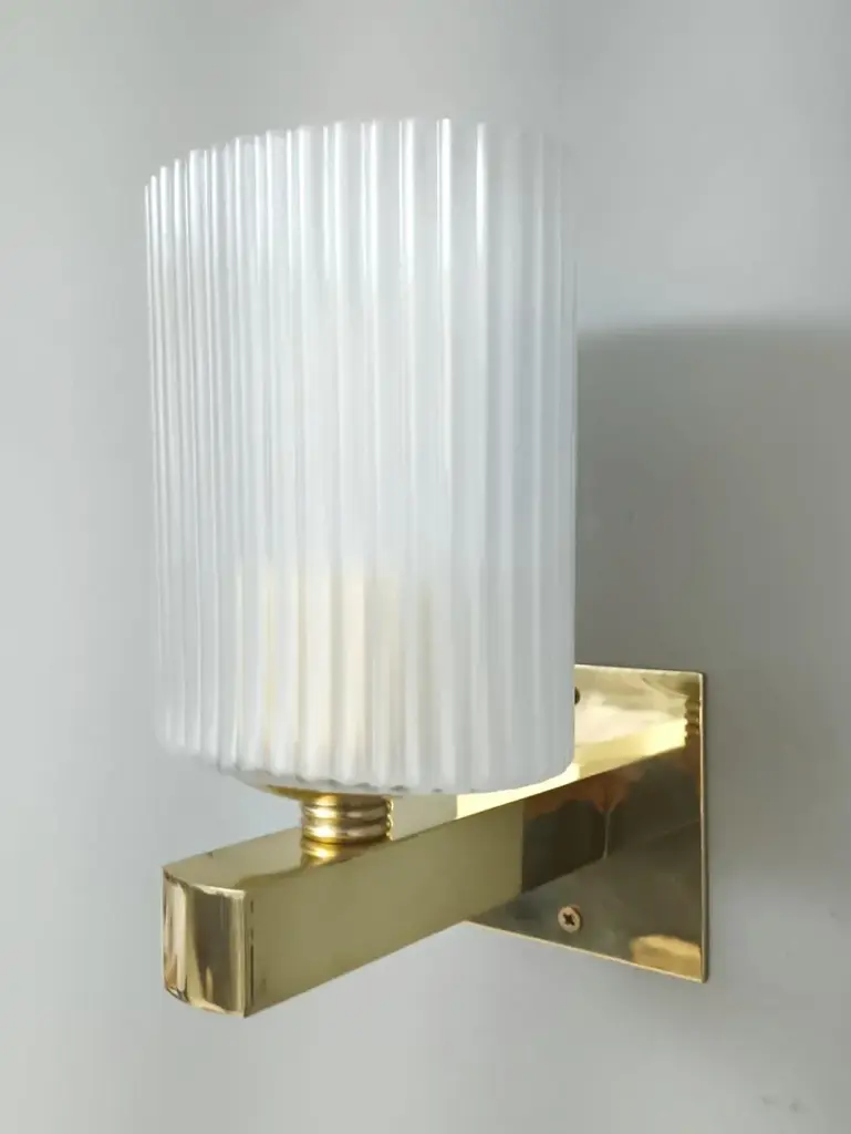 Italian wall lights with frosted white ribbed Murano glass shades mounted on brass frames / Made in Italy, circa 1950s. 1 light / E26 or E27 type / max 60W