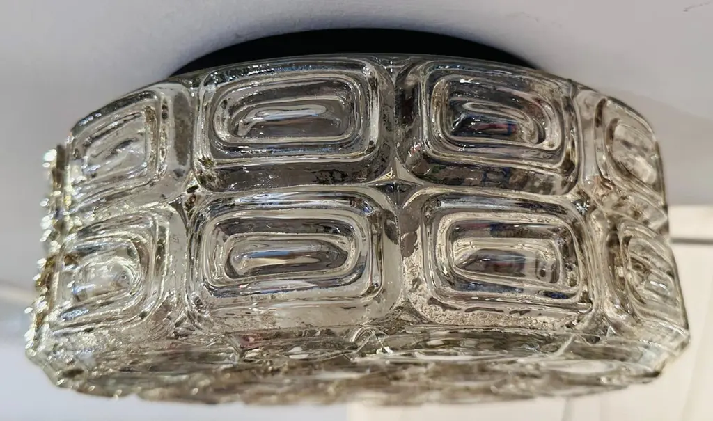 1960s vintage German WILA round clear glass shade and metal flush mount ceiling or wall light. The round shade is fixed to the round black metal bulb holder with a single screw holding it in place. The design features geometric squares set within another square with corresponding geometric rectangles on the side resulting in a seventies retro feel to the design. A single E27/E26 Edison screw in lightbulb is required. Rewired and in full working order.Price is for one. Six available. The lights all come in their original manufacturer's boxes.Dimensions: Diameter: 24cm Height: 12cm