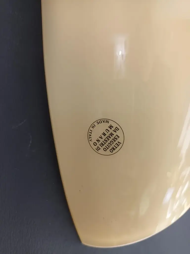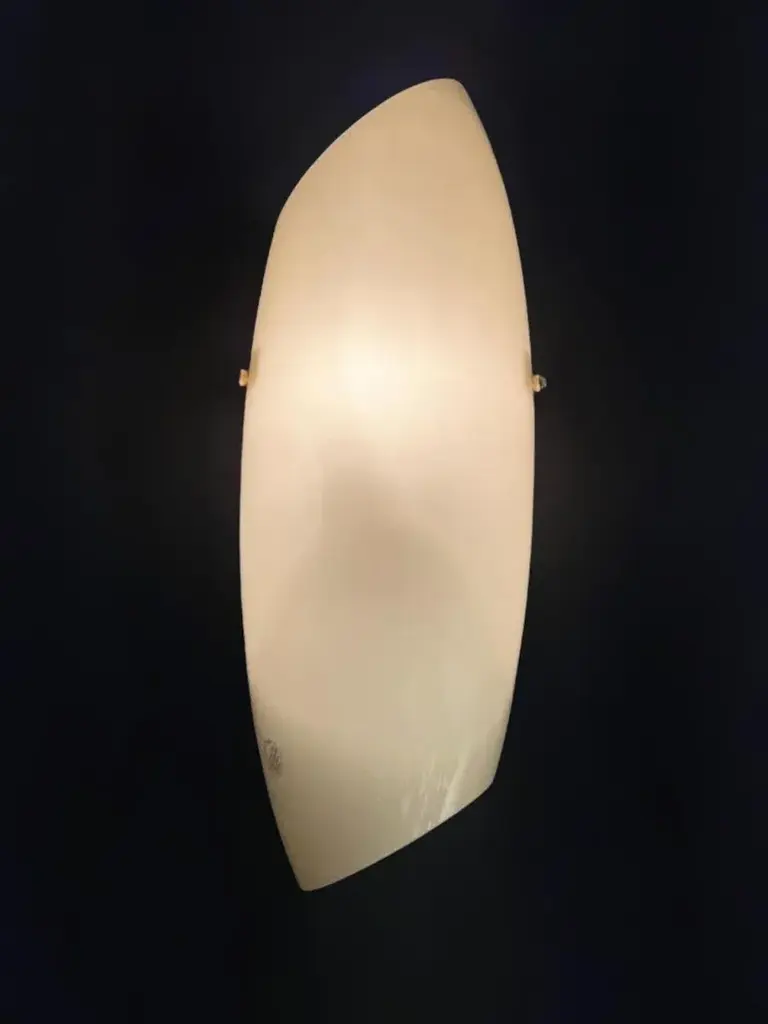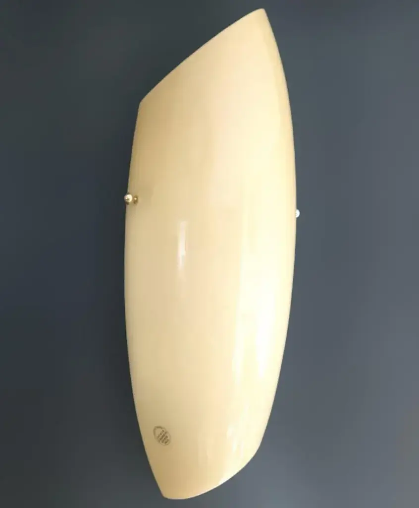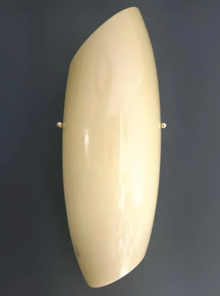 Italian wall light with creamy yellow Murano glass shade in the shape of shell, mounted on white metal frame / Made in Italy in the style of Vistosi, circa 1960s 1 light / E26 or E27 type / max 60W