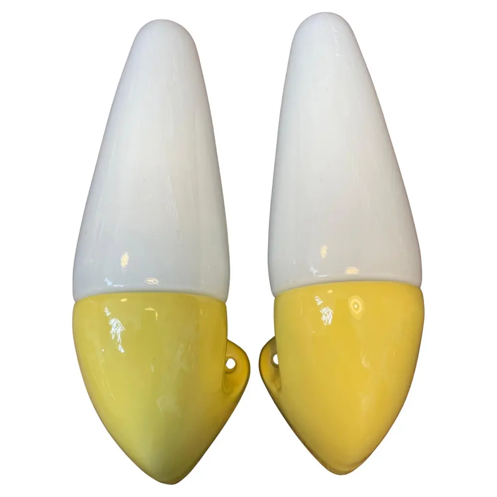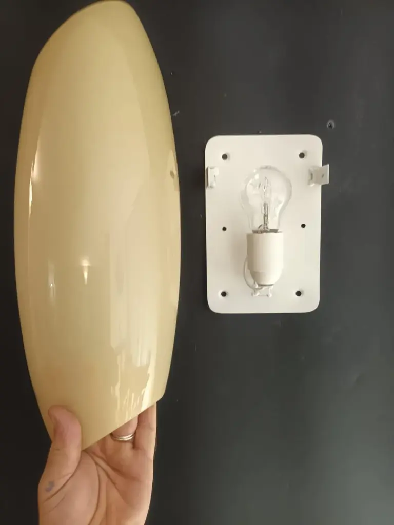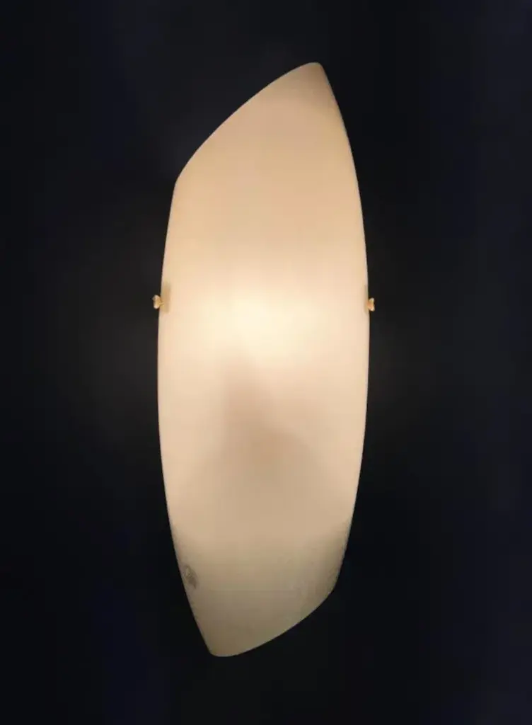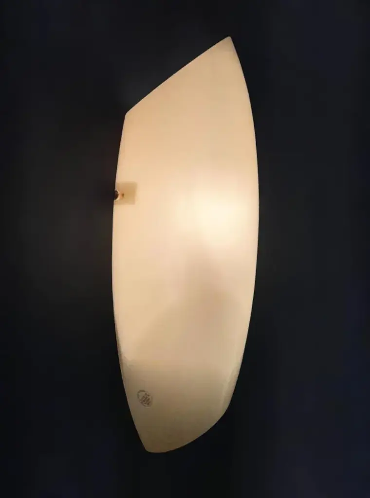 Italian wall light with creamy yellow Murano glass shade in the shape of shell, mounted on white metal frame / Made in Italy in the style of Vistosi, circa 1960s 1 light / E26 or E27 type / max 60W