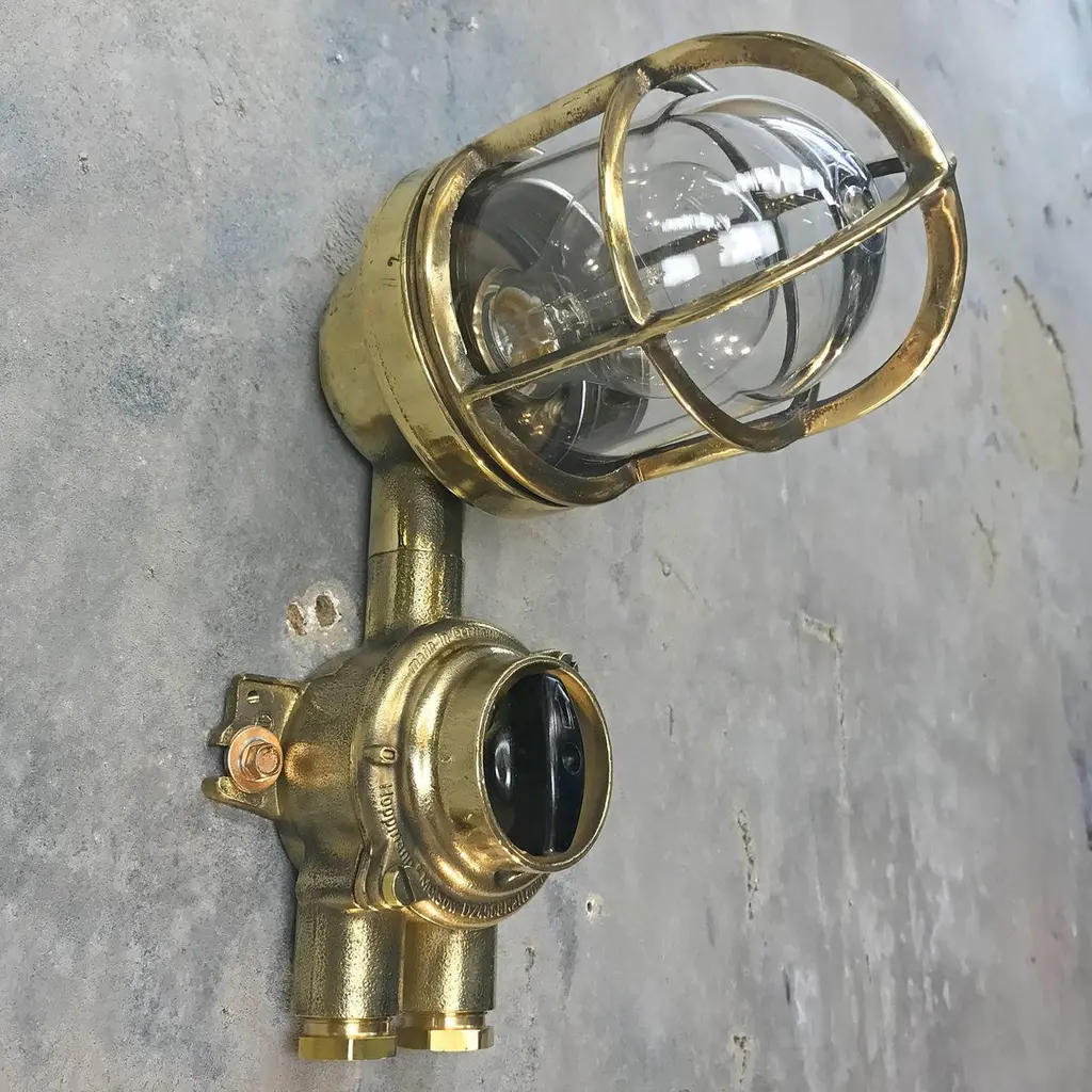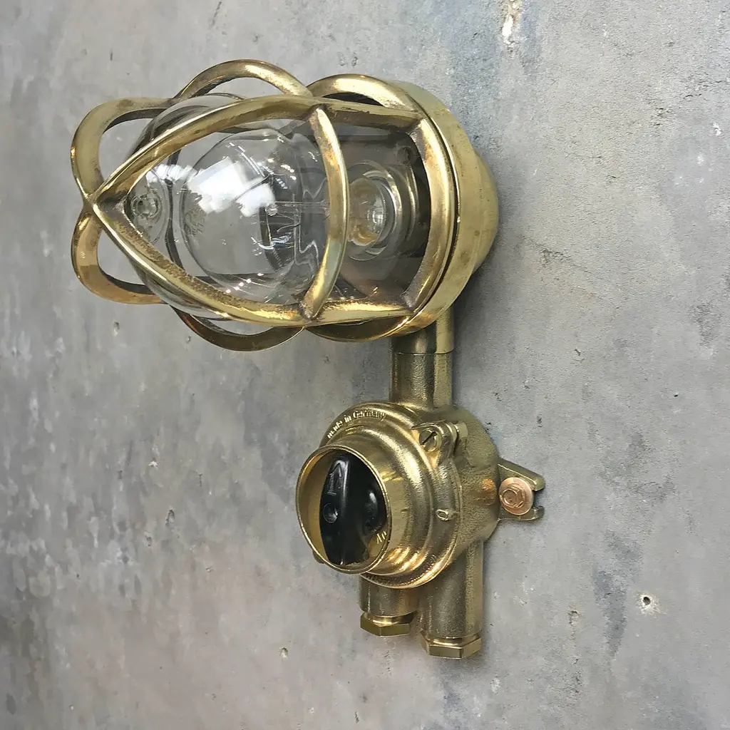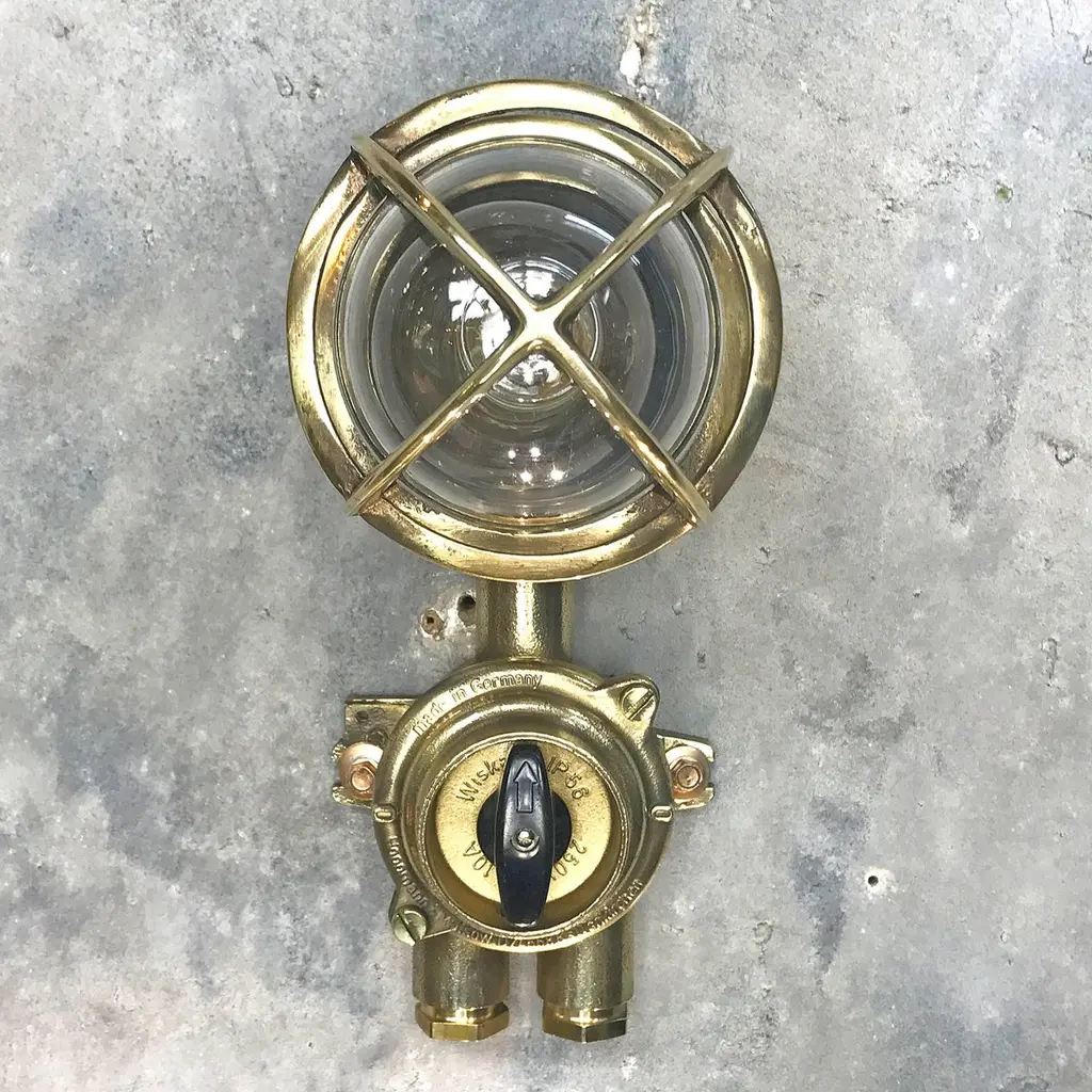 1970's German Brass Wall Lamp With Glass Dome & Isolator Switch Ip54 Edison Bulb