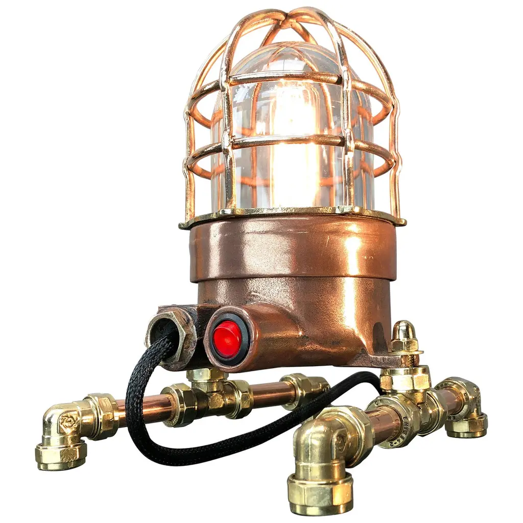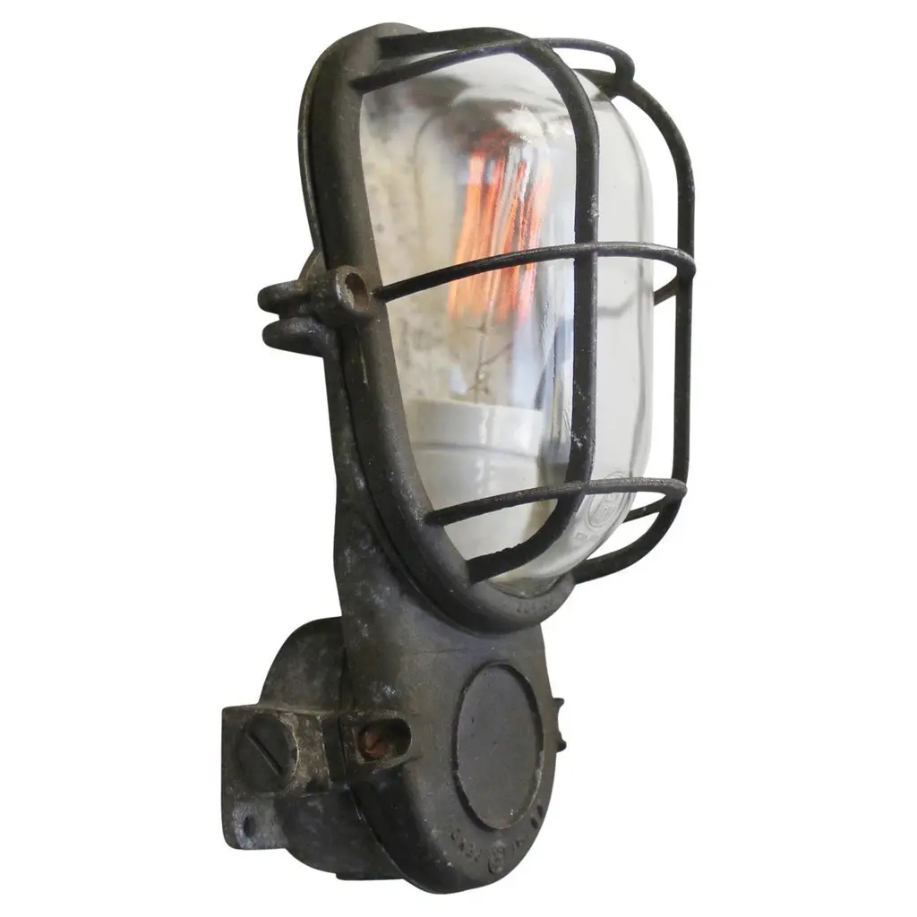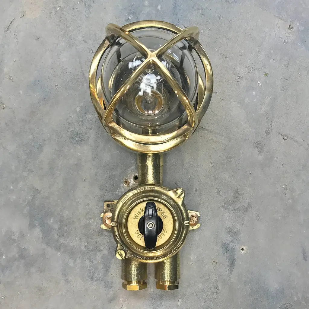 This is a very stylish 90 degree wall light, sold ready for use with a 40watt E27 vintage filament bulb fitted manufactured by Wiska.Reclaimed from military vessels mainly marine minesweeper ships.The light features its own water proof isolator switch!They look great in pairs in porches, conservatories, chimney breasts, hallways etc and you can create a warm atmosphere when used in dining and lounge areas domestic and commercial.They mount on the wall using the two holes on the mount plate which is a very quick and easy installation!Made from solid brass cast they are quite substantial weighing 2kg.To replace the lamp the cage turns smoothly and detaches, this leaves the glass dome exposed which also turns to reveal the bulb.Measures: Height - 22cm.Diameter of mount plate - 12cm.Depth - 22cm.