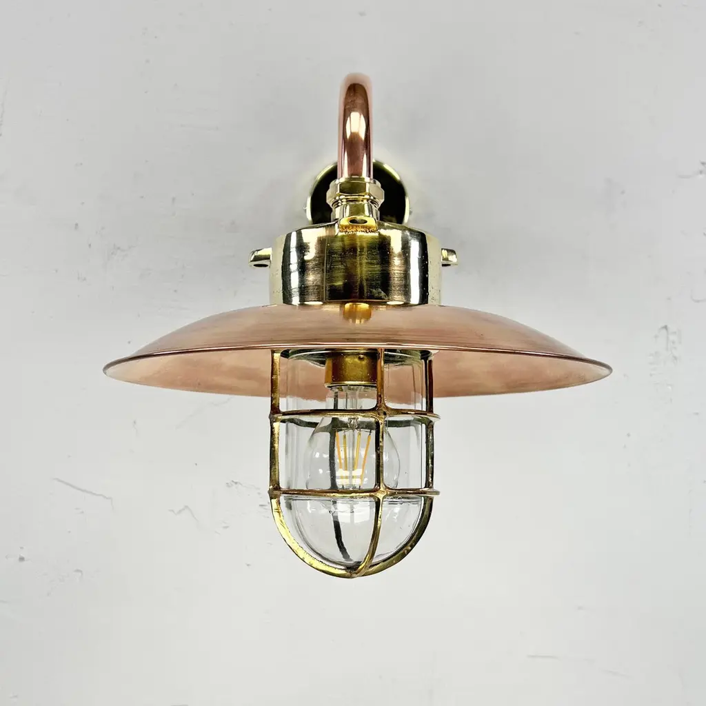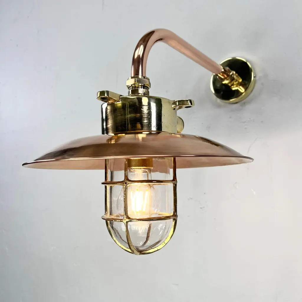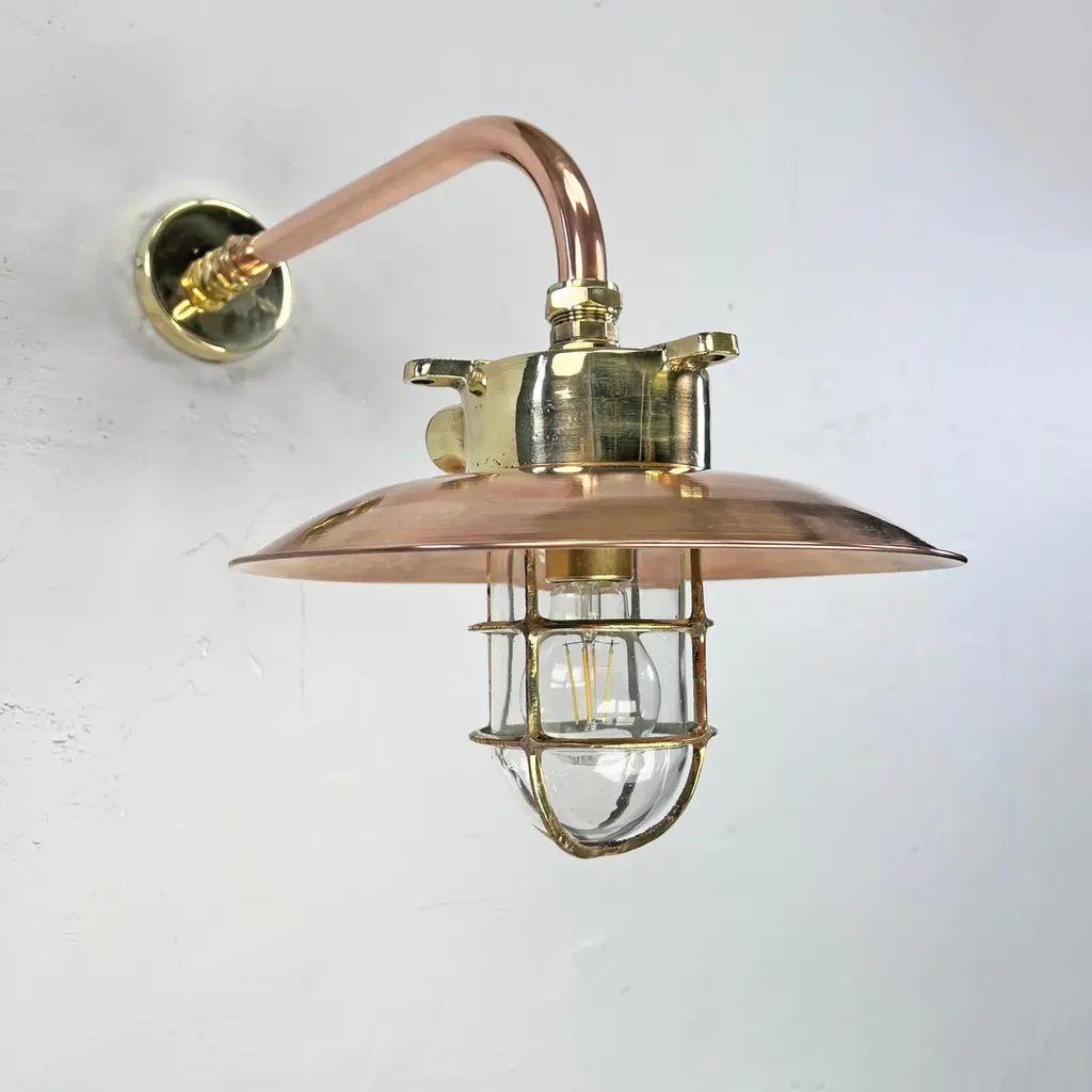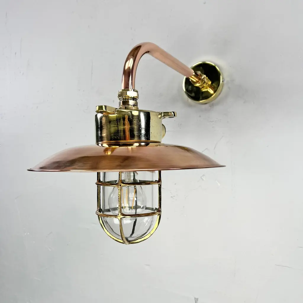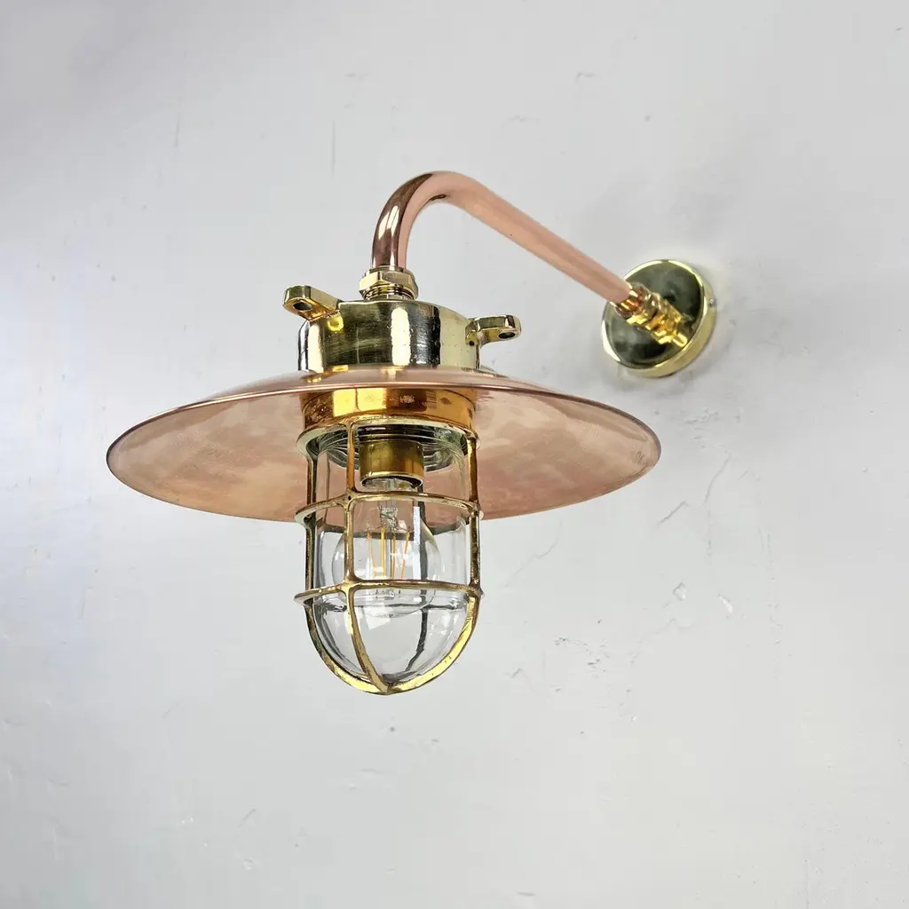 An industrial brass explosion proof wall light fixture with a bespoke brass and copper cantilever arm.The lamp was originally made in Japan which was reclaimed from decommissioned cargo ships made during the 1970s. This fixture has been professionally restored and converted into a wall light fixture by hand in UK by Loomlight ready for use in modern interiors.Full of industrial style with a protective brass cage, copper shade and copper wall arm this wall lamp is beautifully restored for modern interiors. Specifications:Width 30cmHeight 43cmWall to tip of shade 50cmWeight: 5kgBulb: E27 40w Edison filament lamp (60w can be used). Compatible with LED bulbs.Cantilever sizes can also be made to specification. All lights are professionally re-wired in-house to exceed British standards using CE approved components. Dimensions and weights are approximate. For all orders to USA, UL listed bulb holders will be fitted. All lights are sold ready for use in your home or commercial installation. For any specific requirements please get in touch. We are happy to discuss your individual project.