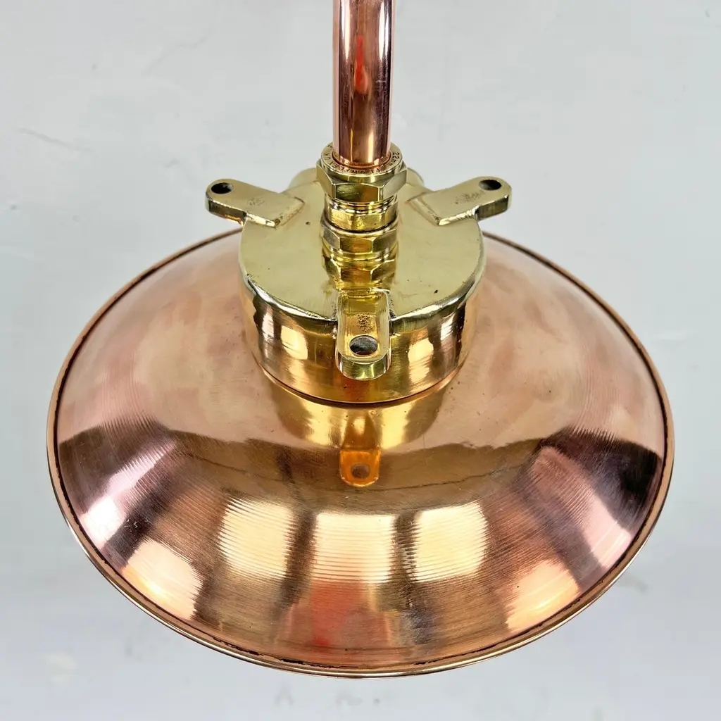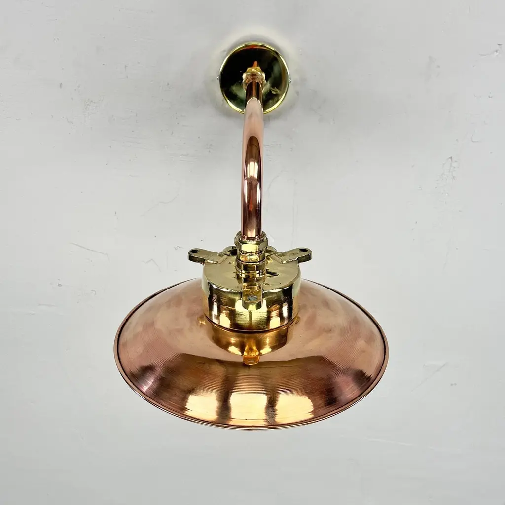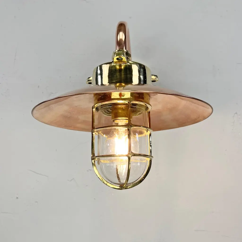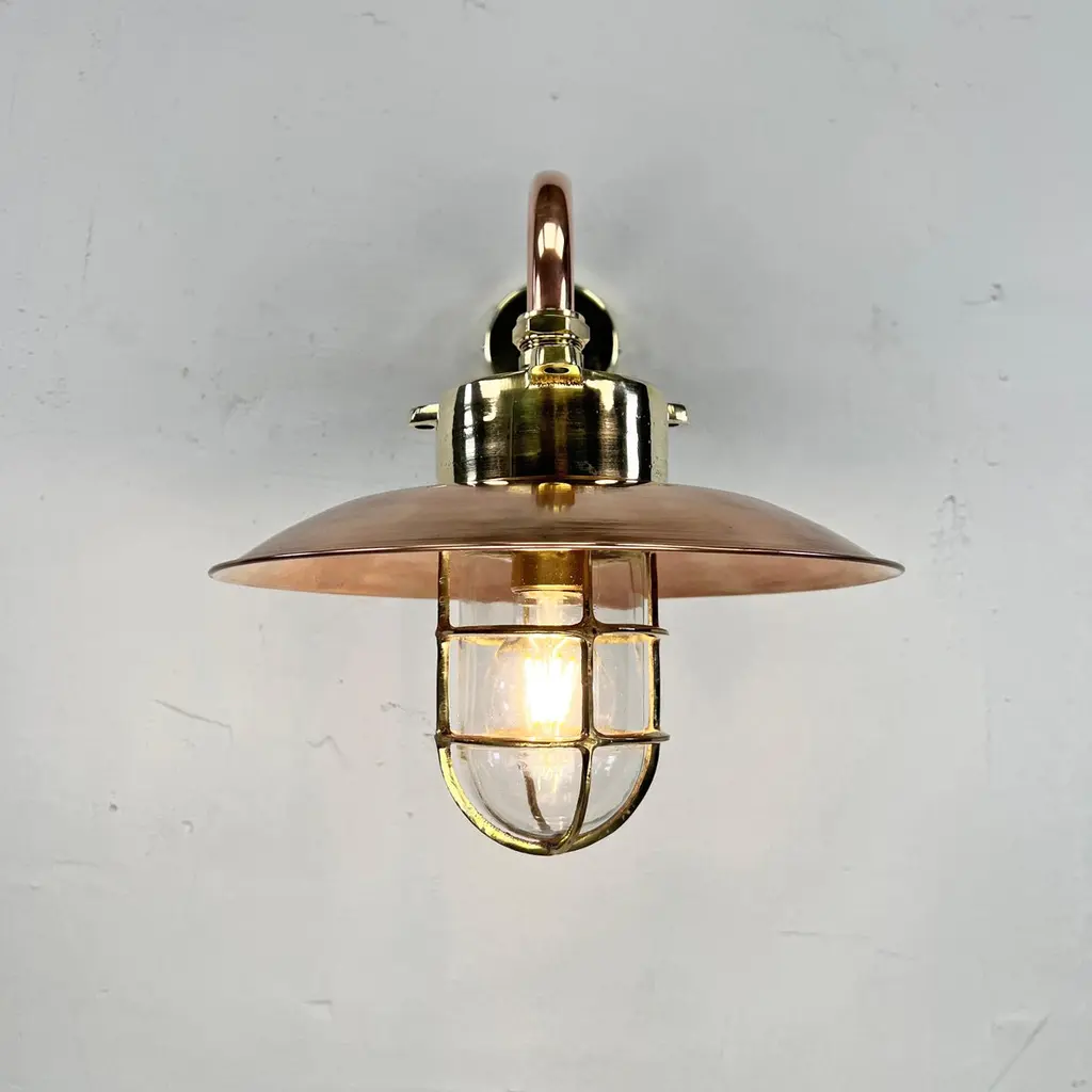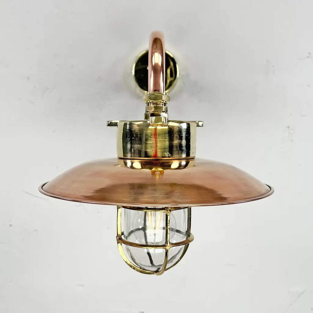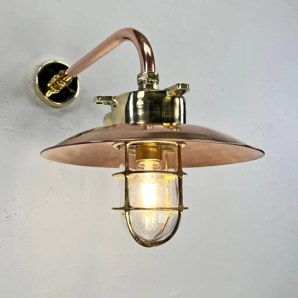 An industrial brass explosion proof wall light fixture with a bespoke brass and copper cantilever arm.The lamp was originally made in Japan which was reclaimed from decommissioned cargo ships made during the 1970s. This fixture has been professionally restored and converted into a wall light fixture by hand in UK by Loomlight ready for use in modern interiors.Full of industrial style with a protective brass cage, copper shade and copper wall arm this wall lamp is beautifully restored for modern interiors. Specifications:Width 30cmHeight 43cmWall to tip of shade 50cmWeight: 5kgBulb: E27 40w Edison filament lamp (60w can be used). Compatible with LED bulbs.Cantilever sizes can also be made to specification. All lights are professionally re-wired in-house to exceed British standards using CE approved components. Dimensions and weights are approximate. For all orders to USA, UL listed bulb holders will be fitted. All lights are sold ready for use in your home or commercial installation. For any specific requirements please get in touch. We are happy to discuss your individual project.
