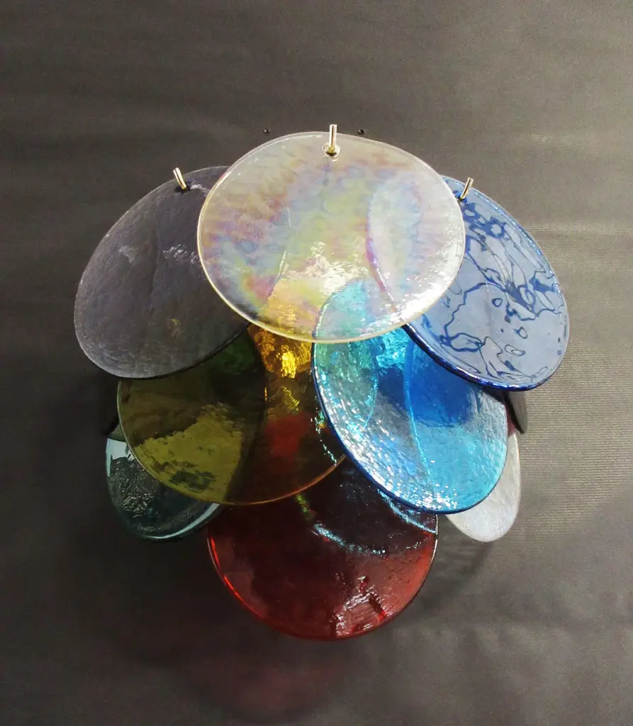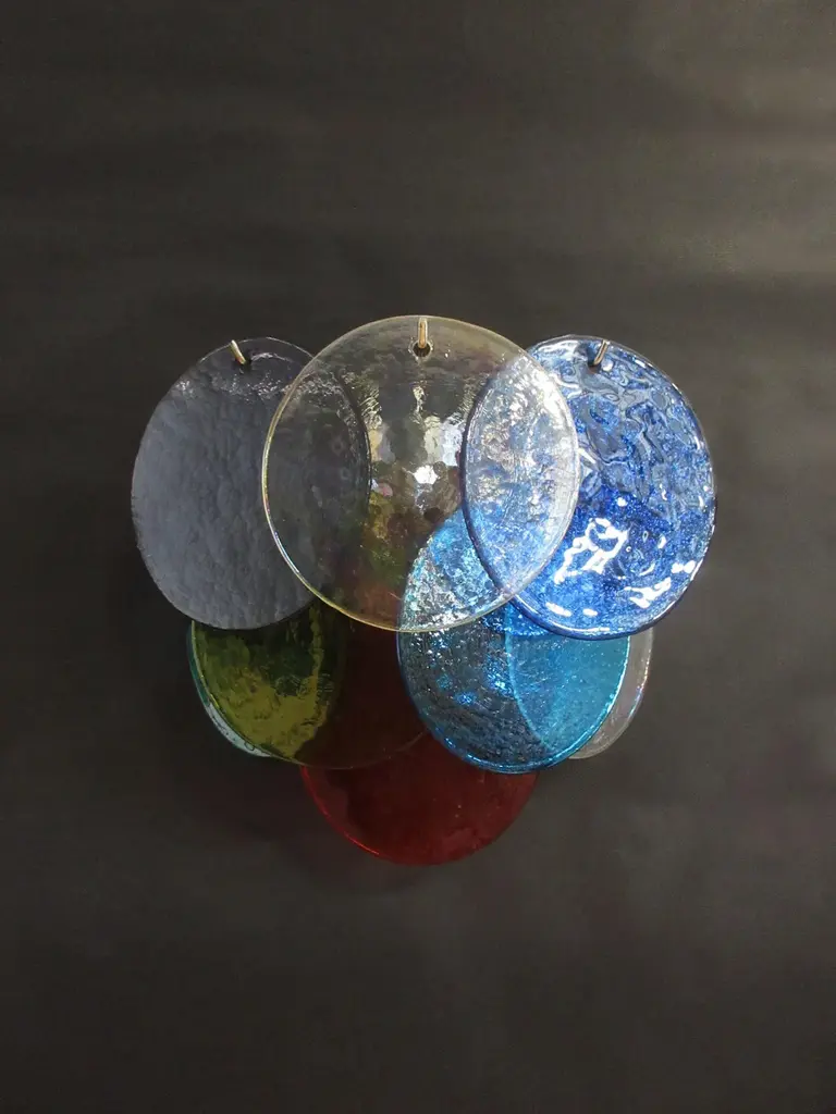 ORIGINAL MURANO GLASS AVAILABLE IN OTHER COLORS MAKE IT THE COLOR COMBINATION YOU LOVE Pair of Italian Murano appliques in Vistosi style. Wall lights have 10 glass for each, multicolored. Nickel metal frame. Style period: late XX century Dimensions: 11 inches (28 cm) height; 13,40 inches (34 cm) width; 7,10 inches (18 cm) depth from the wall. Dimension glasses: 5,50 / 6,10 inches (14 / 15,5 cm) diameter (the diameter and thickness of the glass varies from each other, of glass concerned handmade) Light bulbs: 2 light bulb for each applique, E14 dimension (not included in the sale) Electrical System US/EU/AU