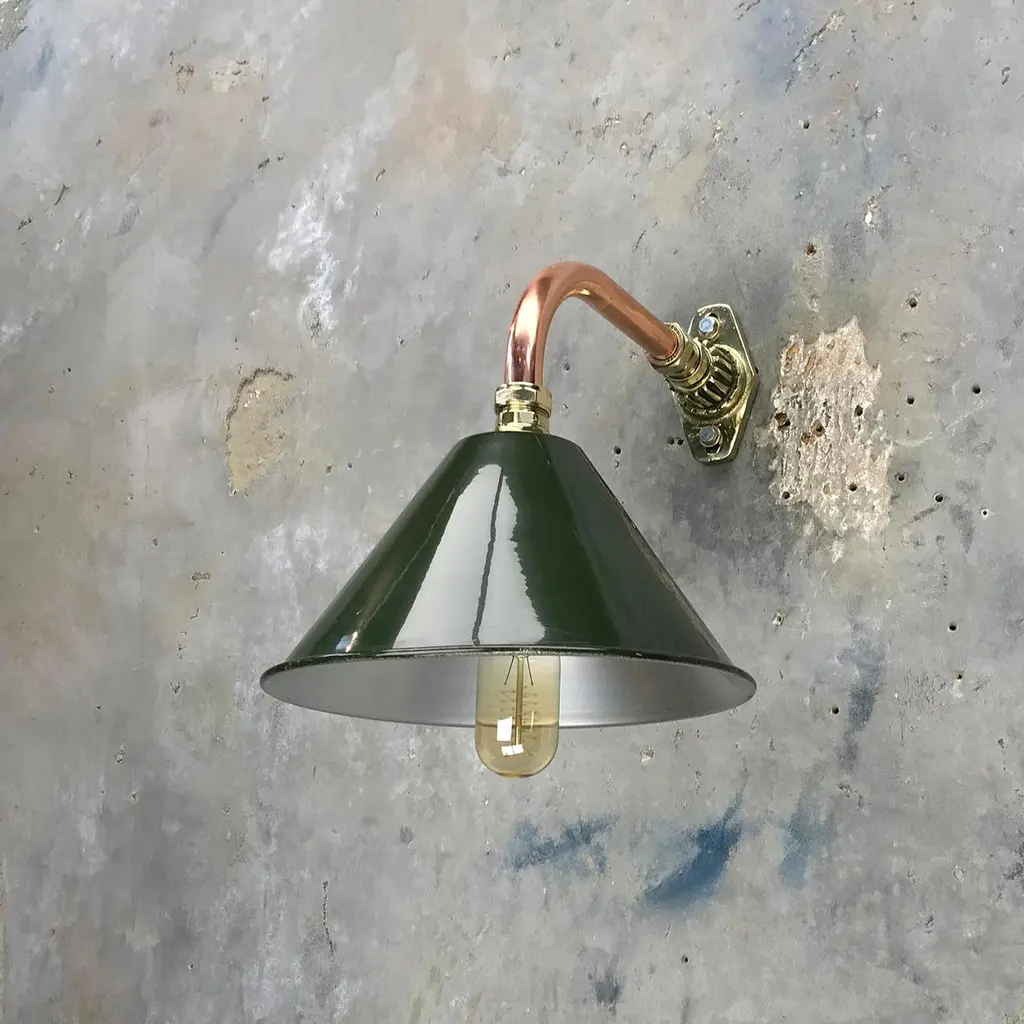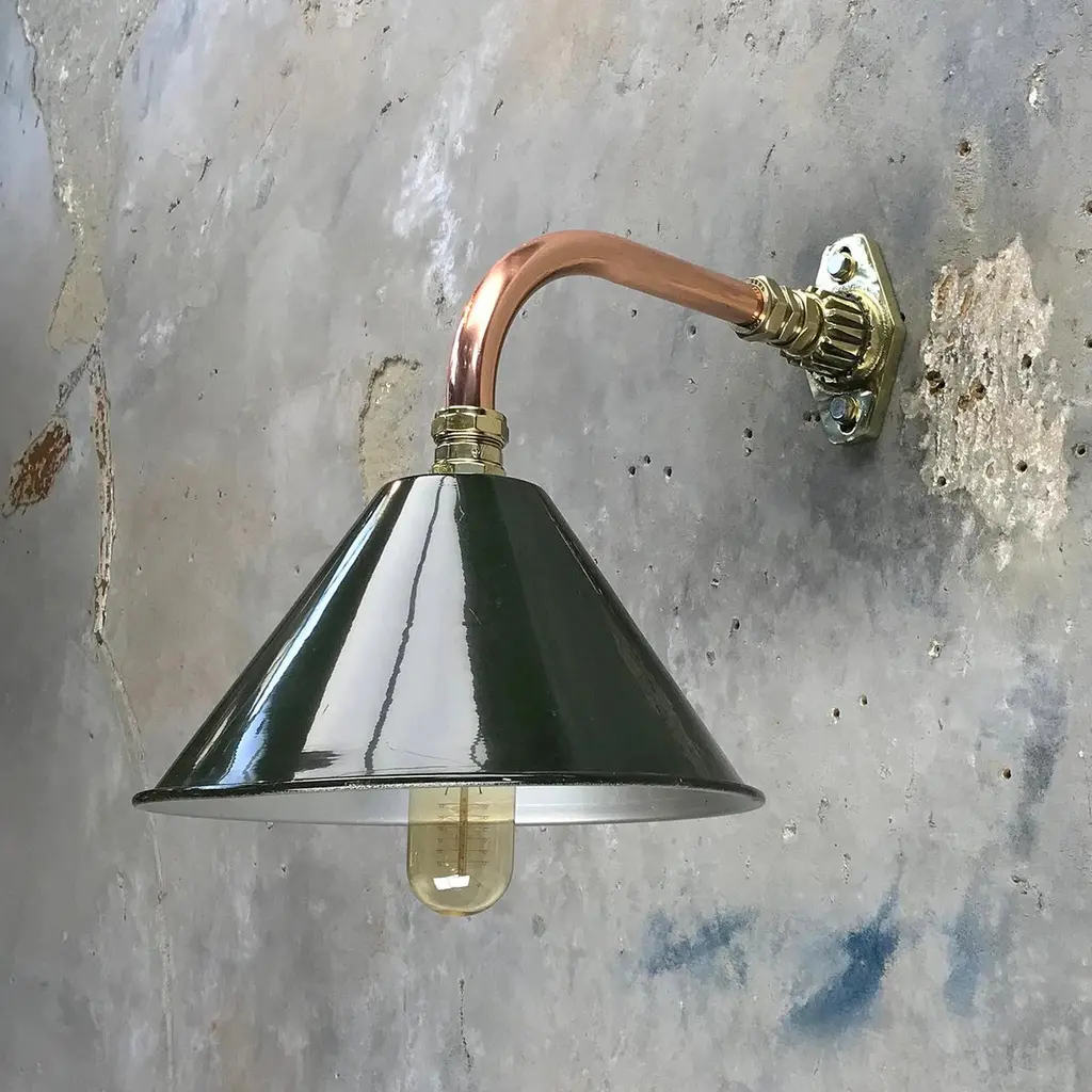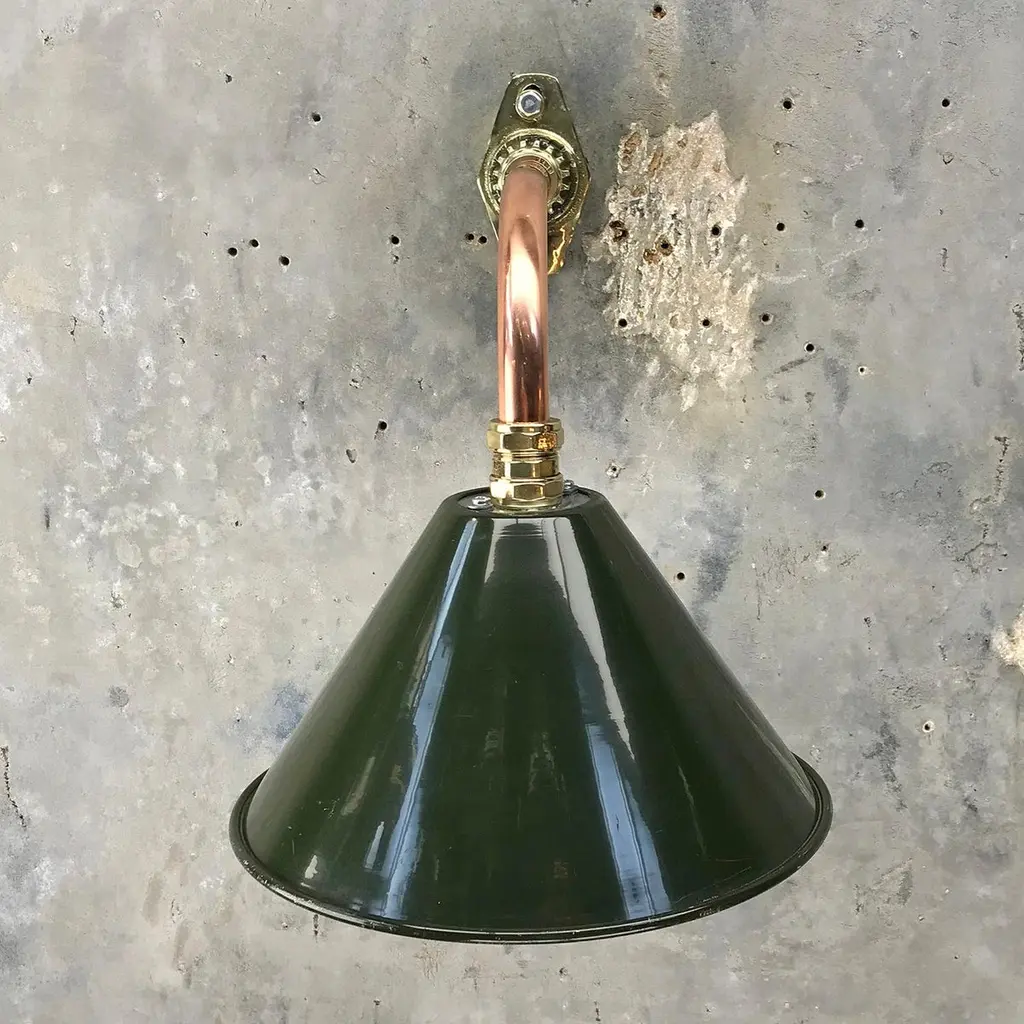 Ex British army festoon lamp shade fitted to a copper and brass cantilever fitting.At Loomlight we have fabricated a copper and brass cantilever wall mount and we can offer customised dimensions for the reach of the lamp from the wall, we can also finish the shade in your choice of color.This great for lighting pictures on the wall or lighting workbenches or desks where functional lighting is required. They also work great as bedside lamps.Dimensions:Width of shade - 23cmReach from wall - 38cmBulb - E26 / E27 100v - 220v.