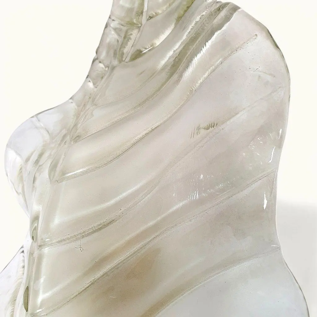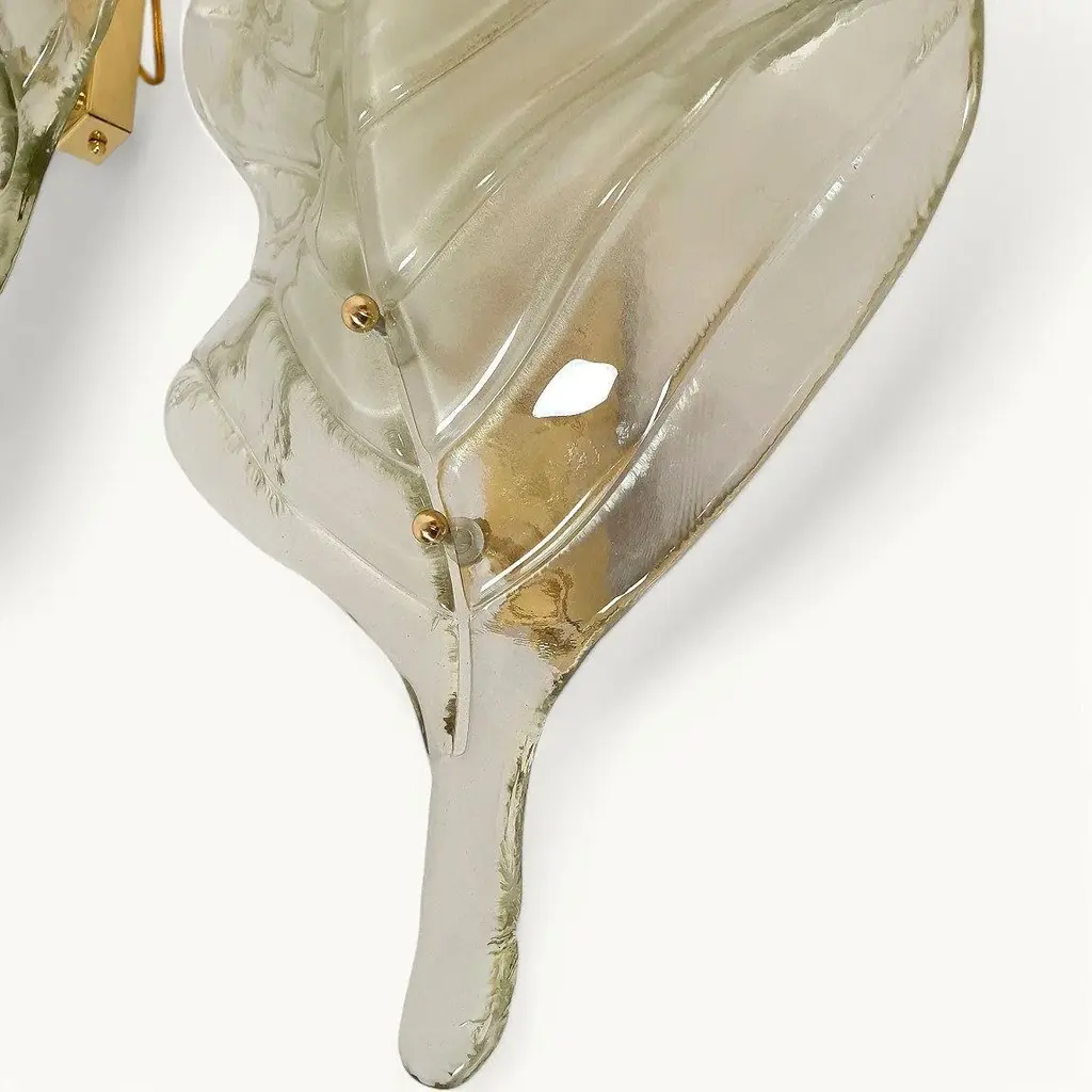 Pair of large Mid-Century Modern light green Murano glass sconces, Mazzega style, Italy 1980s. Two pairs of sconces available - Set of four sconces. Sold and priced in pair. To inquire about the set of 4, chose 2 items in the menu. The large Italian sconces are made of a handmade Murano glass, in a very light olive green color. The sconces shape is like a leaf, or even a shell. The mounts are in brass. Each sconce has1 light and is professionally rewired using a Medium base, or E26 socket. (very commun in the US) Complimentary rewiring for Europe upon request. The center of the leaf sconce is frosted inside and clear on the border. It creates a translucent effect and a beautiful halo of light when lit. The Italian large Murano glass sconces are in excellent condition.