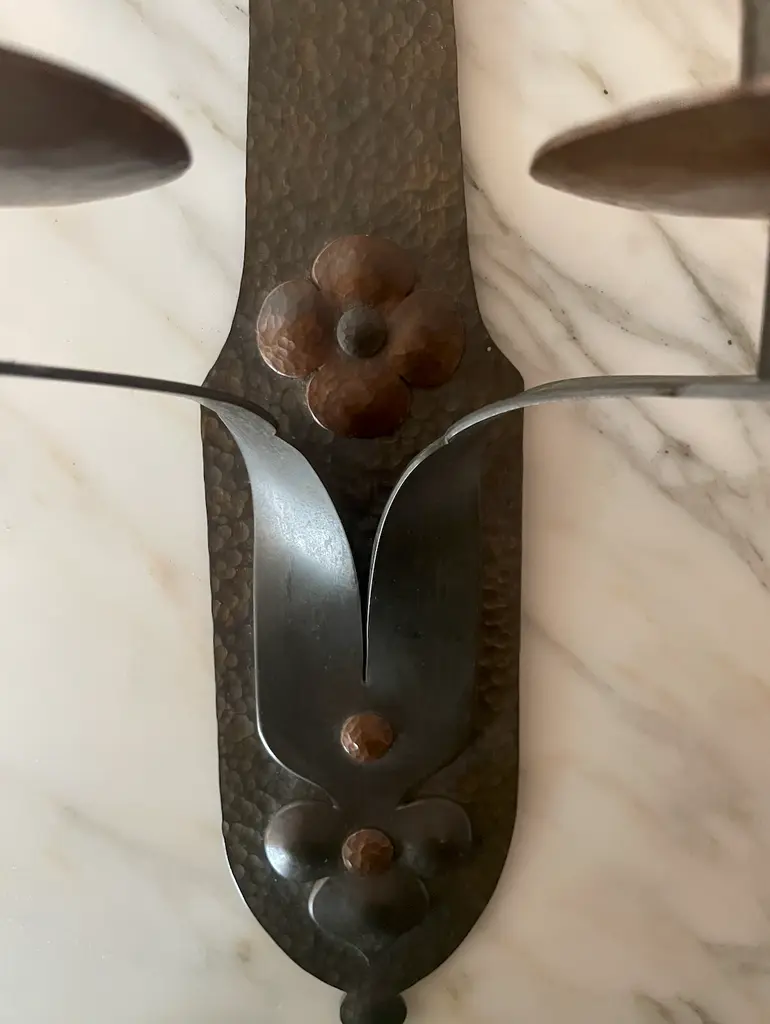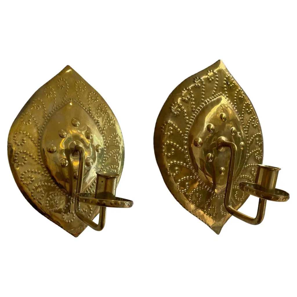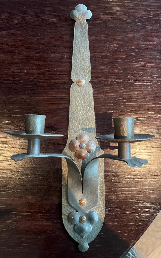 Set of two vintage, unique arts and crafts style brass and copper hand-hammered candle holder sconces. Hook on back for hanging.