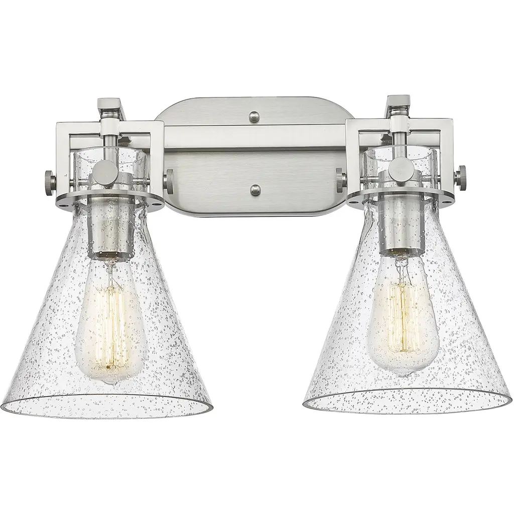 INNOVATIONS 423-2W-SN-G423-7DE Pilaster II Cylinder 2 15 inch Bath Vanity Light Satin Nickel. Style: Contemporary, Farmhouse, Restoration-Vintage. Collection Name: Downtown Urban. Metal Finish(Body): Satin Nickel. Material: Steel, Cast Brass, Glass. Dimension(in): 10.5(H) x 15(W) x 7.75(Ext). Bulb: (2)6W LED(Included). Voltage: 120. Dimmable: Yes. Color Temperature (Kelvin): 2700. Color Rendering Index (CRI): 90. Lumens: 750. Life Expectancy (Hours): 15000. Glass Shade Description: Deco Swirl Pilaster II Cylinder. Glass Type: Transparent. Shade Shape: Cylinder. Glass or Metal Shade Color: Deco Swirl. Shade Material: Glass. Shade Dimension(in): 3.875(W) x 7(H). ADA Compliant: No. California Proposition 65 Warning Required: Yes. UL/ETL Certification Type: Damp Location.