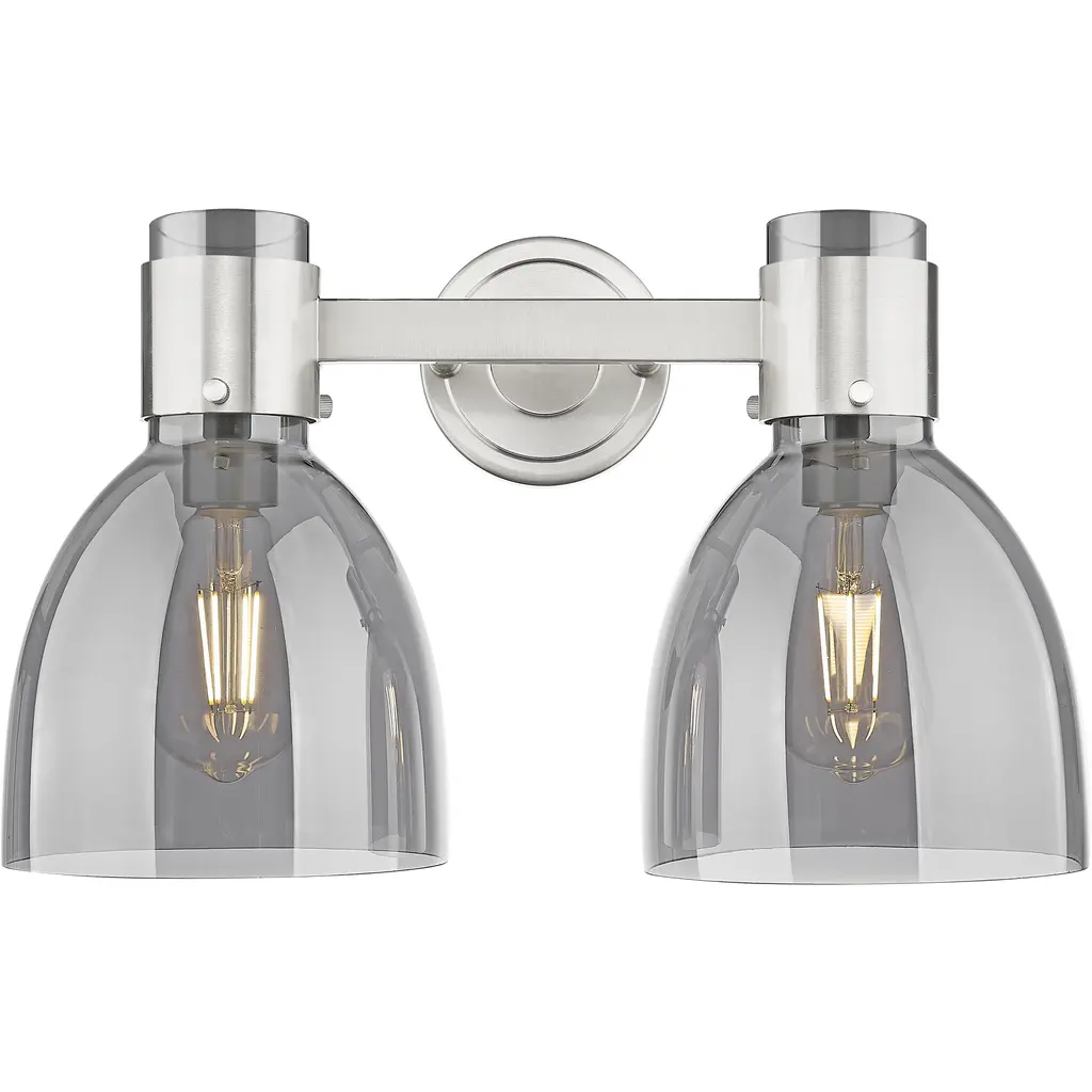 INNOVATIONS 410-2W-SN-G410-7SM Newton Sphere 2 17 inch Bath Vanity Light Brushed Satin Nickel. Style: Industrial, Farmhouse, Restoration-Vintage, Transitional . Collection Name: Newton. Metal Finish(Body): Brushed Satin Nickel. Metal Finish(Canopy/Backplate): Brushed Satin Nickel. Material: Steel, Cast Brass, Glass. Dimension(in): 11.625(H) x 17(W) x 8.875(Ext). Bulb: (2)60W Medium Base Incandescent(Not Included). Voltage: 120. Dimmable: Yes. Color Temperature (Kelvin): 2200. Color Rendering Index (CRI): 99.9. Lumens: 220. Life Expectancy (Hours): 2000. Glass Shade Description: Light Smoke Large Cone. Glass Type: Transparent . Shade Shape: Cone. Glass or Metal Shade Color: Light Smoke. Shade Material: Glass. Shade Dimension(in): 7(W) x 8.125(H). Canopy Dimension(in): 4.5(Dia). Backplate Dimension(in): 4.5(Dia) x 0.75(Depth). ADA Compliant: No. California Proposition 65 Warning Required: Yes. UL/ETL Certification Type: Damp Location.