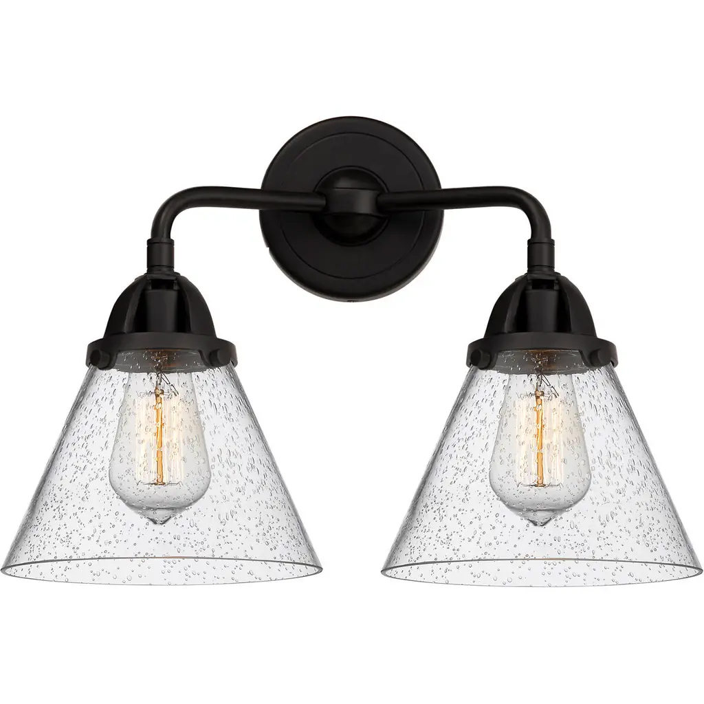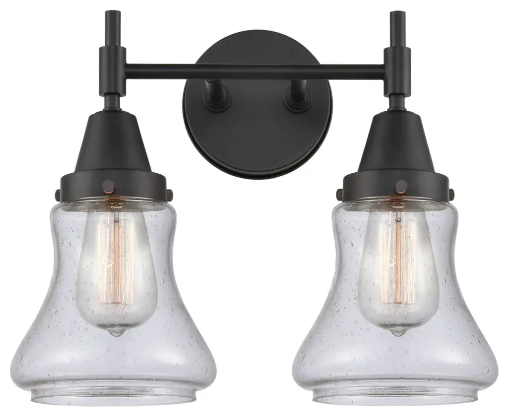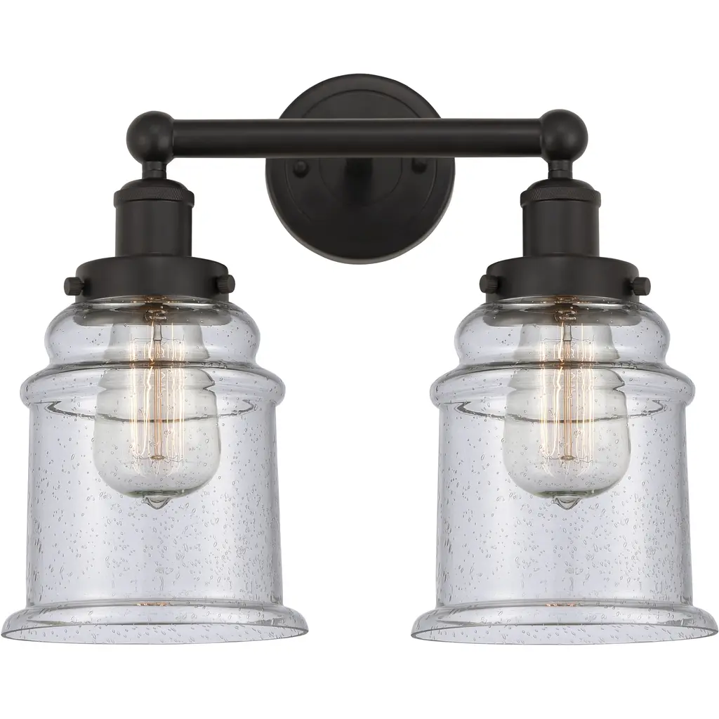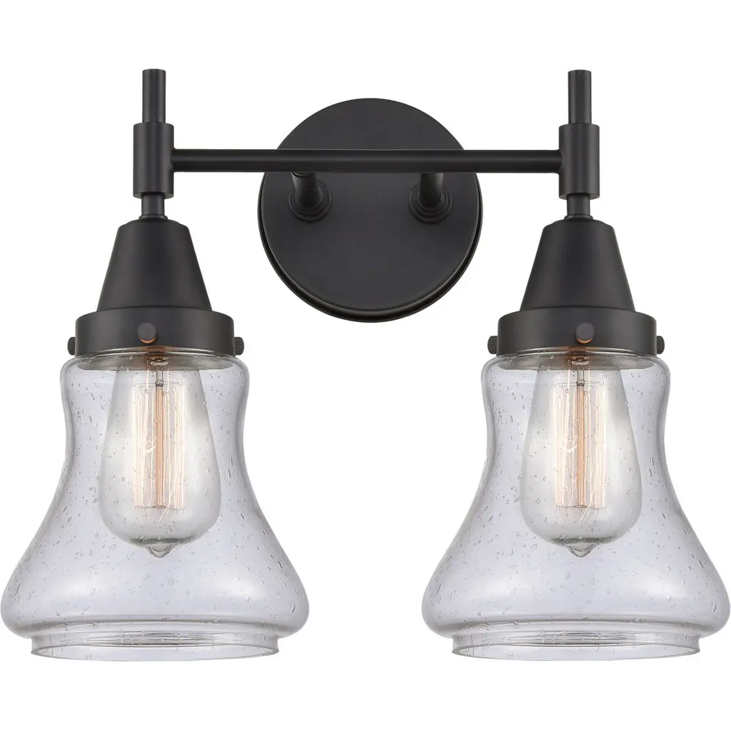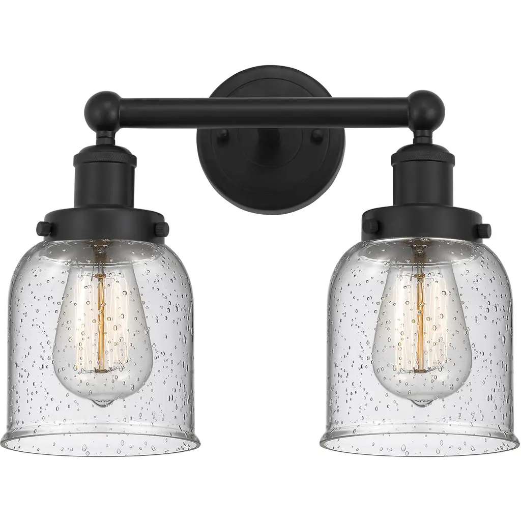 INNOVATIONS 616-2W-OB-G194 Bellmont 2 Light 15.5 inch Bath Vanity Light Oil Rubbed Bronze. Style: Art Nouveau, Industrial, Restoration-Vintage, Transitional . Collection Name: Edison. Metal Finish(Body): Oil Rubbed Bronze. Metal Finish(Canopy/Backplate): Oil Rubbed Bronze. Material: Steel, Cast Brass, Glass. Dimension(in): 11.5(H) x 15.125(W) x 7.5625(Ext). Bulb: (2)60W Medium Base Incandescent(Not Included). Voltage: 120. Dimmable: Yes. Color Temperature (Kelvin): 2200. Color Rendering Index (CRI): 99.9. Lumens: 220. Life Expectancy (Hours): 2000. Glass Shade Description: Seedy Bellmont. Glass Type: Seedy; Ribbed. Shade Shape: Bowl. Glass or Metal Shade Color: Seedy. Shade Material: Glass. Shade Dimension(in): 6.125(W) x 6.25(H). Fitter Measurement (Glass Or Metal Shade Fitter Size): 3.25 inch Fitter. Backplate Dimension(in): 4.5(W) x 0.75(Depth). ADA Compliant: No. California Proposition 65 Warning Required: Yes. UL/ETL Certification Type: Damp Location.