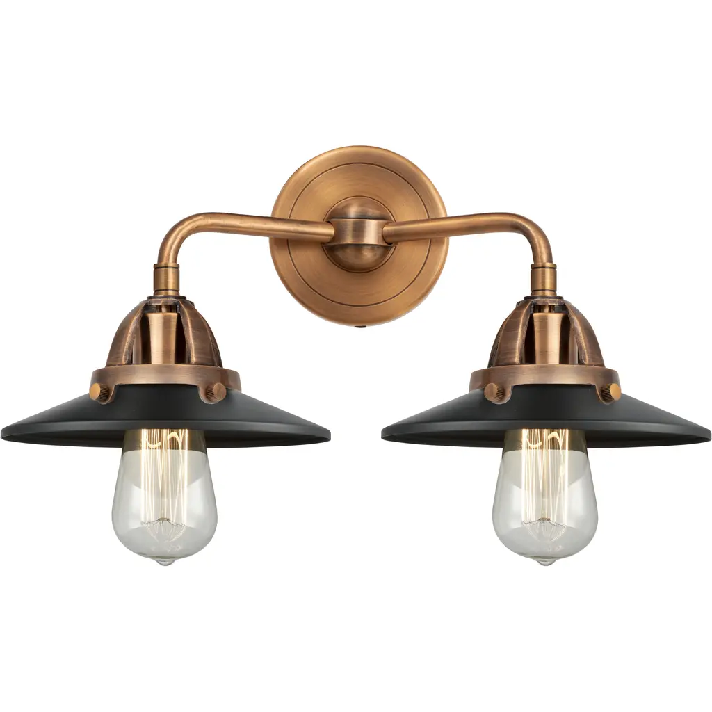 INNOVATIONS 616-2W-OB-M5-OB Railroad 2 Light Bath Vanity Light part of the Franklin Restoration Collection Oil Rubbed Bronze. Style: Traditional, Industrial, Farmhouse, Restoration-Vintage. Collection Name: Franklin Restoration. Metal Finish(Body): Oil Rubbed Bronze. Metal Finish(Shade): Oil Rubbed Bronze. Metal Finish(Canopy/Backplate): Oil Rubbed Bronze. Material: Steel, Cast Brass. Dimension(in): 7.25(H) x 17(W) x 8.5(Ext). Bulb: (2)60W Medium Base Incandescent(Not Included). Voltage: 120. Dimmable: Yes. Color Temperature (Kelvin): 2200. Color Rendering Index (CRI): 99.9. Lumens: 220. Life Expectancy (Hours): 2000. Shade Shape: Cone. Glass or Metal Shade Color: Oil Rubbed Bronze. Shade Material: Metal. Metal Shade Description: Oil Rubbed Bronze Railroad. Shade Dimension(in): 8(W) x 2(H). Fitter Measurement (Glass Or Metal Shade Fitter Size): 3.25 inch Fitter. Canopy Dimension(in): 4.5(Dia). Backplate Dimension(in): 4.5(Dia) x 0.75(Depth). ADA Compliant: No. California Proposition 65 Warning Required: Yes. UL/ETL Certification Type: Damp Location.