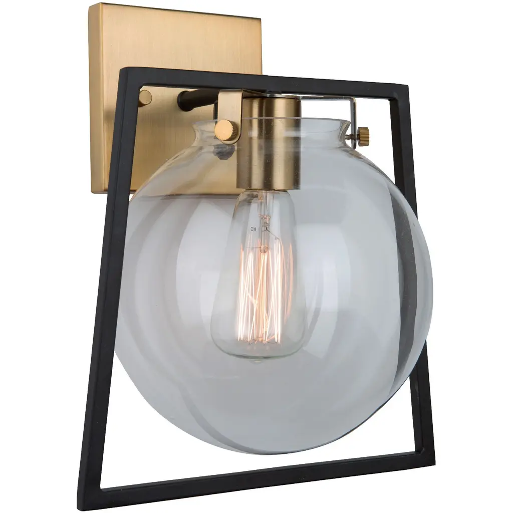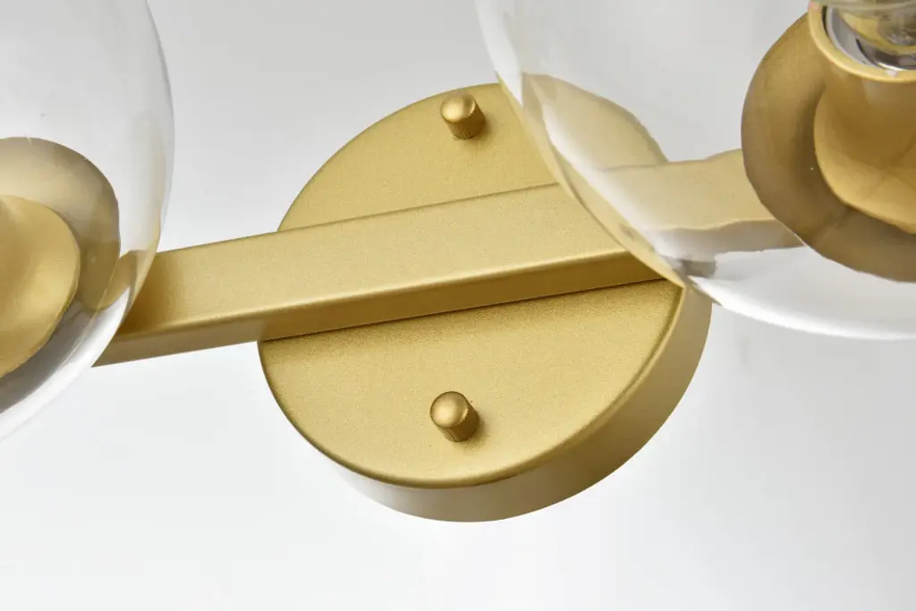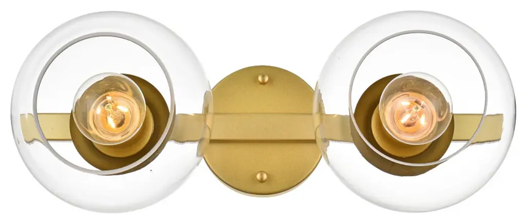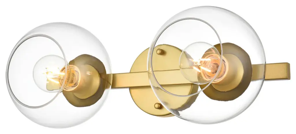 Turn up the brightness in your bathroom with this modern vanity light. This iron fixture features a streamlined silhouette and a smooth finish for a mid-century modern look. The circular backplate connects to one sleek arm design. The arm holds clear glass globe shades that accommodate medium-base bulb up to 40W, which are not included.illuminated by 2 E26 bulbs, light bulbs not includedcrafted with Iron and Glassbackplate measures 4.7 inches wide x 4.7 inches high x 1 inches deepcan be installed as an uplight or downlightdimmable, compatible with a dimmer switch (not provided)hardwired, professional installation recommendedClear glass shade filter light from the straight metal armed sconce