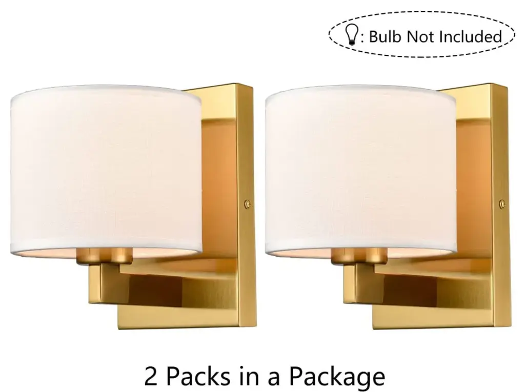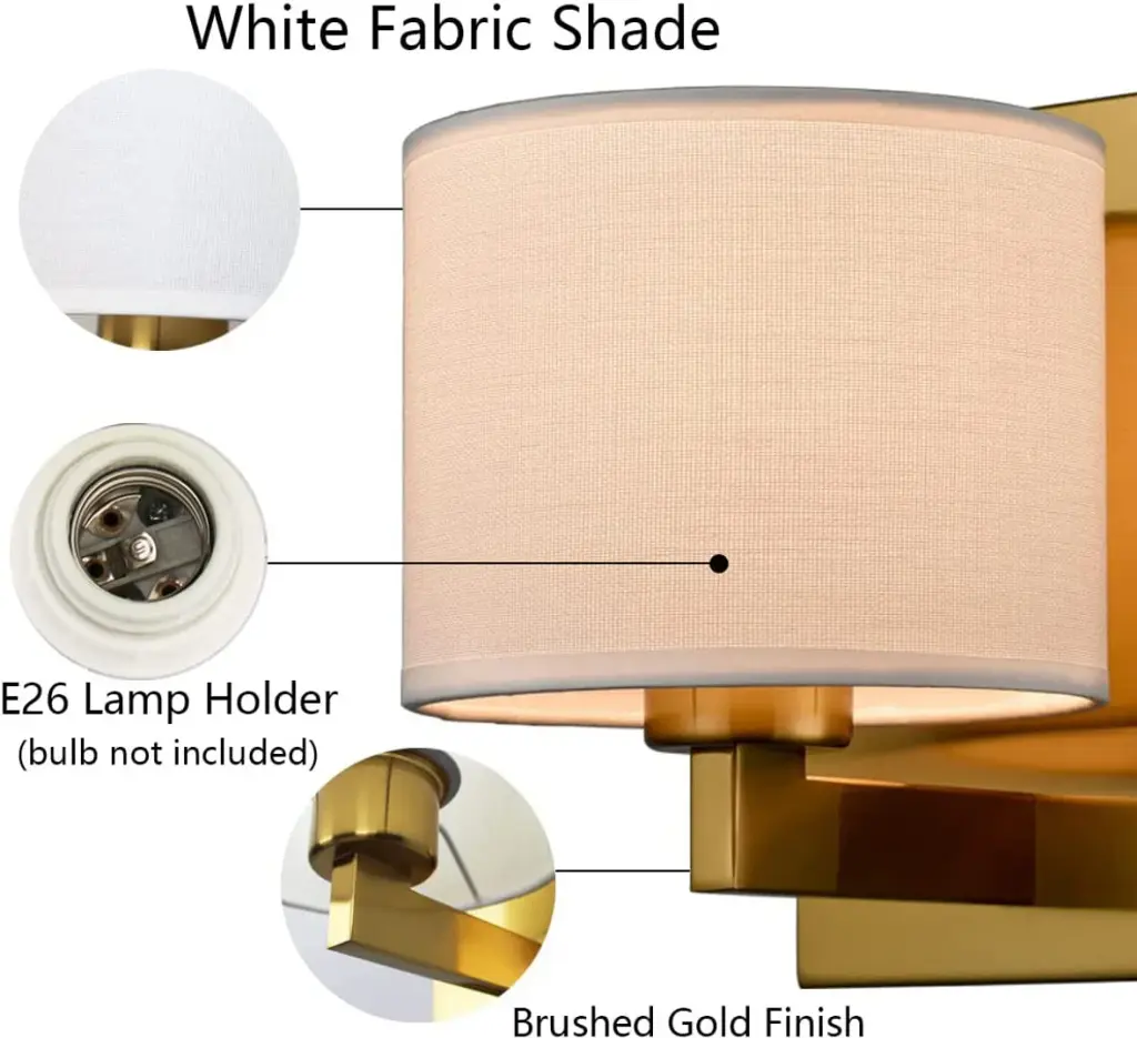 Modern Gold Wall Sconce: This wall sconce consists of rectangle metal backplate of brass finish and a drum shape white fabric lamp shade, adding a modern statement to your interior. And the E26 lamp holder is ceramic glazed design, high quality and durable.Gold Sconce Overall Dimension: 5.9" W x 7.9" H x 5.3" Distance away from the wall, drum-shape fabric lampshade size: 5.9" W x 4.7" H, metal back plate size: 4.9" W x 7.9" H.Bulb Requirement: This gold wall sconce is compatible with one 40 watts E26 standarded based bulb (Bulb Not Included), 2 wall lamps in a package.Wide Application: With minimalist design, the drum shade wall sconce can be used for gracing your bedroom, living room, entryway, bedside, hallway, corridor and more places indoor.Easy to Install: Our wall sconces include all mounting hardware and step-by-step installing instructions in the package for making it install quickly and easily.Technical DetailsColor: BrassMaterial: Metal, FabricStyle: Modern/Mid-CenturyLight fixture: form SconceRoom Type: Bedroom, Living Room, Dining Room, Kitchen, Entryway, Hallway, etcSpecific Uses: Indoor useIndoor/Outdoor: Usage IndoorPower Source: ACInstallation Type: Semi Flush MountSpecial Feature: Hardwired Wall Lighting Sconce, Dimmable, Gold Wall Sconce with Shade, Drum Shade Wall SconceLight Source: Type LED, Incandescent, CFL, HalogenFinish Type: BrassShade Material: FabricNumber of Light Sources: 1Voltage: 120 VoltsShape: DrumIncluded Components: User Manual, Mounting Hardware, Shade includedLight Direction: UplightItem Weight: 2.2 PoundsWattage: 40 wattsBulb Base: E26Package Dimensions: 13.54 x 9.84 x 7.99 inches