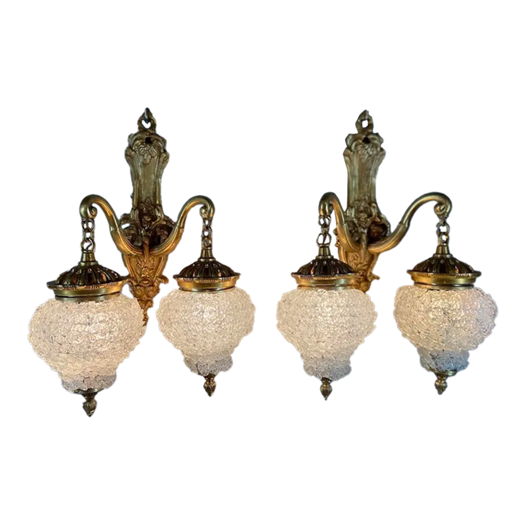 Priced for the pair with 2 pair available.Bronze, Bulbous, Bold, and Old. .The artistic license the designers took during the early part of the 20th century never gets old with us. Here is one such example of their creativity. A marriage of Art Deco and Rococo styles created this wonderful pair of late '20s to early '30s vintage solid bronze wall sconce light fixtures. The bulbous shape of the shade adds to their uniqueness, character, and visual interest.They were made with the best materials of the day for a production item, bronze and custard glass. The patina has taken on the deep amber hue that we love to see on old bronze. The custard glass slip shades are in near mint condition with no noticeable chips or cracks.Measures: Height: 12 1/4 inchesWidth: 7 3/8 inchesProjection: 5 1/4 inchesAs with all of our fixtures they are re-wired to UL standards including code required ground wire, tested, and include mounting hardware so they are ready to install.