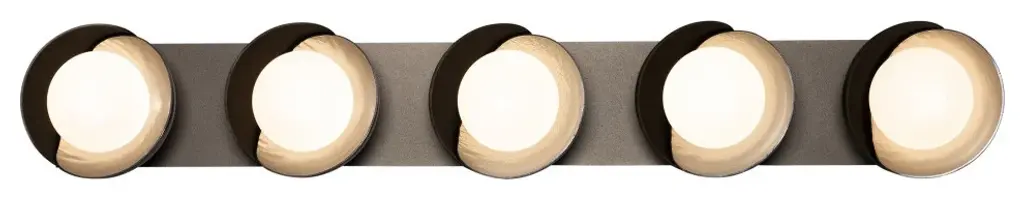 Five light bath vanity light with forged steel shades. Choose a finish for the backplate and inner metal shades and an accent for the outer metal shades. The metal shades may be rotated to alter the look. Suitable for vertical or horizontal installation.Projection Extends : 6.2"Mounting Height Vertical : 19"Mounting Height Horizontal : 19"Backplate Width : 37"Backplate Height : 5"Number Of Bulbs : 5Type Of Bulbs : SocketSocket Type : G9Type Of Bulbs 2 : G-9Max Wattage : 60Bulb Included : No