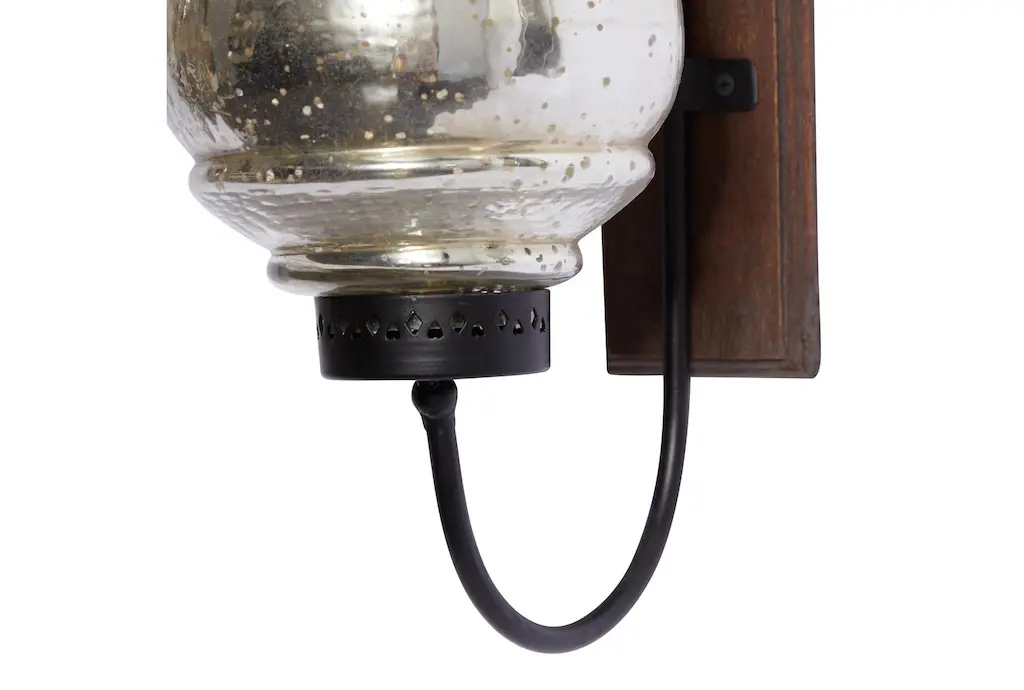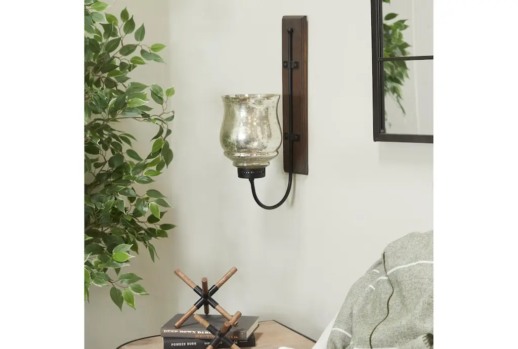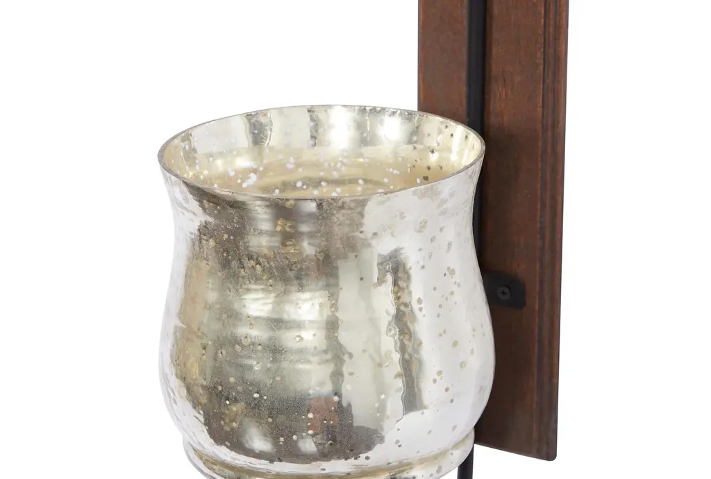 Infuse your space in the romantic candlelight glow that emits from this brown and silver wall sconce for home. This candle wall sconce can accommodate 1 pillar candle. This item ships in 1 carton. Due to the handmade nature of this item, no two will be alike, there will be slight differences in shape, size, and color. Ready to hang by keyhole hardware in back; nails and screws are not included. Suitable for indoor use only. Made in India. Traditional style.