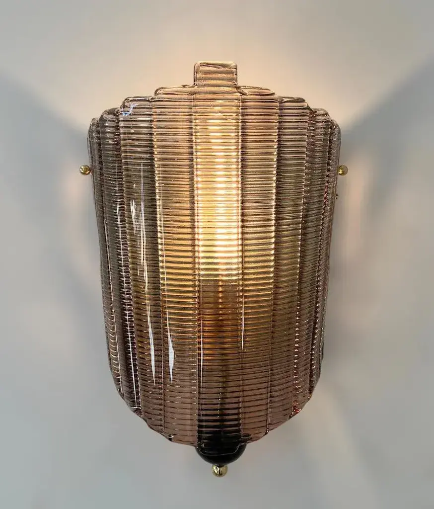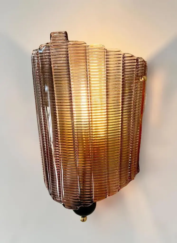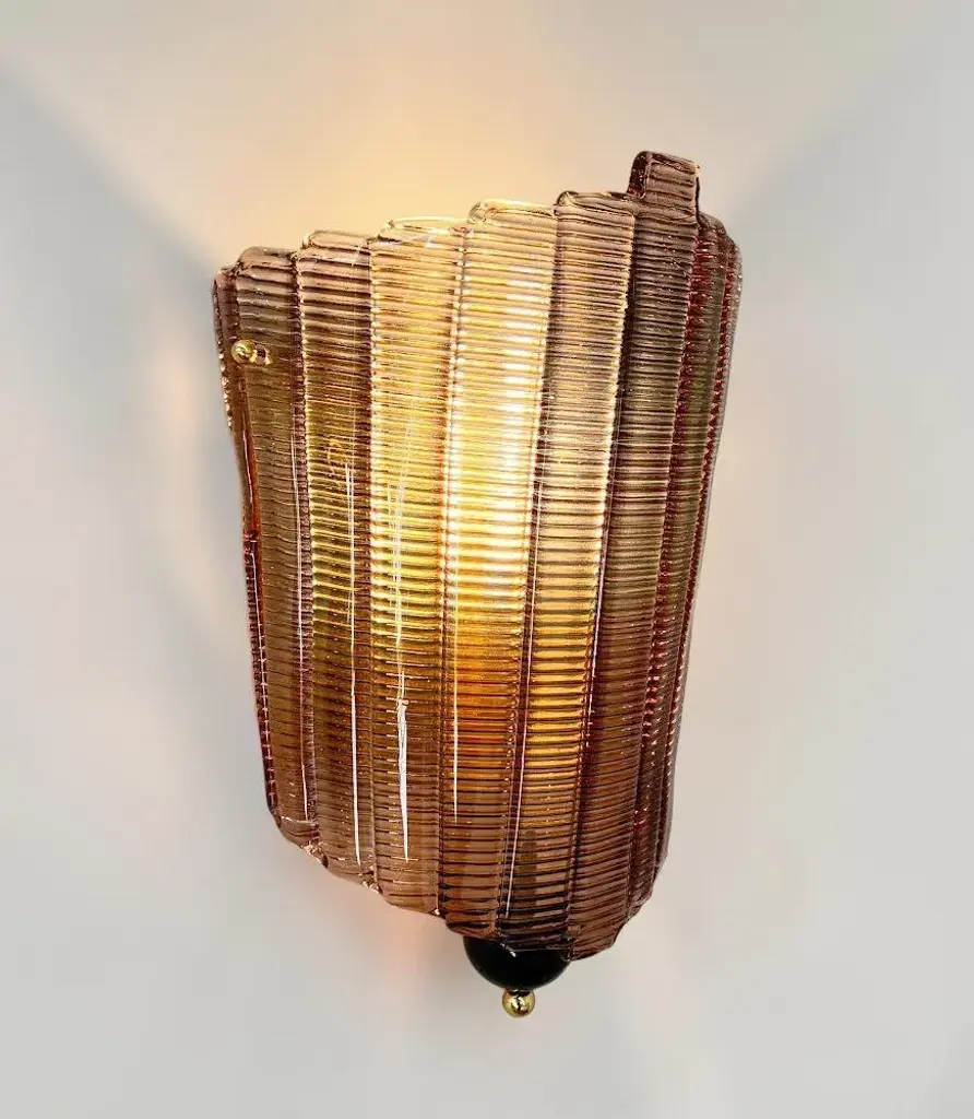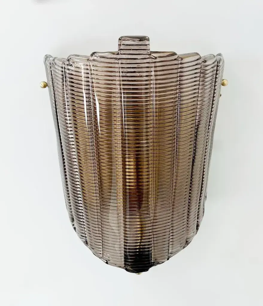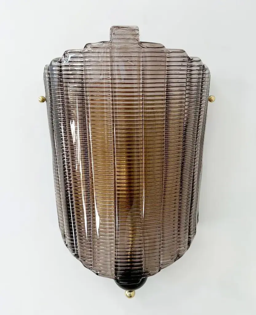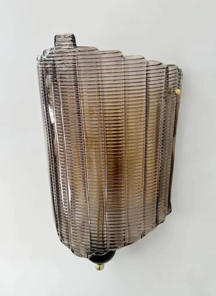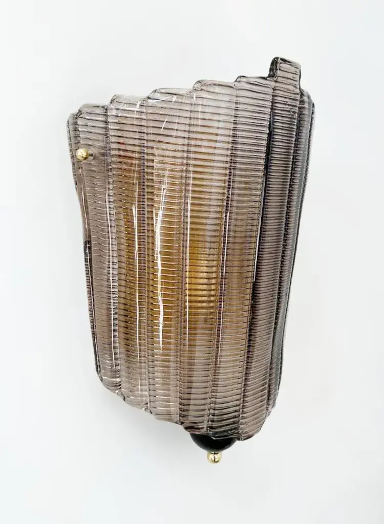 Italian wall light shown with hand blown textured smoky Murano glass, black glass finial, and brass details, designed by Fabio Bergomi for Fabio Ltd / Made in Italy 1 light / E26 or E27 / max 60W