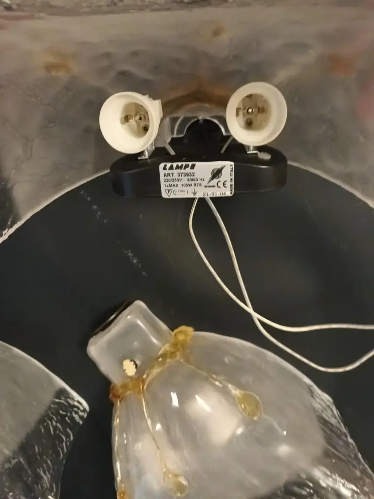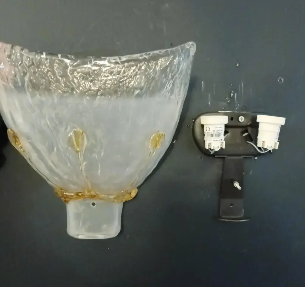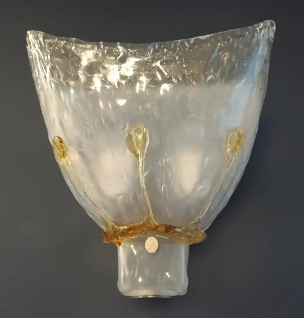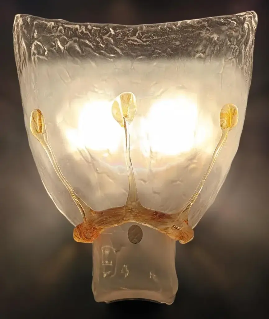 Italian wall light with frosted Murano glass shade decorated with amber details mounted on black metal structure / Made in Italy by Lampe, early 21st Century 2 lights / E26 or E27 type / max 60W each