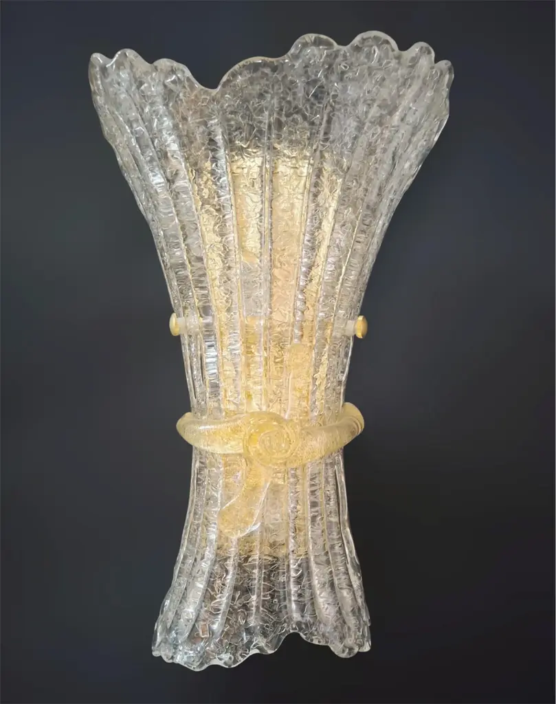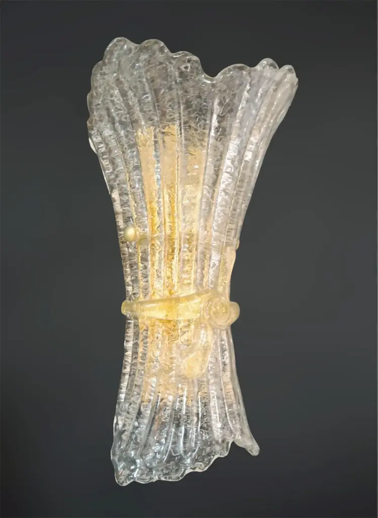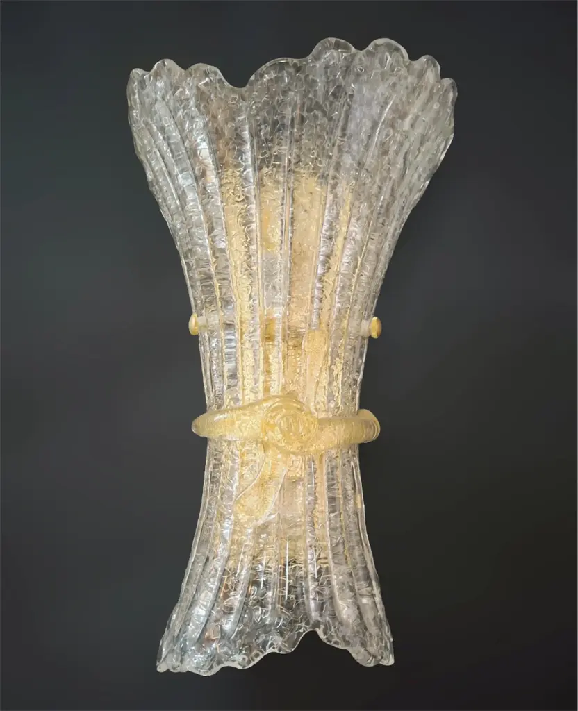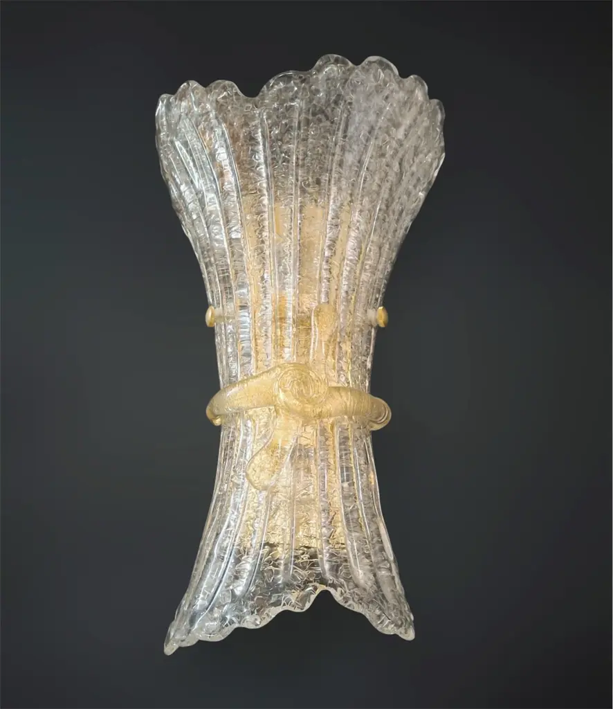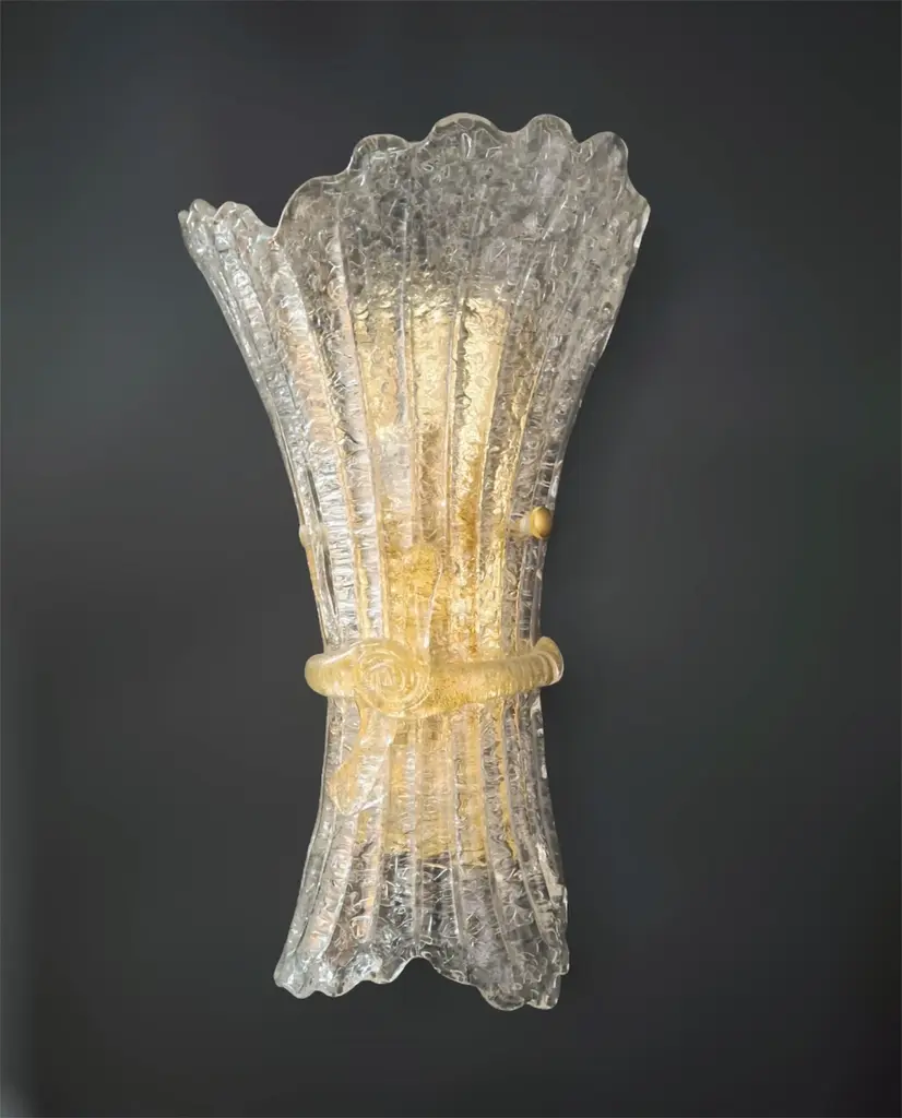 Italian wall light with a clear Murano glass shade hand blown with granular texture using Graniglia technique and amber glass bow, mounted on gold finish metal frame / made in Italy 2 lights / 1 in E12 or E14 type max 40W, 1 in E26 or E27 type max 60W