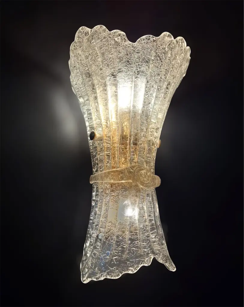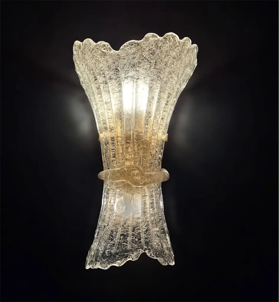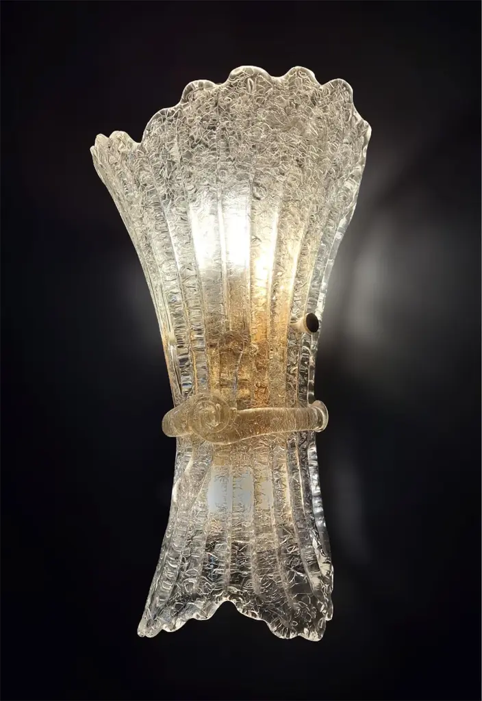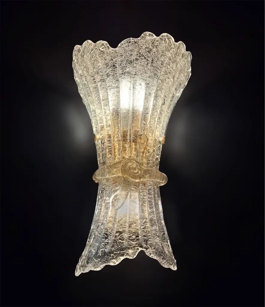 Italian wall light with a clear Murano glass shade hand blown with granular texture using Graniglia technique and amber glass bow, mounted on gold finish metal frame / made in Italy 2 lights / 1 in E12 or E14 type max 40W, 1 in E26 or E27 type max 60W