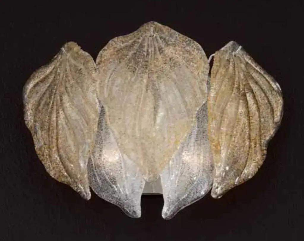 Italian wall light shown with clear and amber Murano glass leaves hand blown in Graniglia technique to produce granular textured effect, mounted on chrome finish metal frame / inspired by Mazzega Made in Italy 2 lights / E12 or E14 type / max 40W each