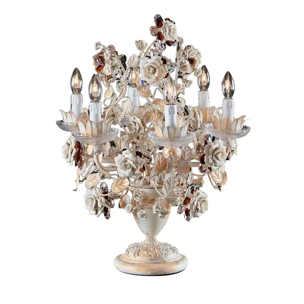 An array of flowers with porcelain and Bohemian crystal petals lends this wall lamp its unmistakable plush allure. Flaunting a sinuous branch-like iron silhouette offered in a stunning finish blending beige and golden shades, it is an exquisite example of the traditional Florentine floral style. A customized version complements an Italian 5-star hotel. It fits three bulbs (E14 or E12 max. 40W each).