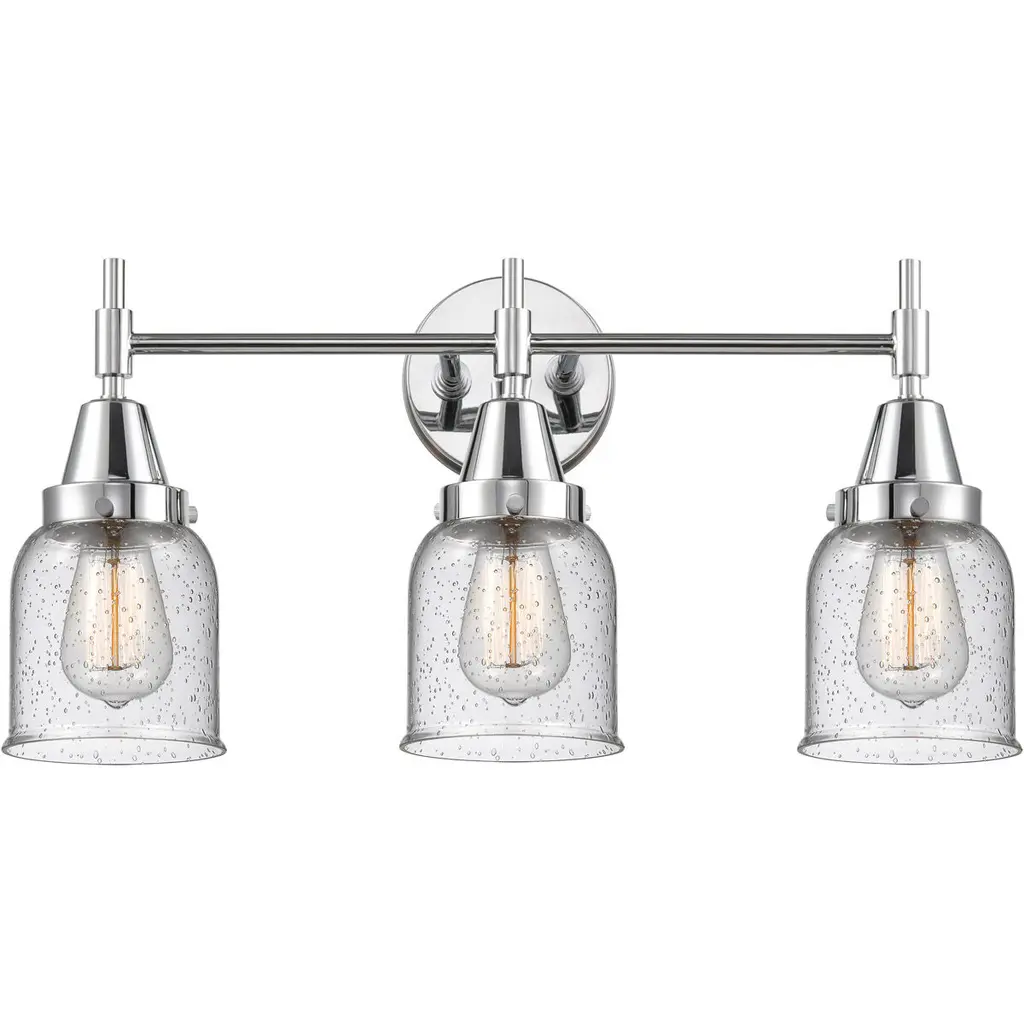 INNOVATIONS 616-3W-PN-G194 Bellmont 3 24.5 inch Bath Vanity Light Polished Nickel. Style: Art Nouveau, Industrial, Restoration-Vintage, Transitional . Collection Name: Edison. Metal Finish(Body): Polished Nickel. Metal Finish(Canopy/Backplate): Polished Nickel. Material: Steel, Cast Brass, Glass. Dimension(in): 11.5(H) x 24.125(W) x 7.5625(Ext). Bulb: (3)60W Medium Base Incandescent(Not Included). Voltage: 120. Dimmable: Yes. Color Temperature (Kelvin): 2200. Color Rendering Index (CRI): 99.9. Lumens: 220. Life Expectancy (Hours): 2000. Glass Shade Description: Seedy Bellmont. Glass Type: Seedy; Ribbed. Shade Shape: Bowl. Glass or Metal Shade Color: Seedy. Shade Material: Glass. Shade Dimension(in): 6.125(W) x 6.25(H). Fitter Measurement (Glass Or Metal Shade Fitter Size): 3.25 inch Fitter. Backplate Dimension(in): 4.5(W) x 0.75(Depth). ADA Compliant: No. California Proposition 65 Warning Required: Yes. UL/ETL Certification Type: Damp Location.