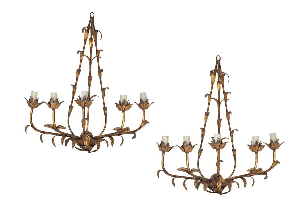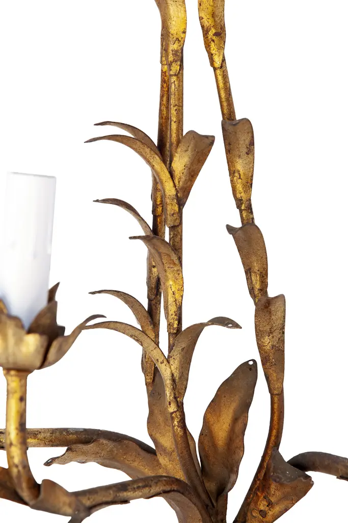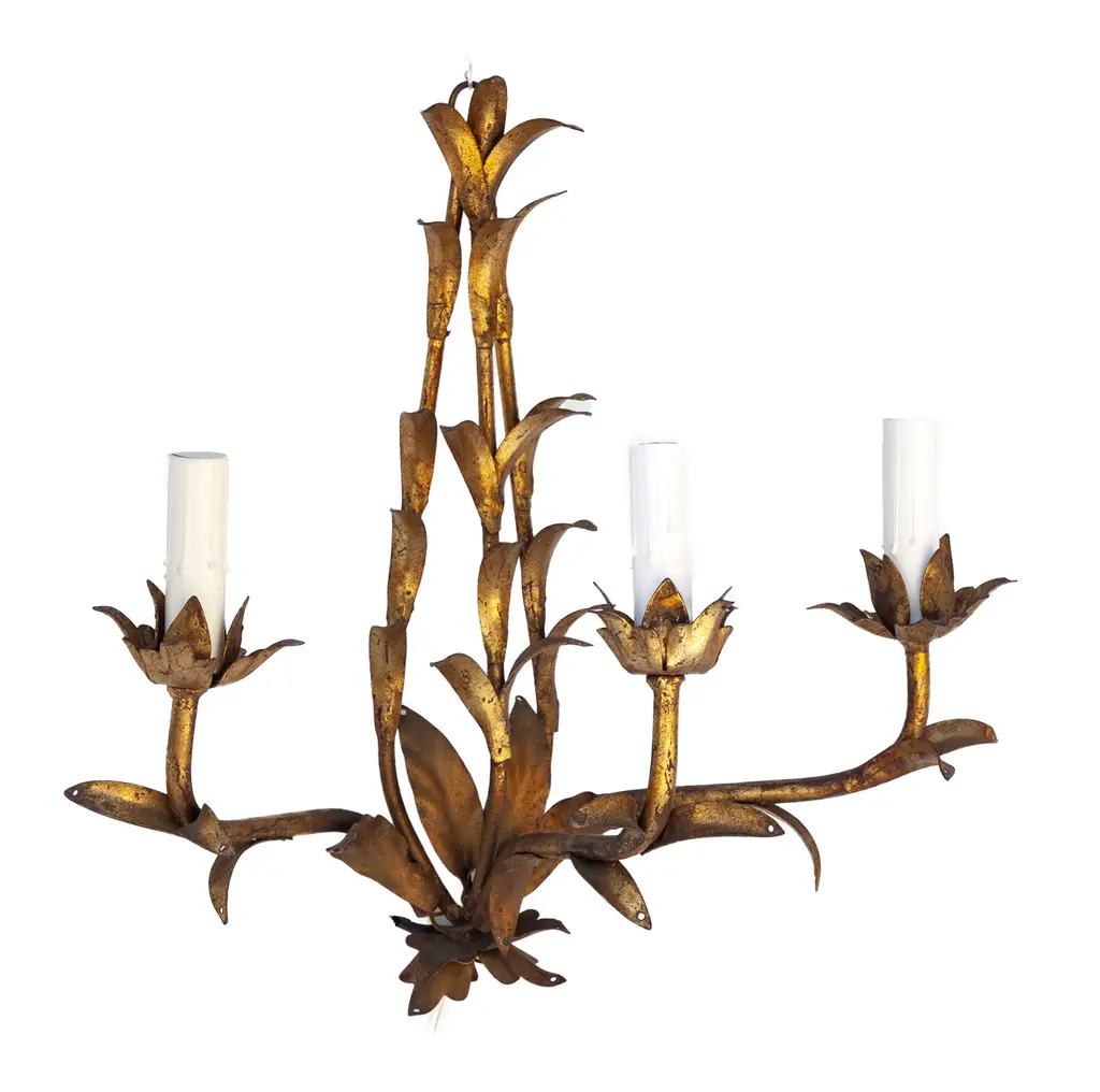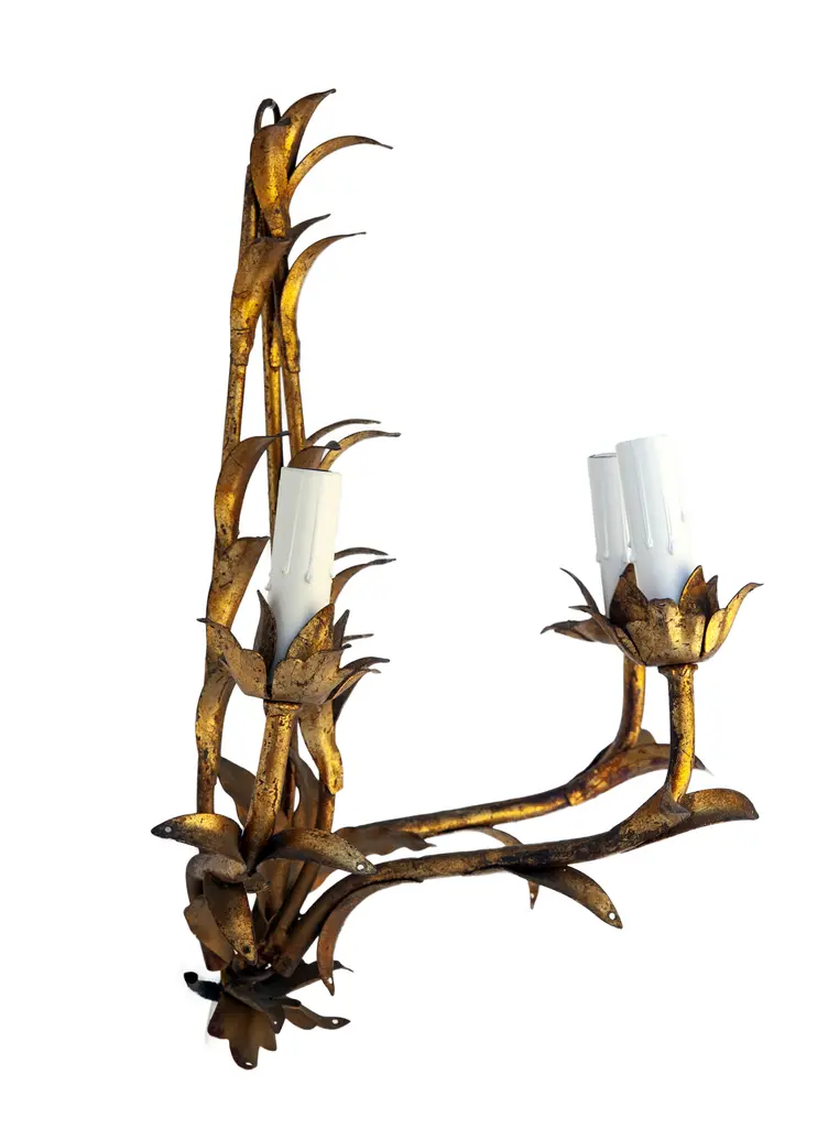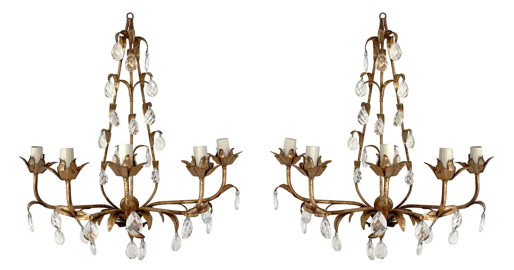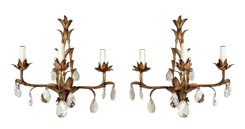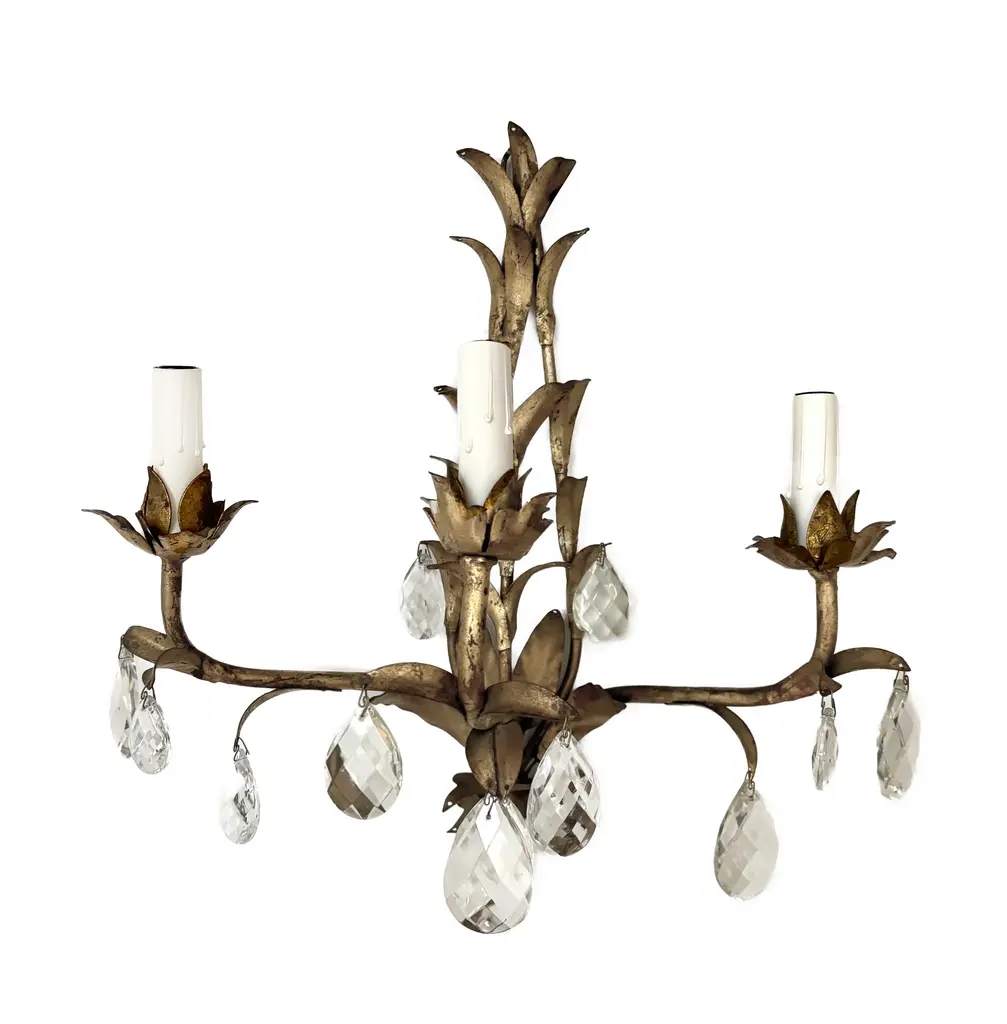 Stunning pair of mid-century gilt Italian tole wall sconces in the Hollywood Regency style. Each sconce has three lights & is embellished with crystals. The teardrop crystals are optional. Rewired & can be hardwired or they can be plugged into an outlet.